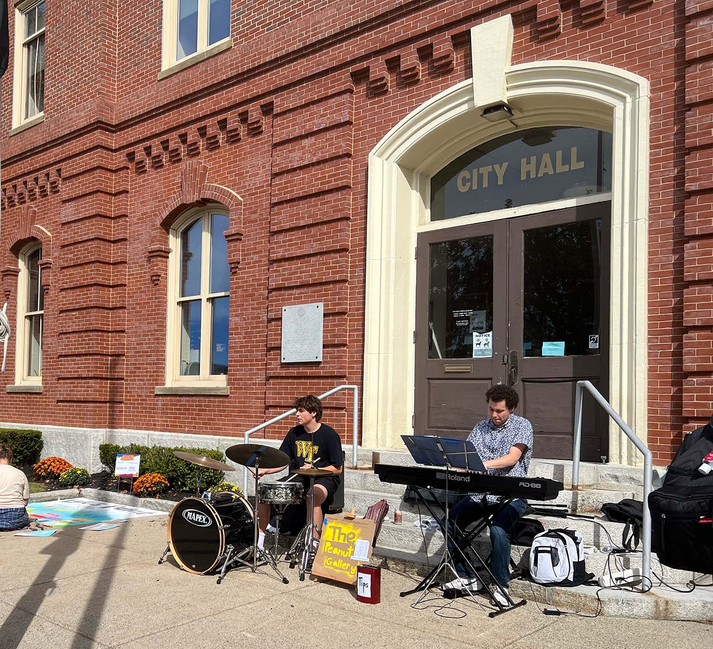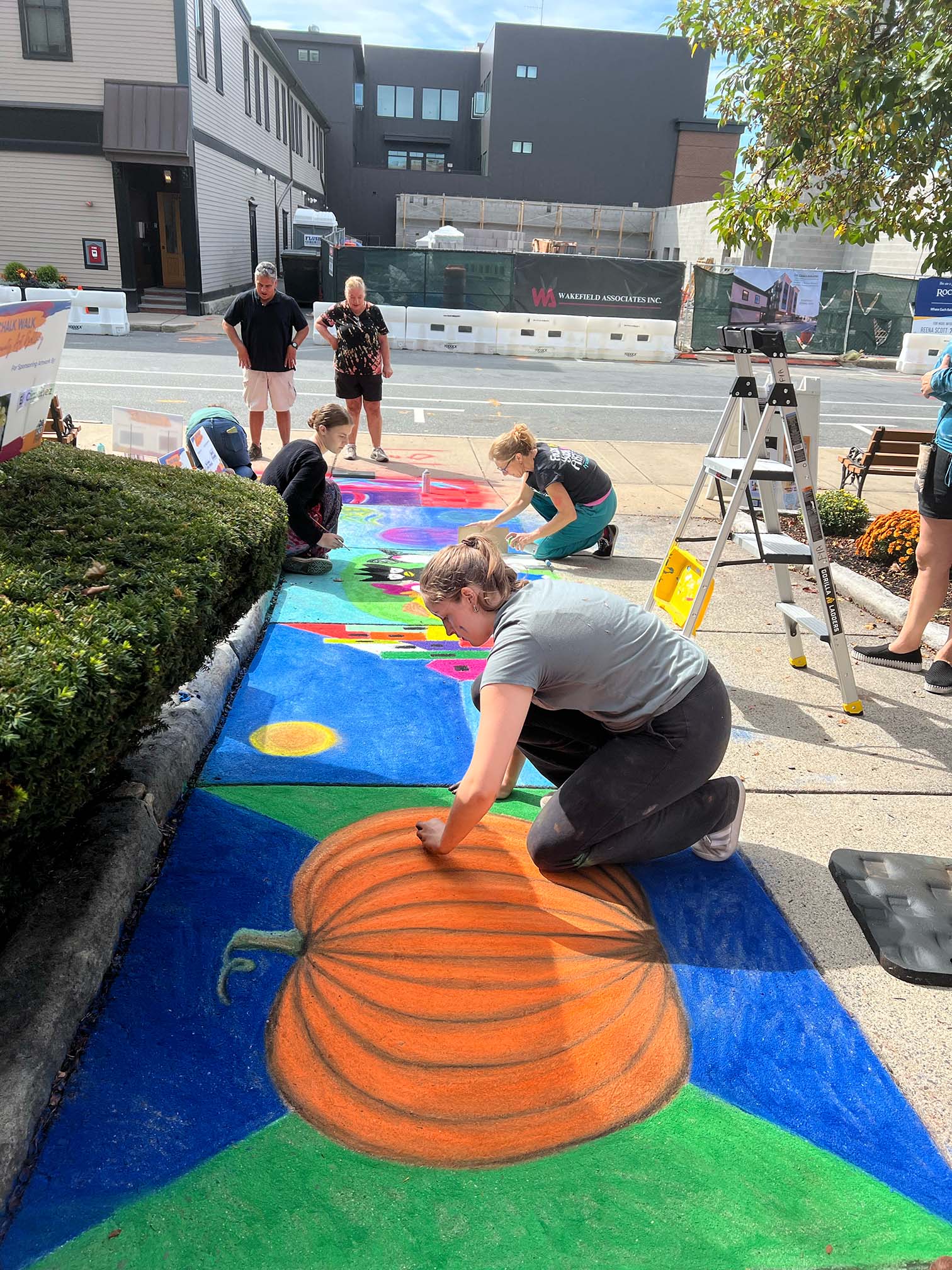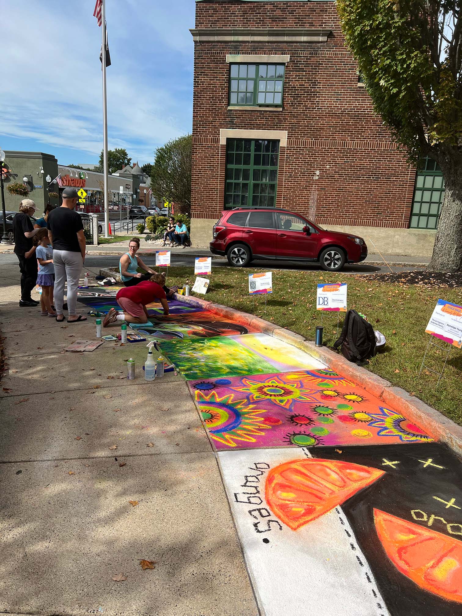 At City Hall, sponsored artists created squares for sponsoring families and individuals as well as local businesses and community organizations. Some had themes that reflected their sponsors - the front of the Melrose Oriental Rug store, for example, for the leading sponsor, and a pumpkin for the Food Drive - while others depicted scenes from the artists' imaginations. There was live music and viewers enjoyed getting to watch the artists at work as they used spray chalk and oil pastels to create their squares.
