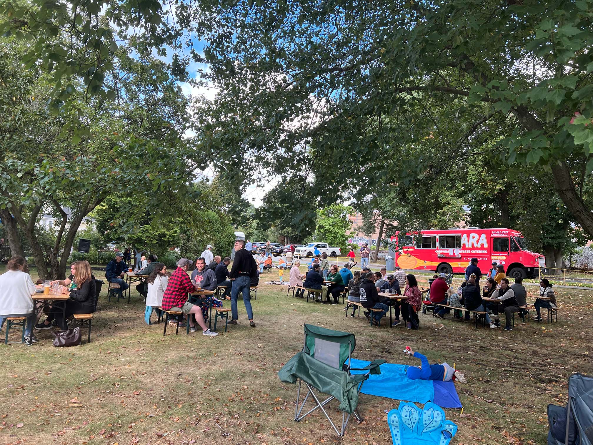 Saturday’s rain gave way to perfect autumn weather on Sunday, clear and slightly cool. In many neighborhoods, Porchfest performances formed part of a block party with closed-off streets, lemonade stands, and even grills, Italian ice, and food trucks at some porches. Idle Hands Brewery held Oktoberfest at the Beebe Estate on Sunday afternoon, bringing people out to enjoy beer, the La Qchara food truck, and music there as well.