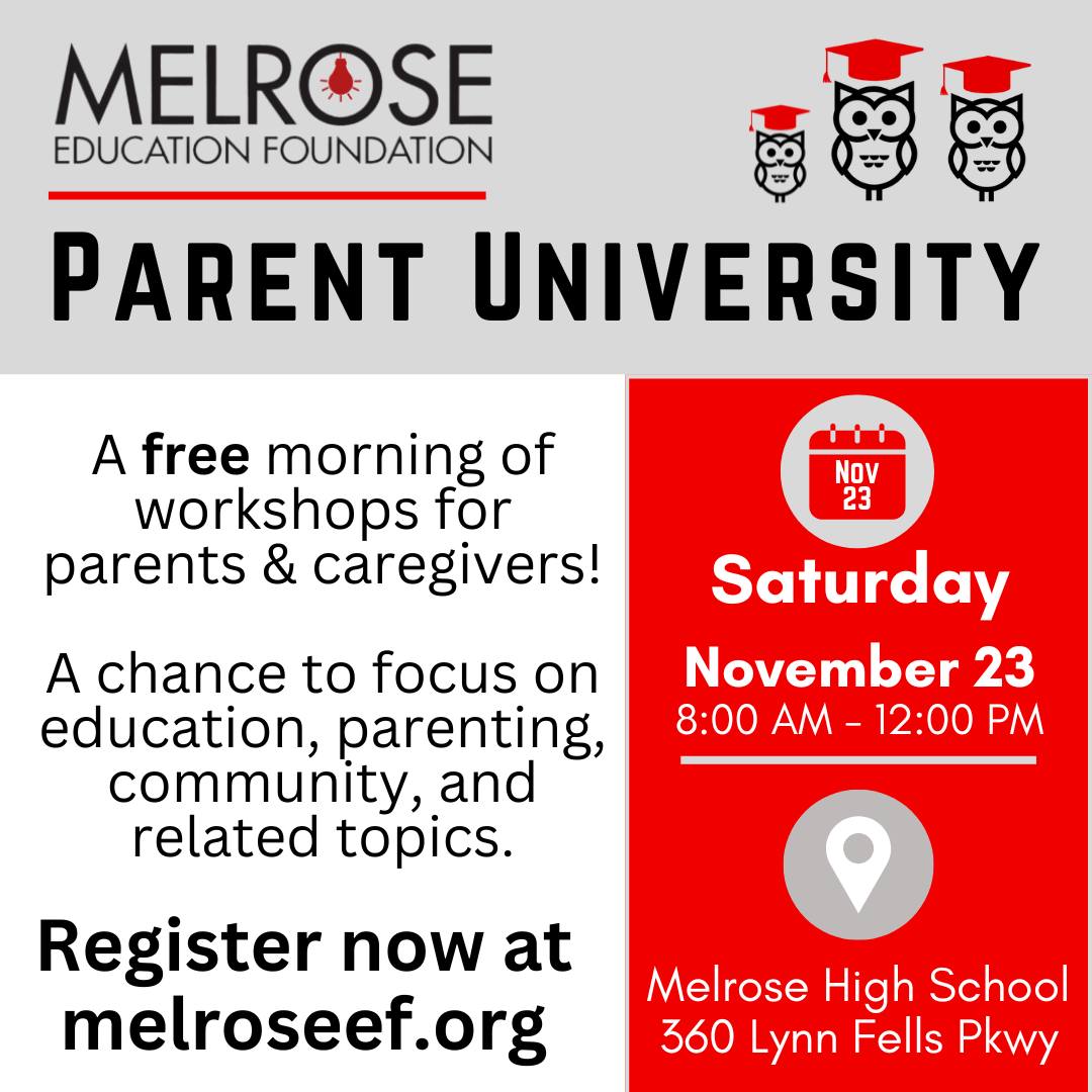 On Saturday, November 23rd between 8am and noon, all Melrose caregivers and community members are invited to Parent University, a free event sponsored by the Melrose Education Foundation. This popular event is now in its 9th year, with some workshops returning from previous years, and others new this year.