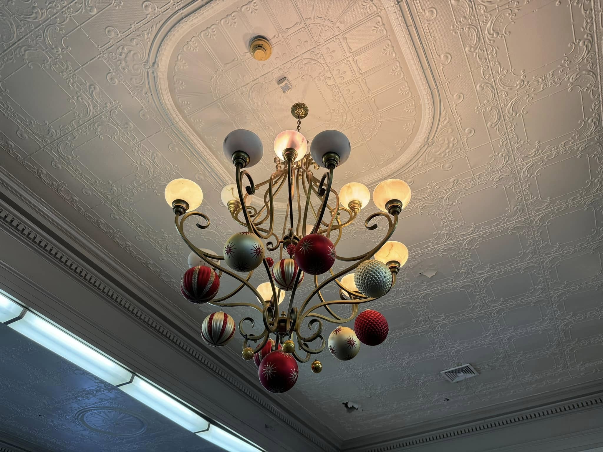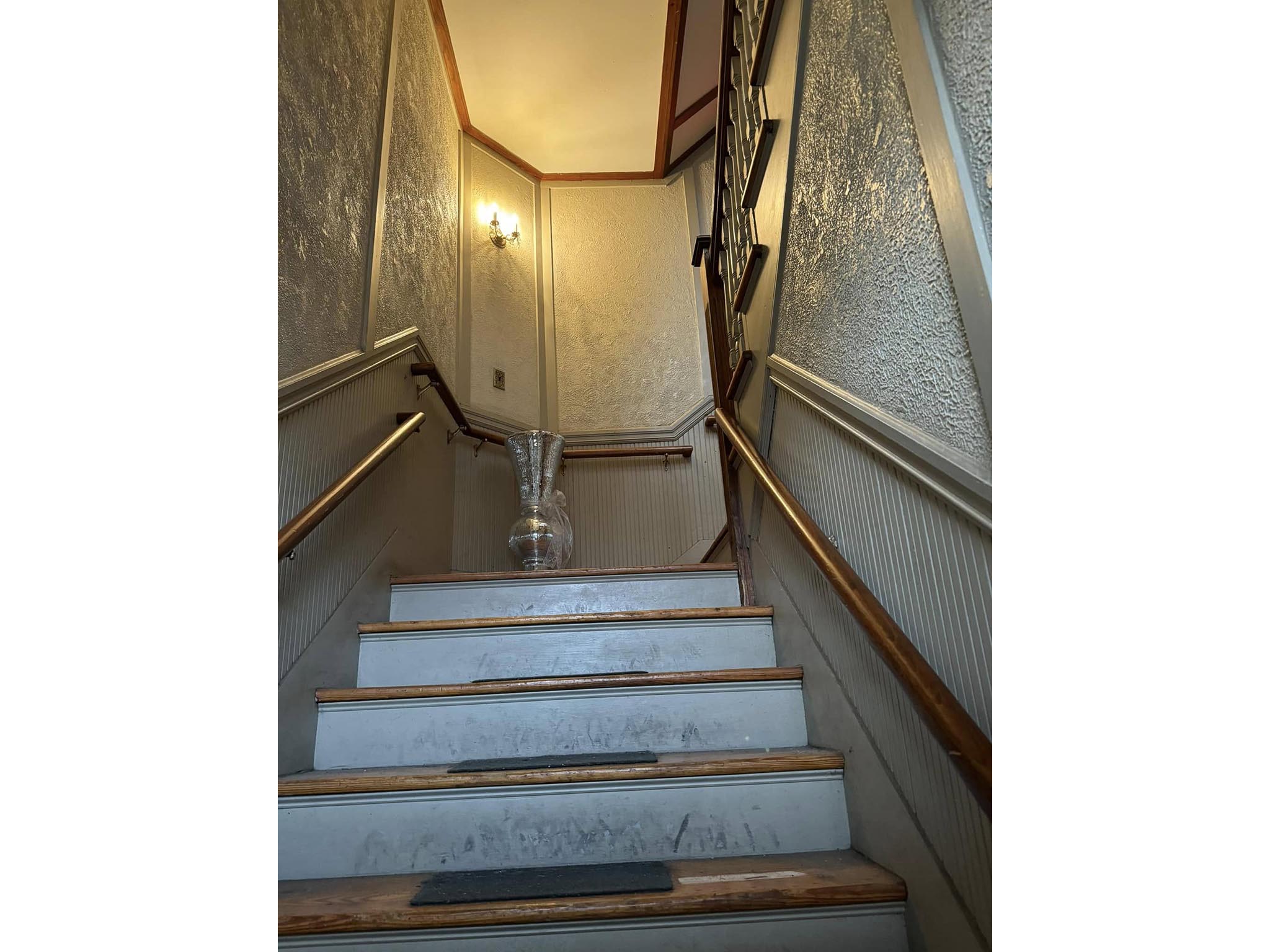 The colonial-style building is over a century old, built in 1896. The second floor holds a remarkable space. The Hall has an ornately decorated tin ceiling and walls, stunning windows, and ornate wood-carved features.