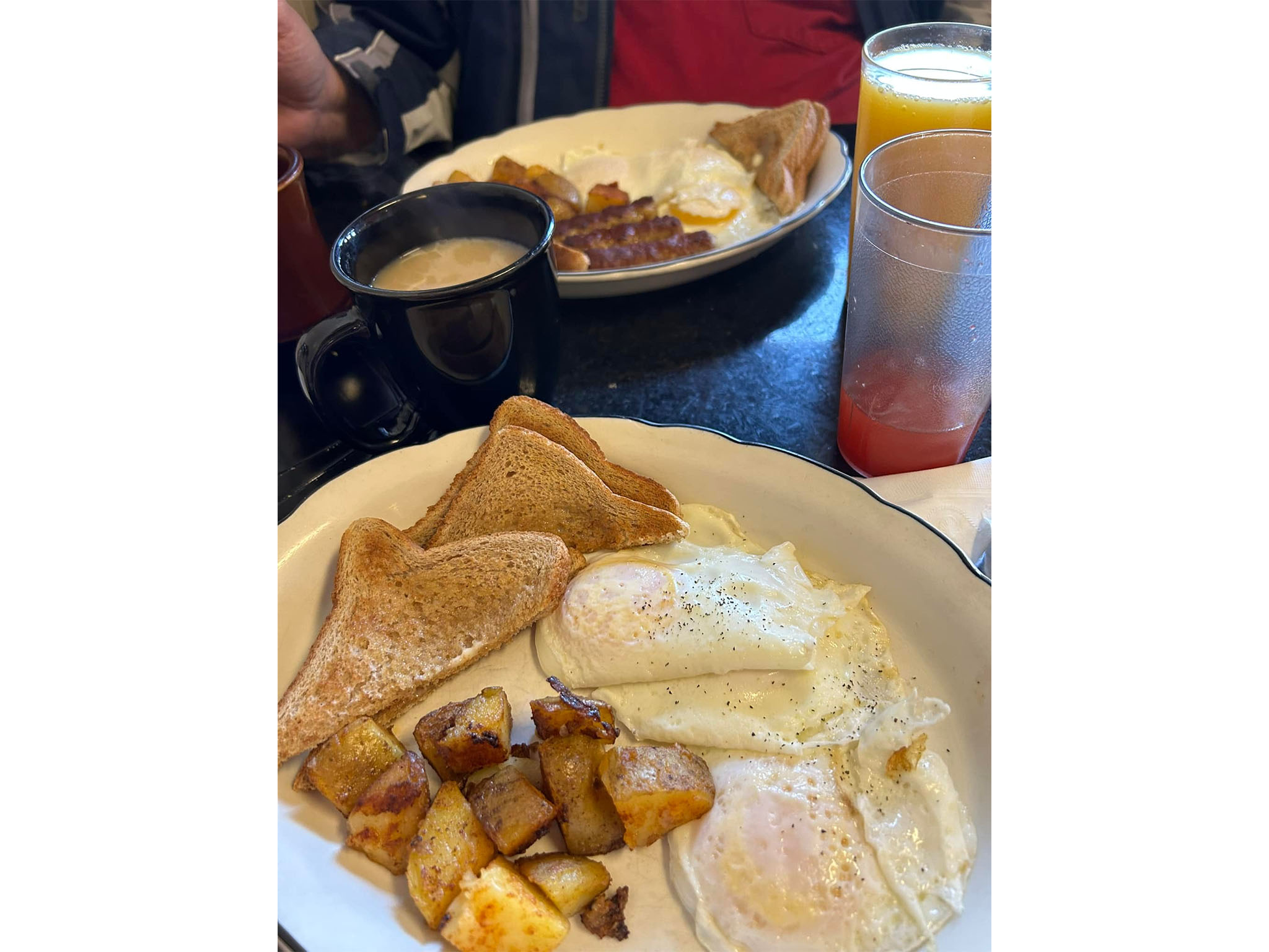 Today just eggs over easy but we have happily consumed omelets, homemade turkey meatball soup, the turkey gobbler with amazing stuffing. My husband said the cheeseburger club was the best he has had.