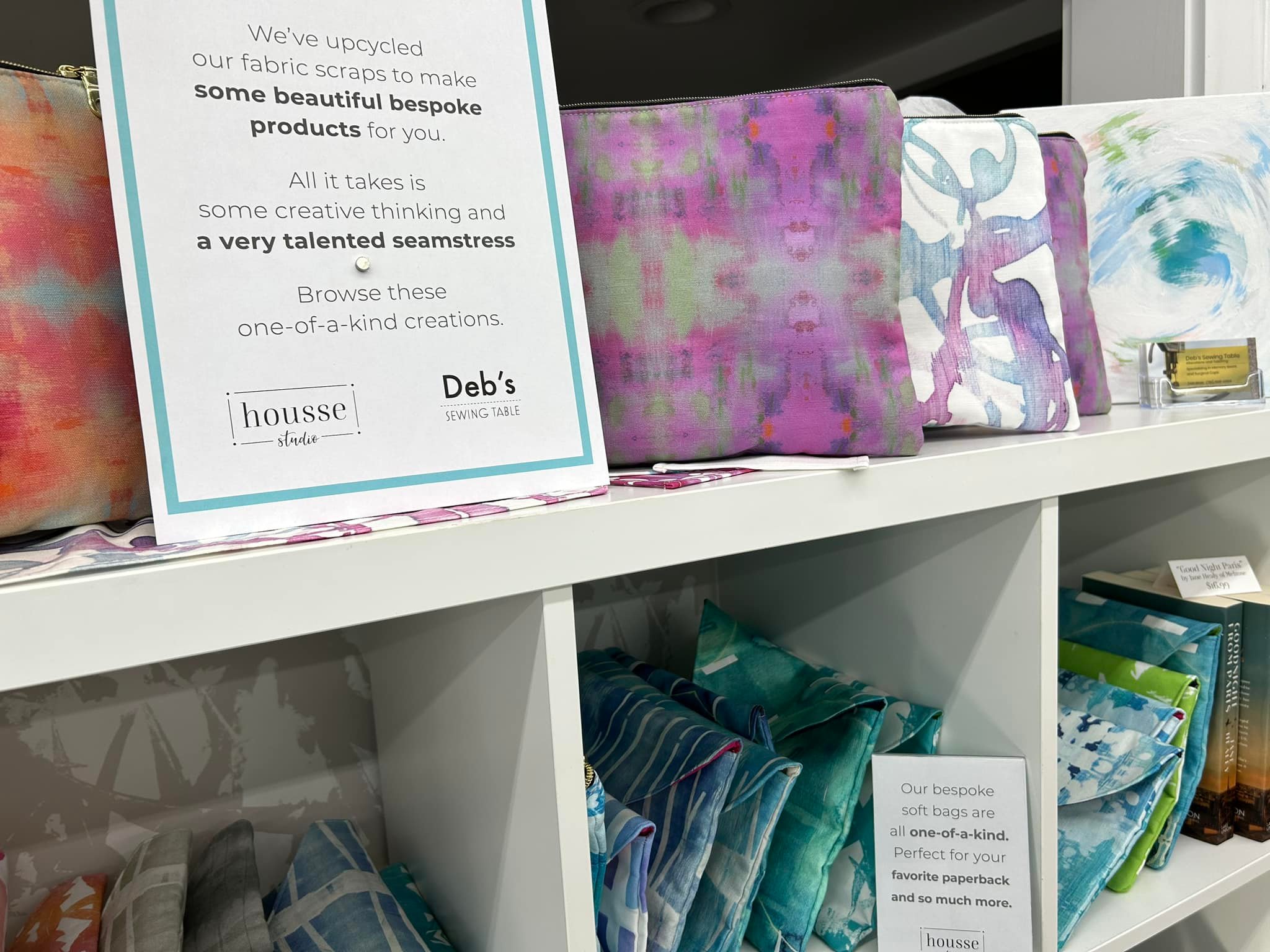 The fabrics she designs are used by customers and interior designers for drapes and upholstery. Her coworker, Deb Walz of Deb’s Sewing Table is in the back corner using the fabric to create beautiful bags, tea towels, wallets, and more. The items in the store are exceptionally well curated and have a range of price points.