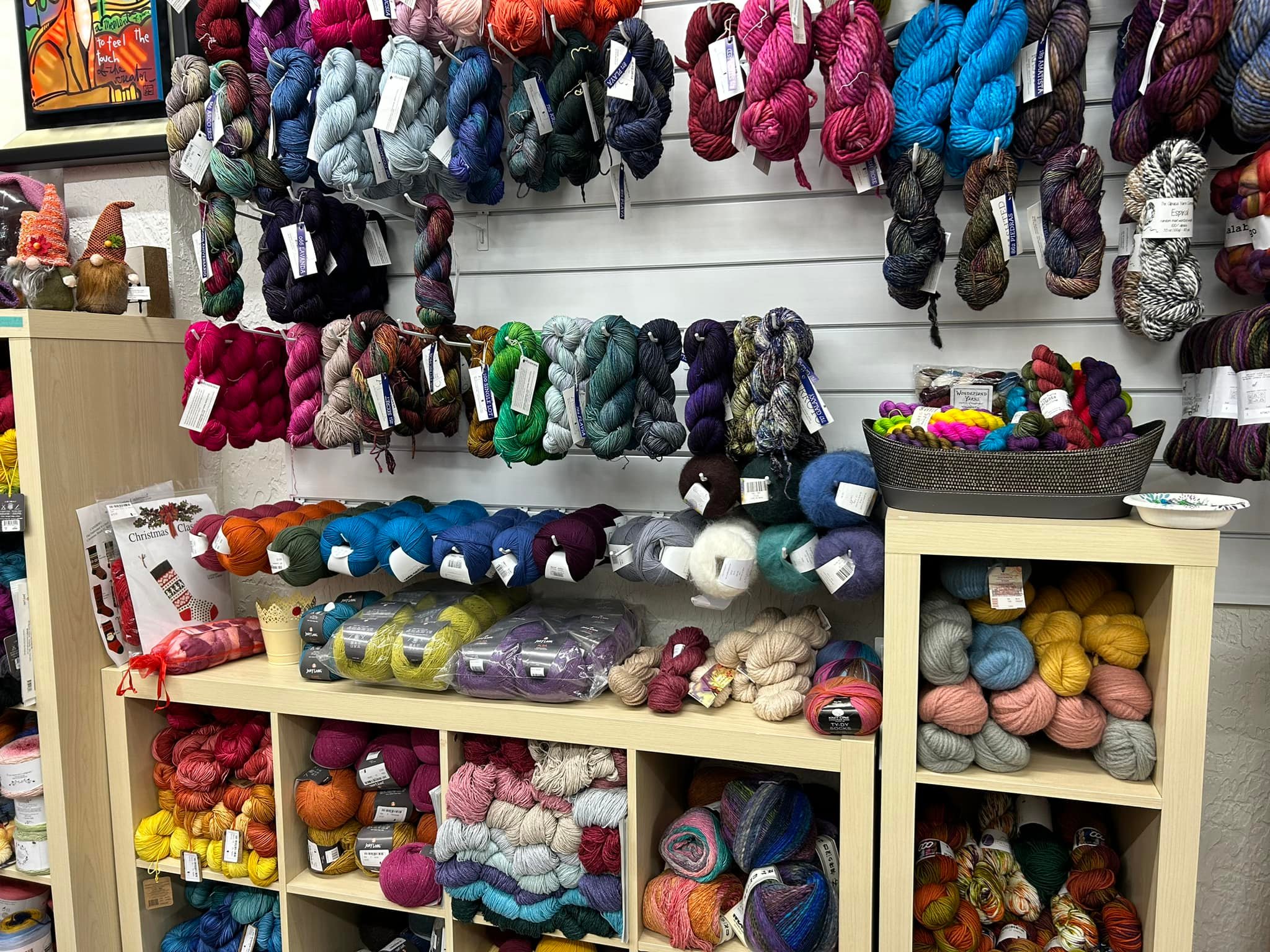 The yarn shop is full of the softest yarns in a rainbow of colors. Available for sale are crochet hooks, knitting needles, buttons, a bargain bin, and more.