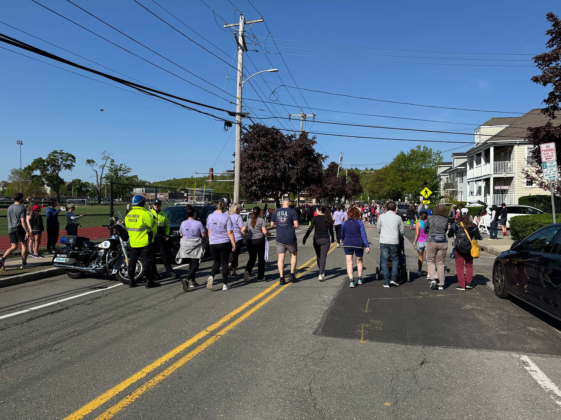 Runners and walkers move to the starting line as the Melrose Police escort prepares