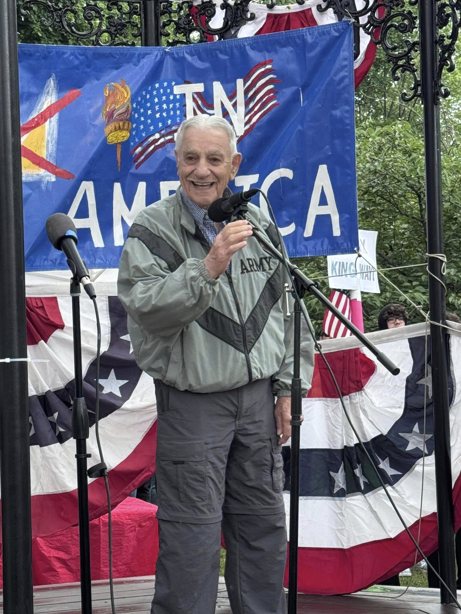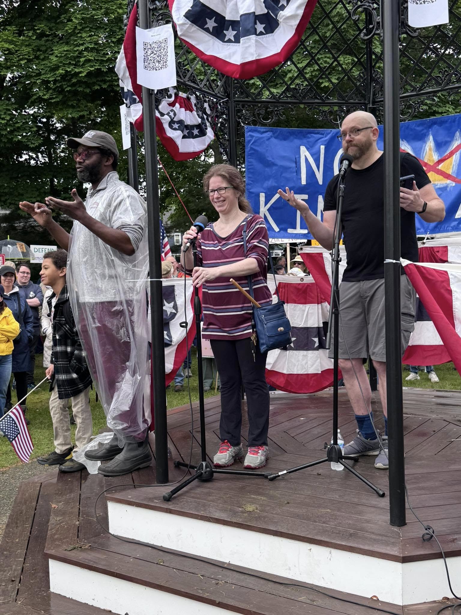 The next speaker was Sam Stella, a veteran from Wakefield, who drew a parallel between the current administration and totalitarian regimes in countries like Russia. “That can happen here in a heartbeat,” he said. “If we don’t speak up,” he went on, “we’re going to lose our rights.”
