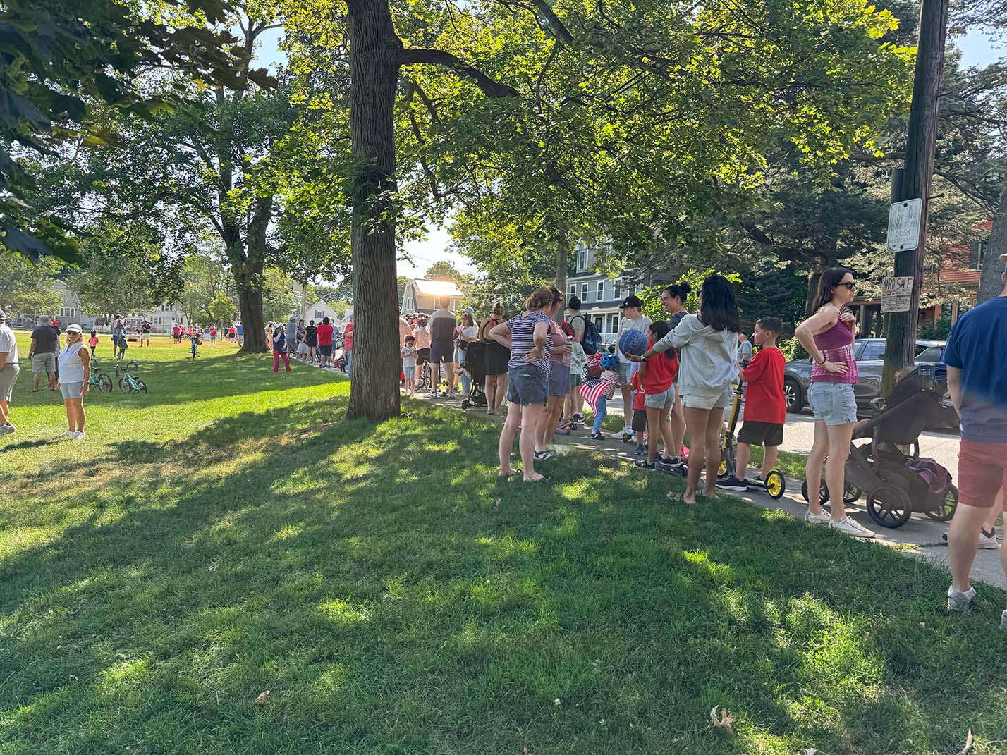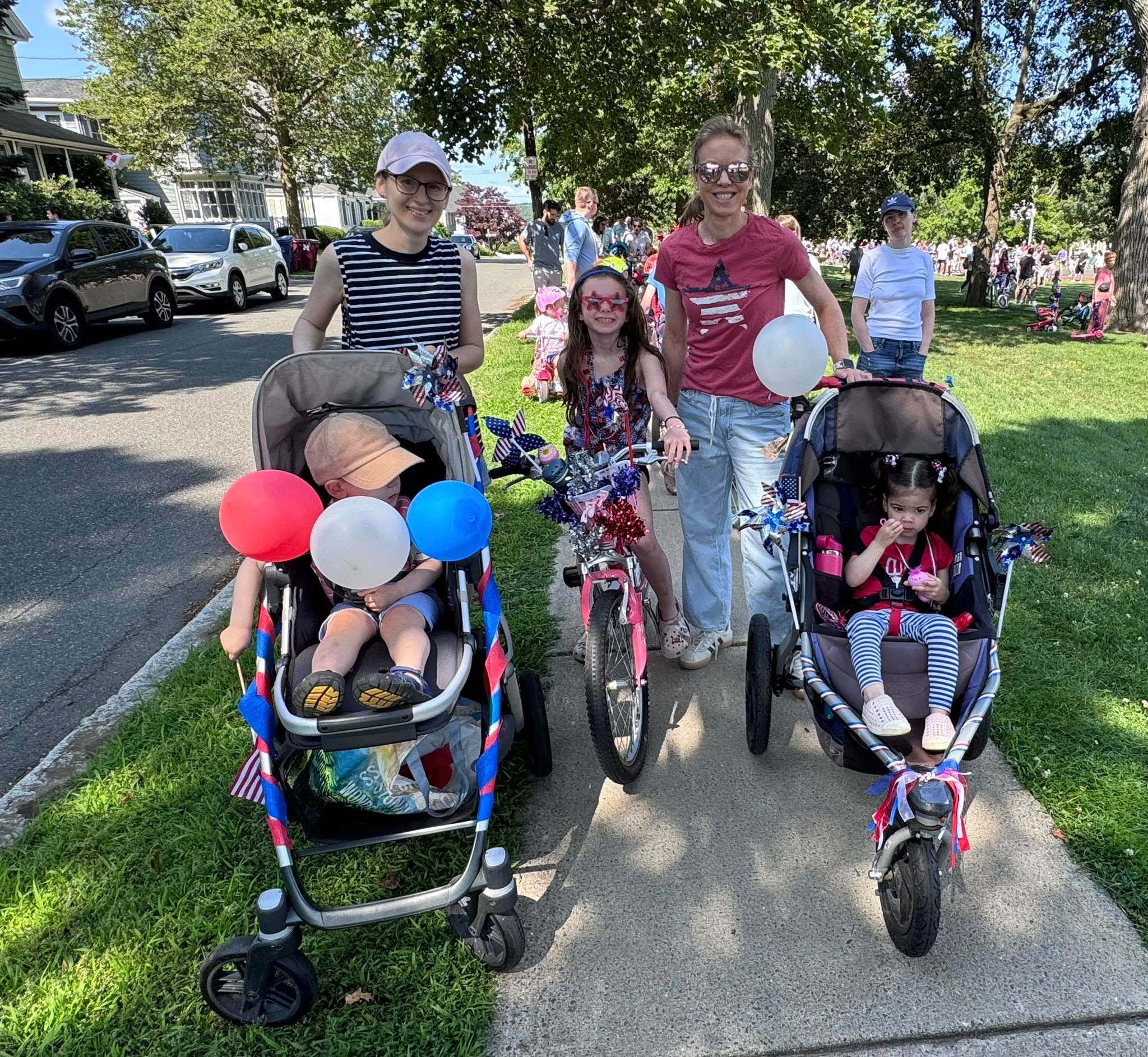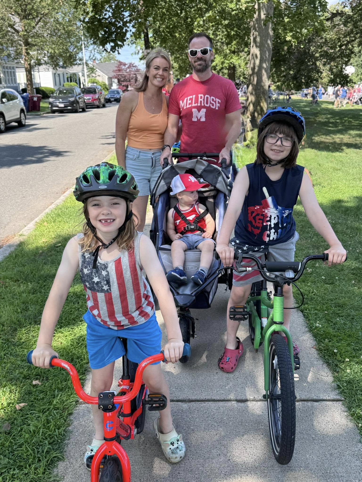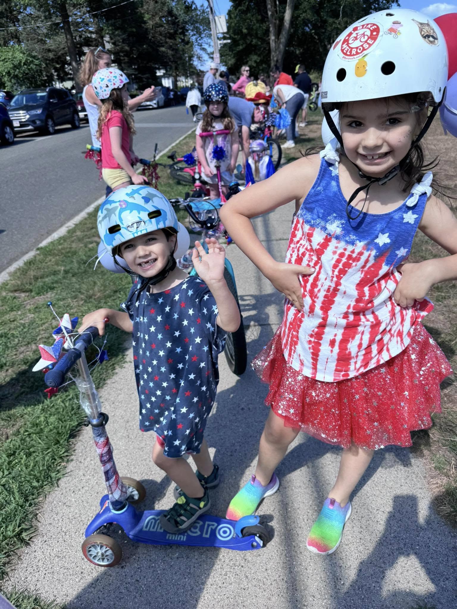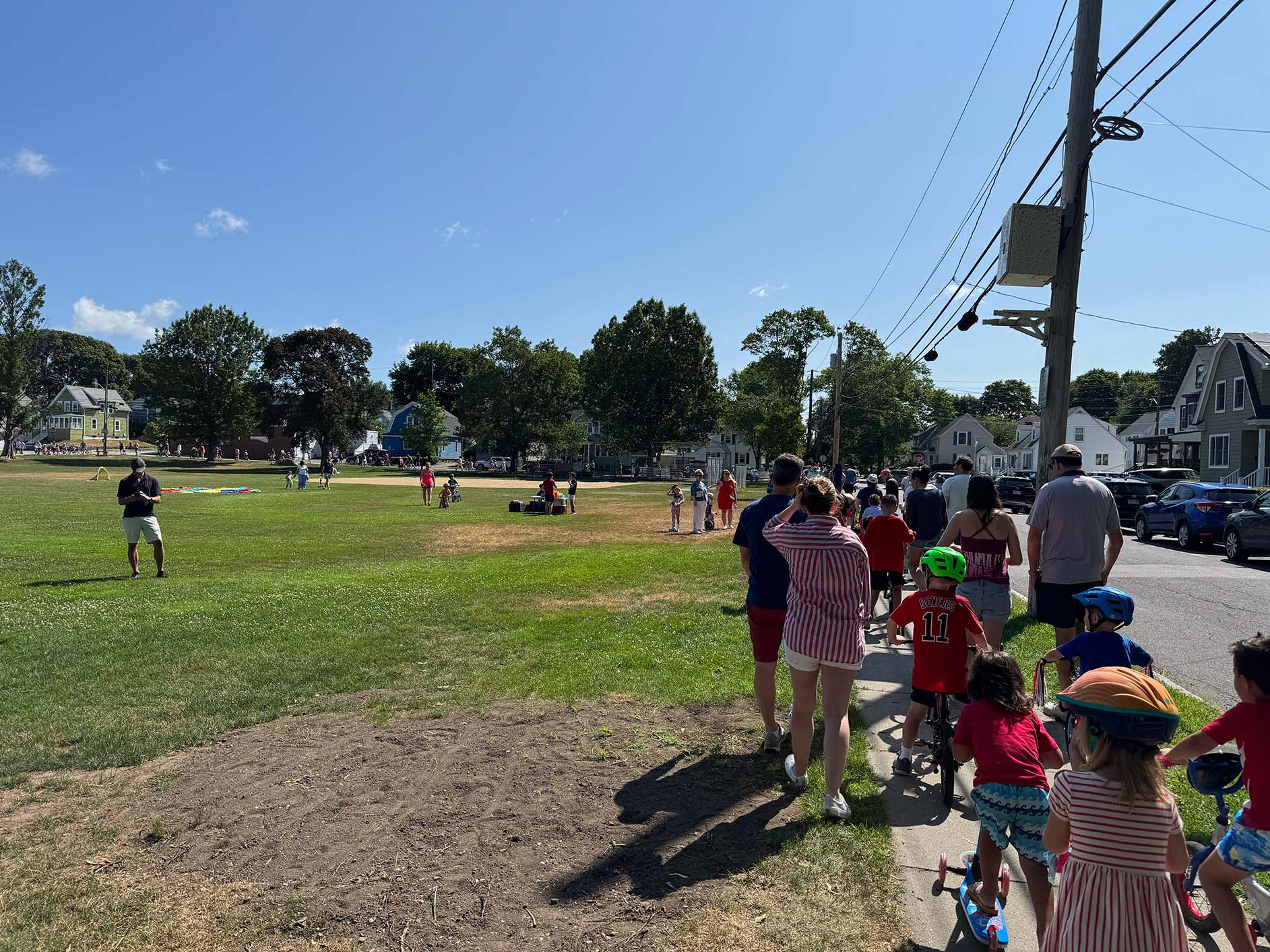 At the Bike and Carriage Parade, families decorated strollers, wagons, bikes, and scooters with flags, streamers, ribbons, and other materials. They paraded around the Melrose Common and then enjoyed ice pops from Seven Mile Road Church, bubbles and a giant parachute from the Melrose Department of Recreation, temporary tattoos from State Representative Kate Lipper Garabedian, and playing with one another on the fields and playground.
