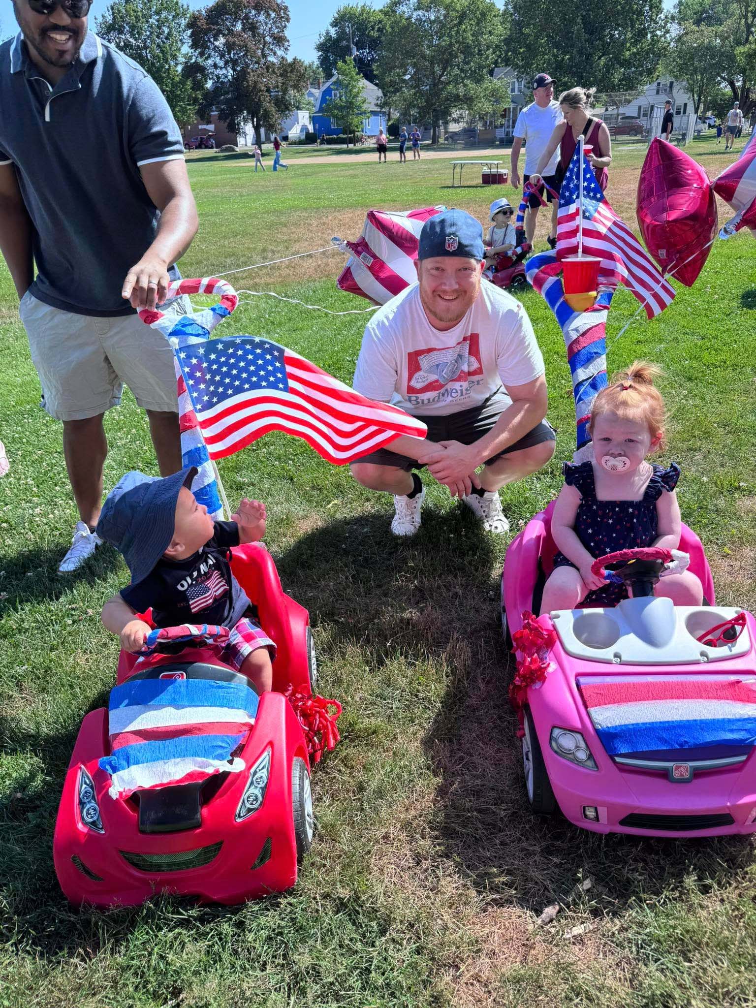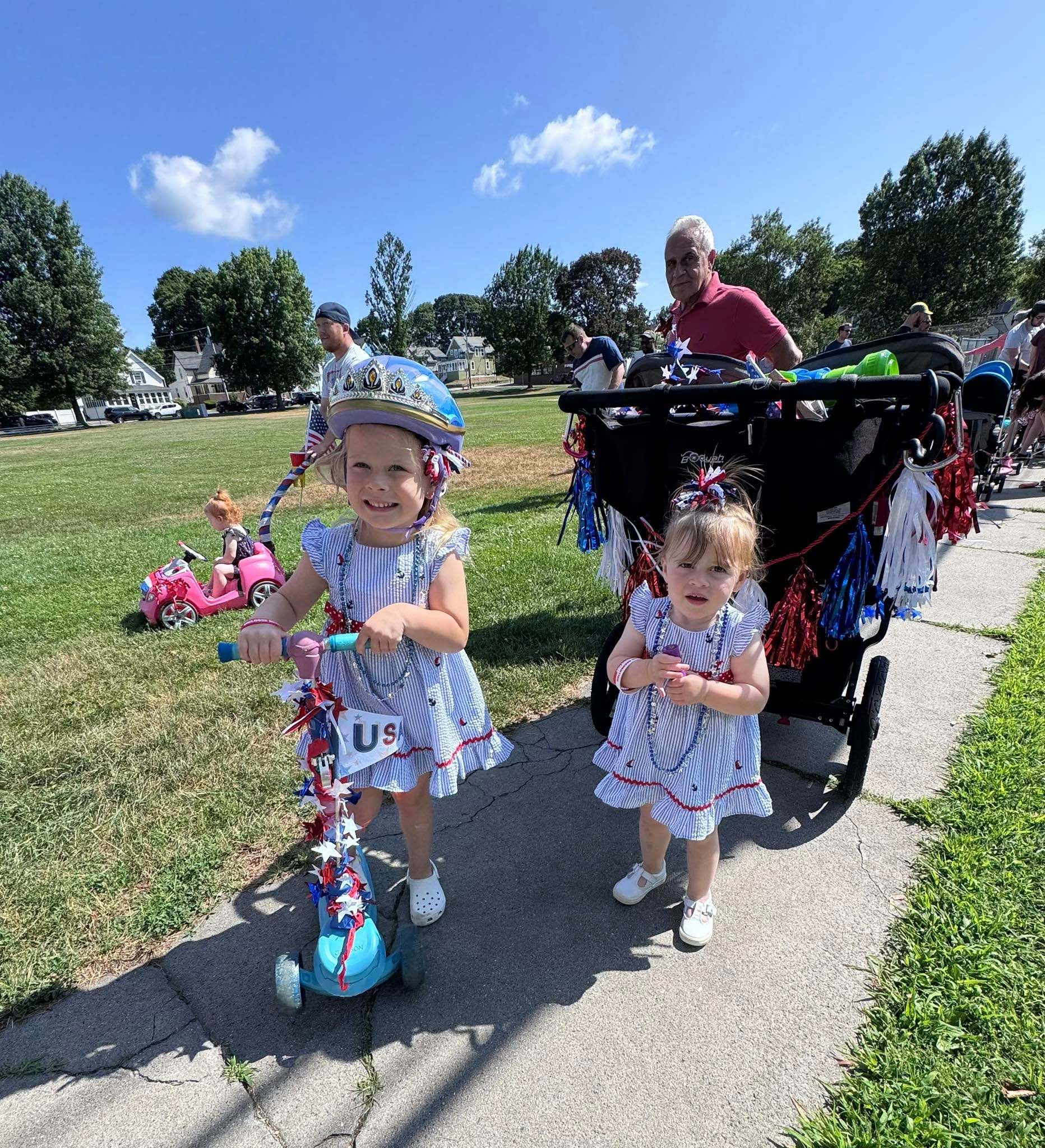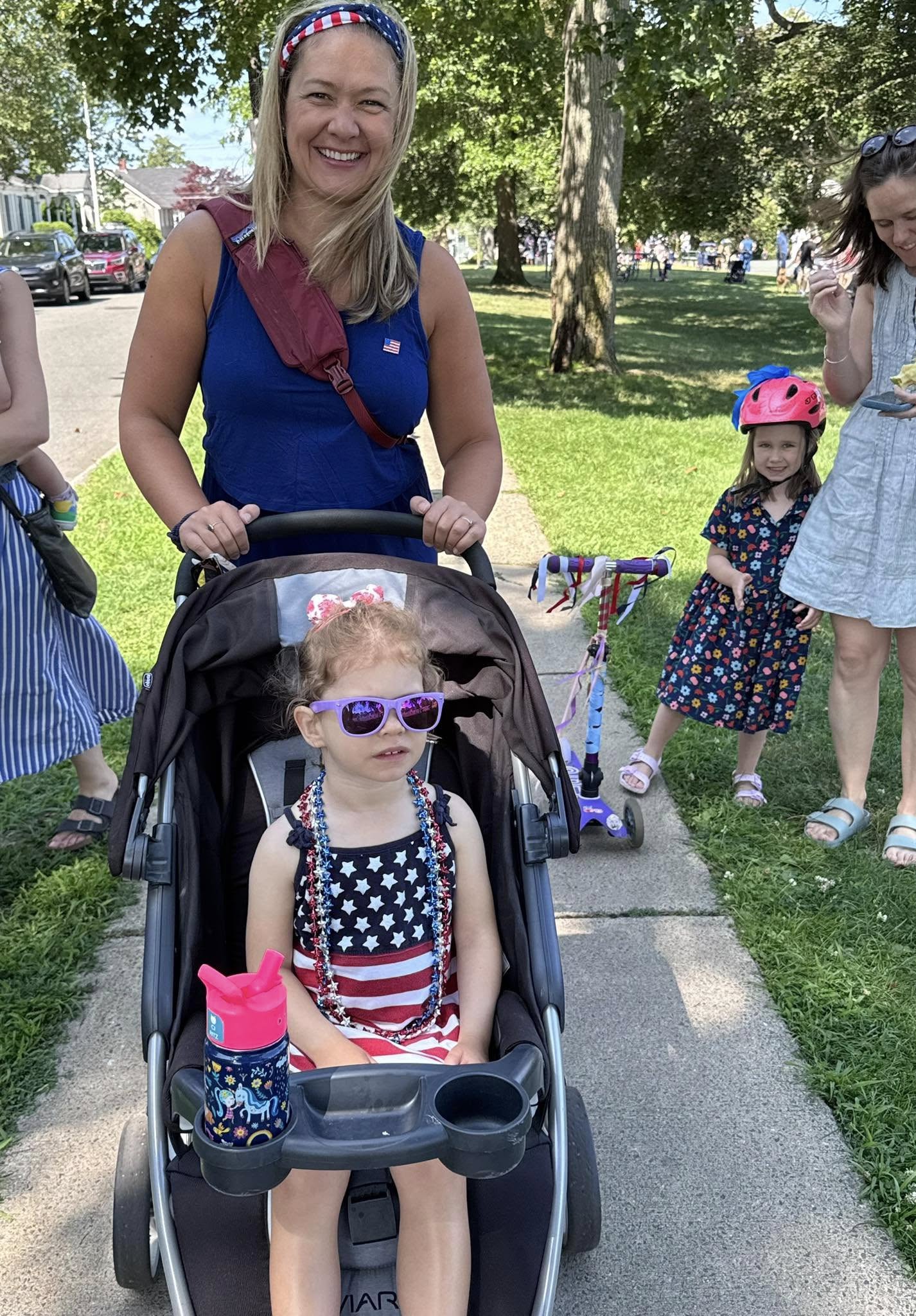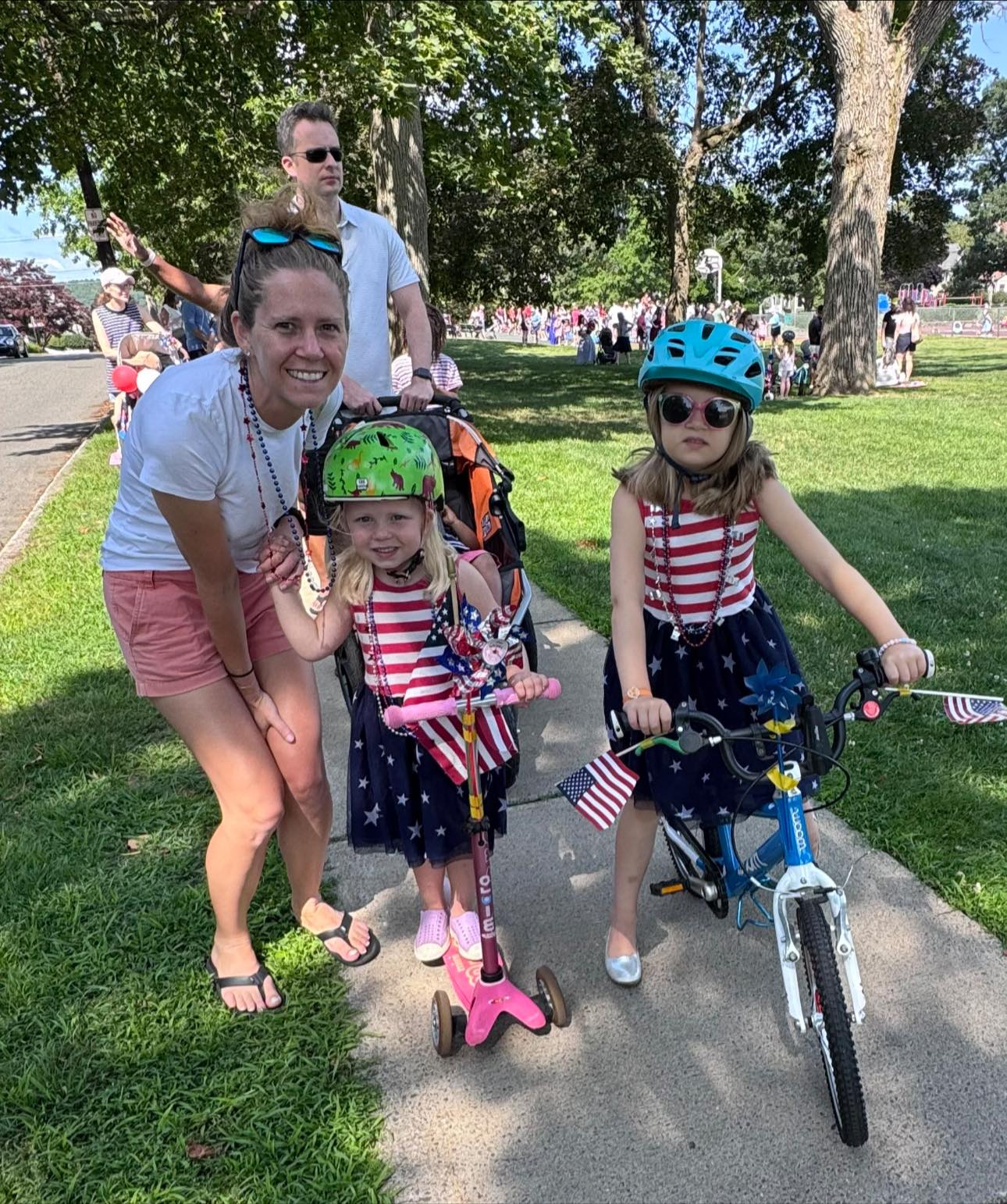 At the Bike and Carriage Parade, families decorated strollers, wagons, bikes, and scooters with flags, streamers, ribbons, and other materials. They paraded around the Melrose Common and then enjoyed ice pops from Seven Mile Road Church, bubbles and a giant parachute from the Melrose Department of Recreation, temporary tattoos from State Representative Kate Lipper Garabedian, and playing with one another on the fields and playground.