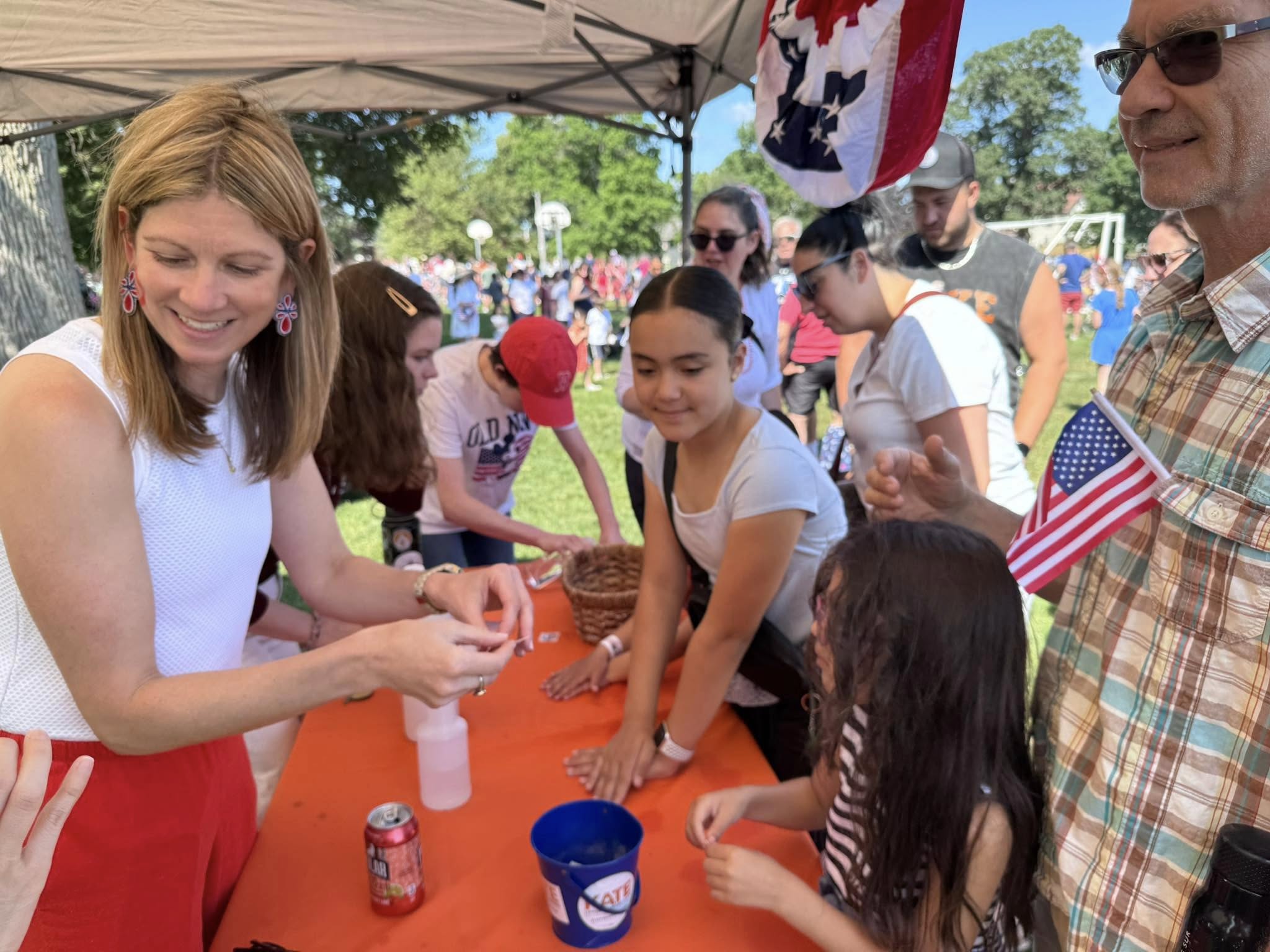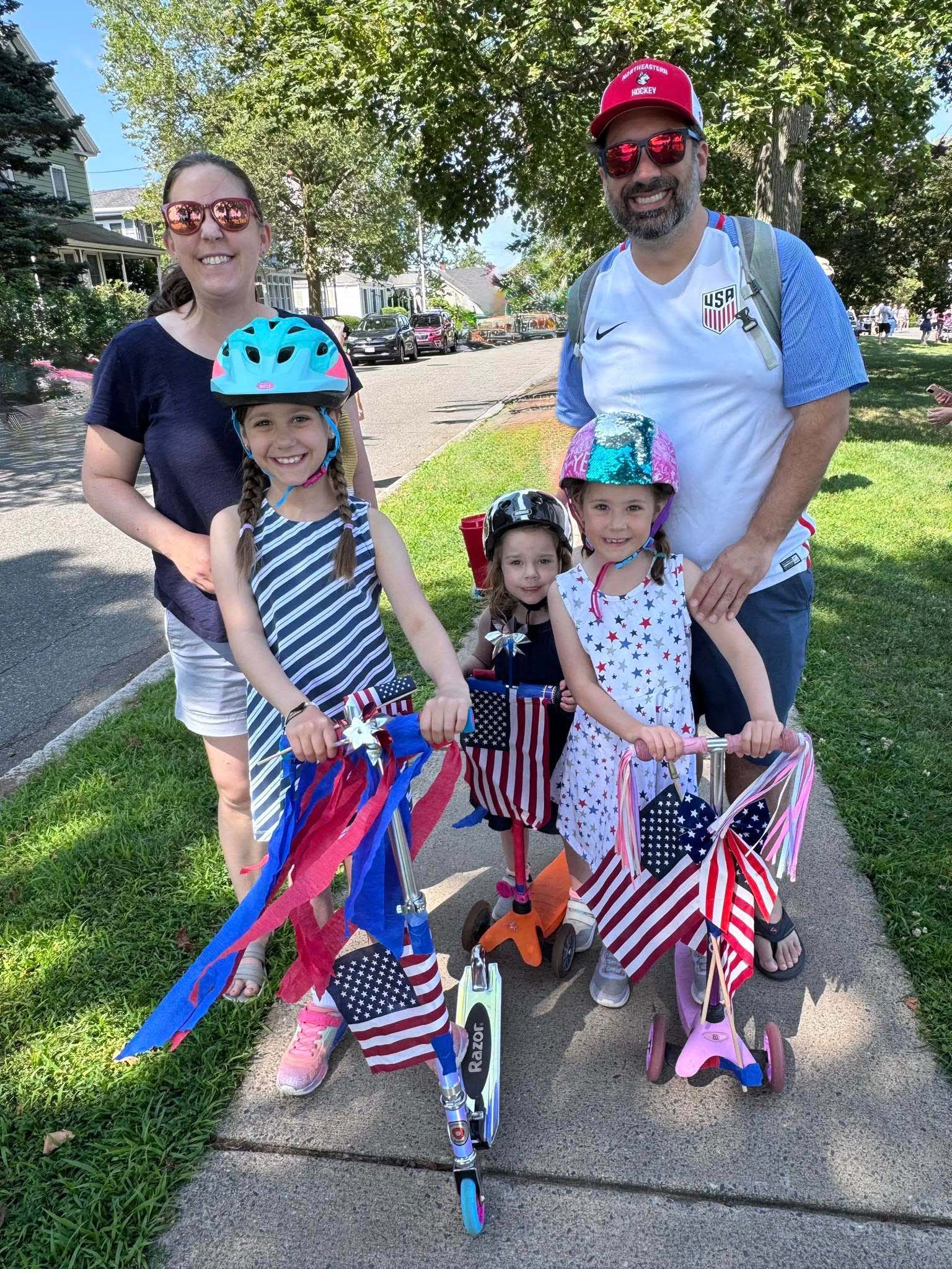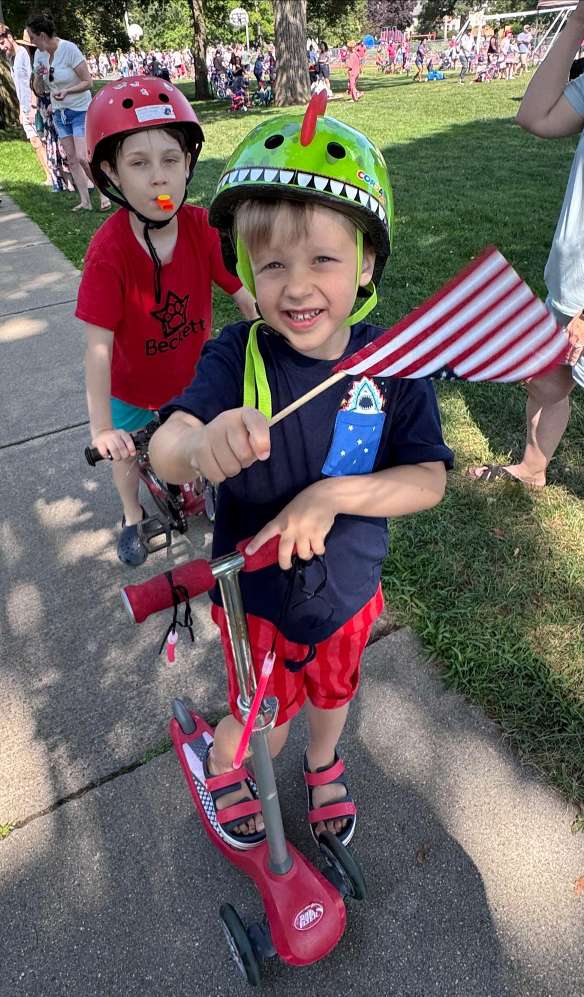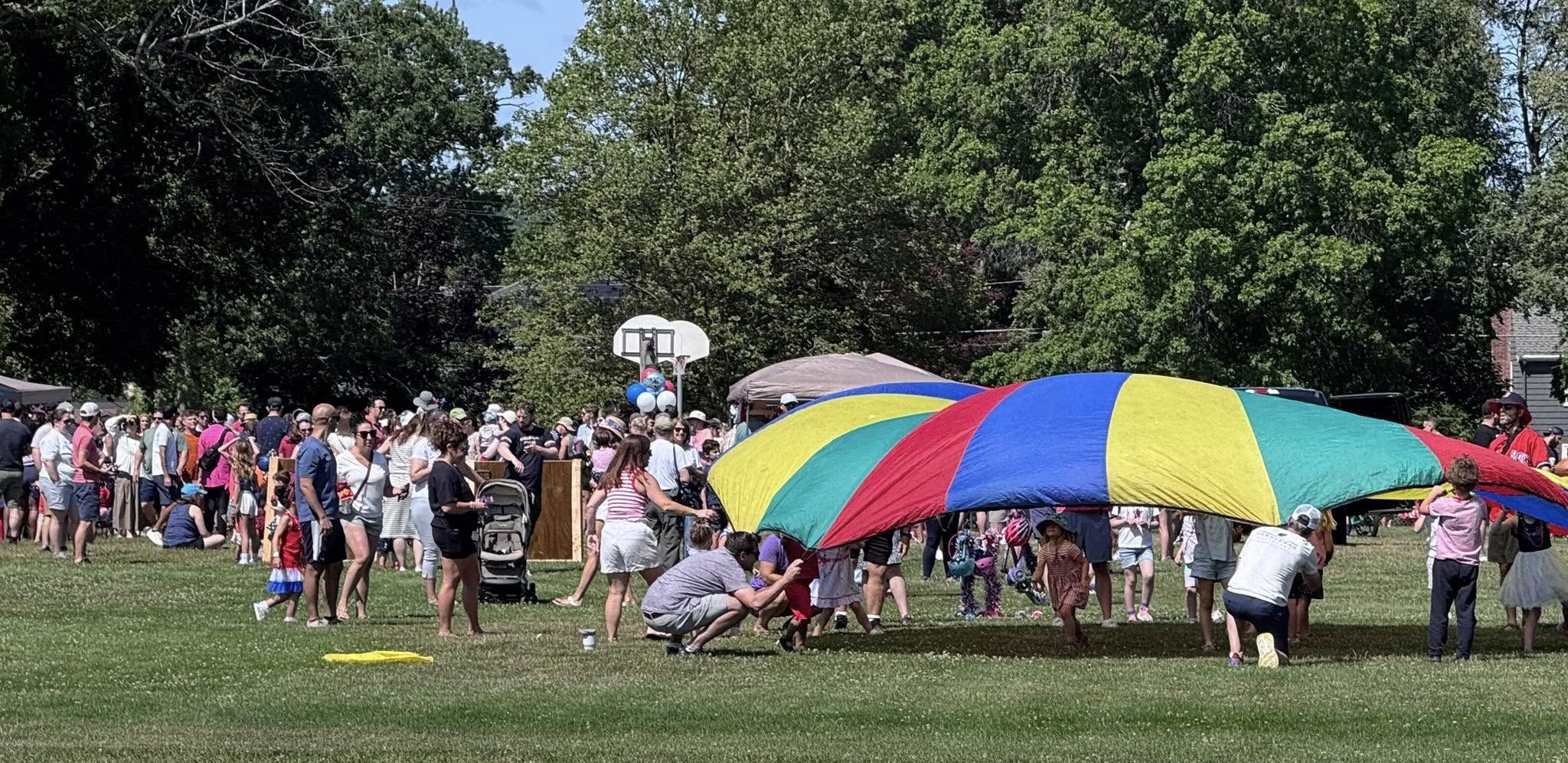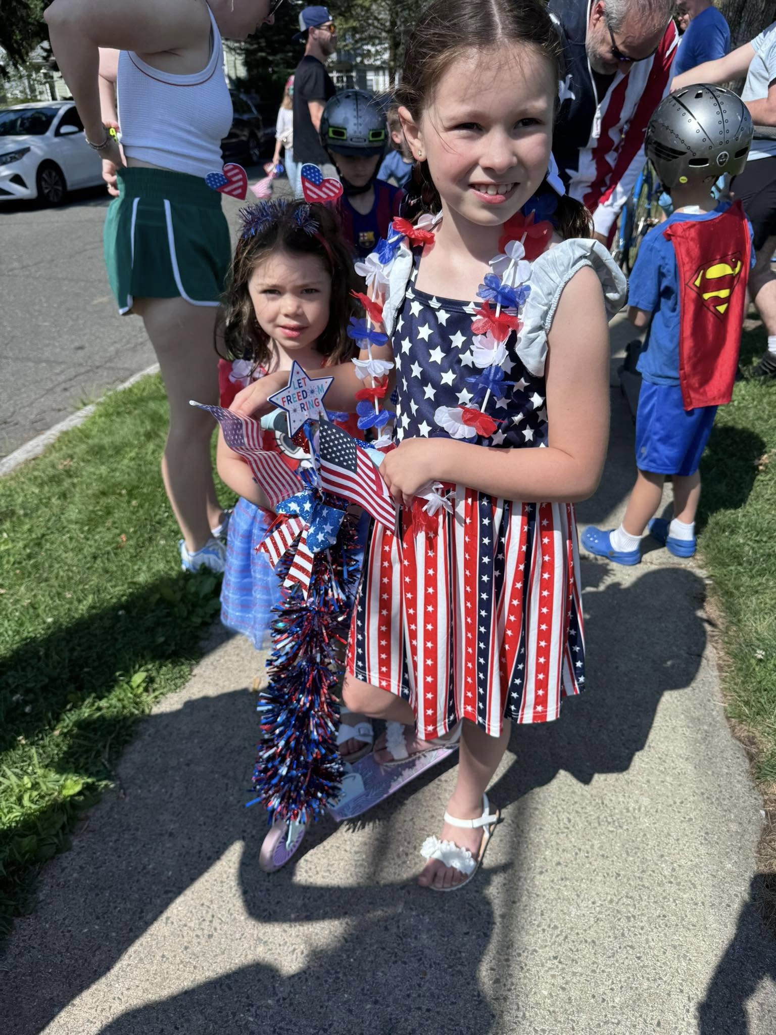 At the Bike and Carriage Parade, families decorated strollers, wagons, bikes, and scooters with flags, streamers, ribbons, and other materials. They paraded around the Melrose Common and then enjoyed ice pops from Seven Mile Road Church, bubbles and a giant parachute from the Melrose Department of Recreation, temporary tattoos from State Representative Kate Lipper Garabedian, and playing with one another on the fields and playground.