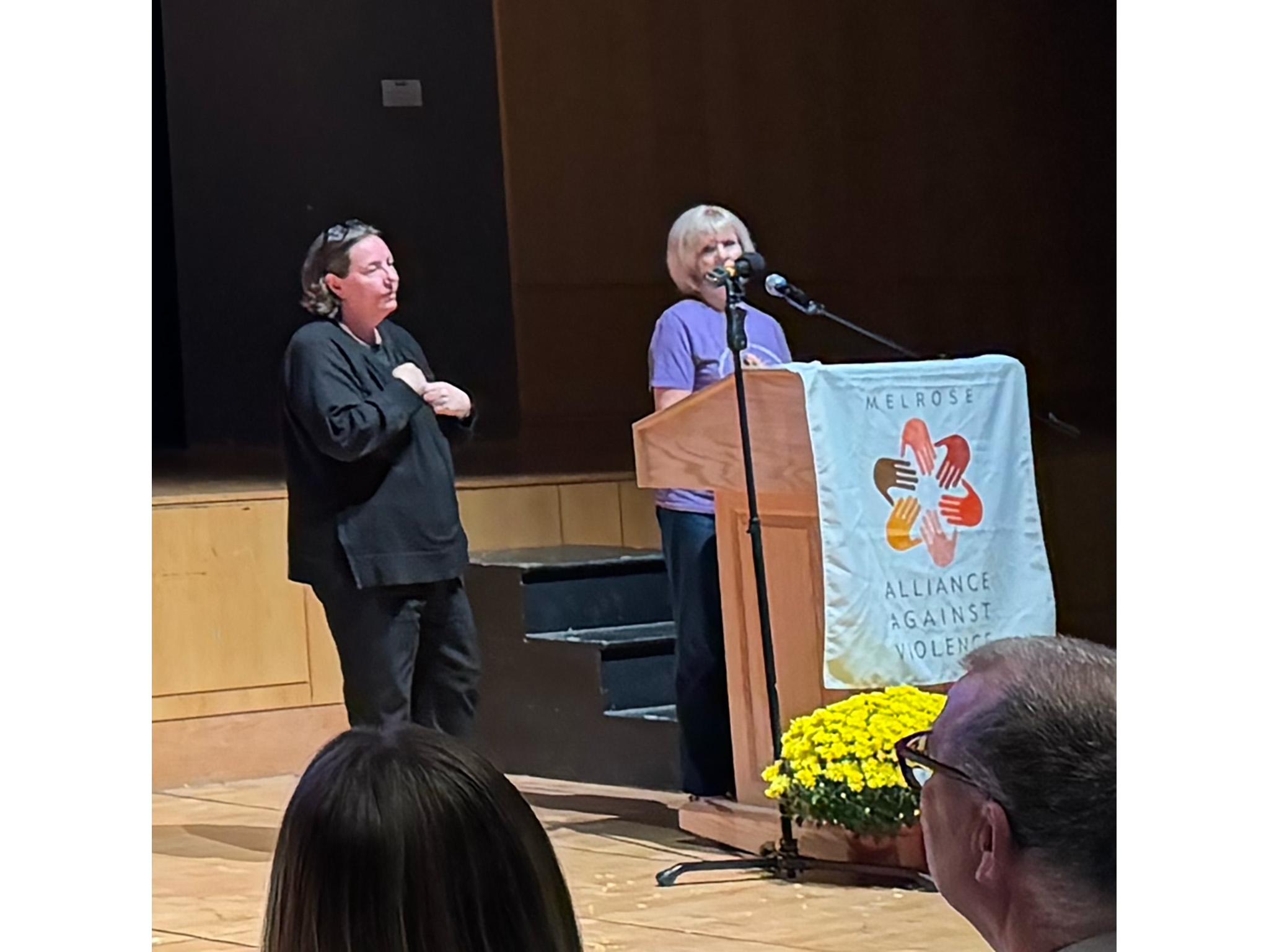 Former MAAV Executive Director Rebecca Mooney offered a tribute to Joan Bell, the longtime MAAV board member and Superintendent of Parks for the City of Melrose who passed away suddenly earlier this year. “If she were here today,” Mooney reflected, “she wouldn’t be in here at the vigil. She never cared about being in the limelight. She’d be out in the hallway selling t-shirts, carrying something heavy, or getting people organized - doing whatever had to be done.”