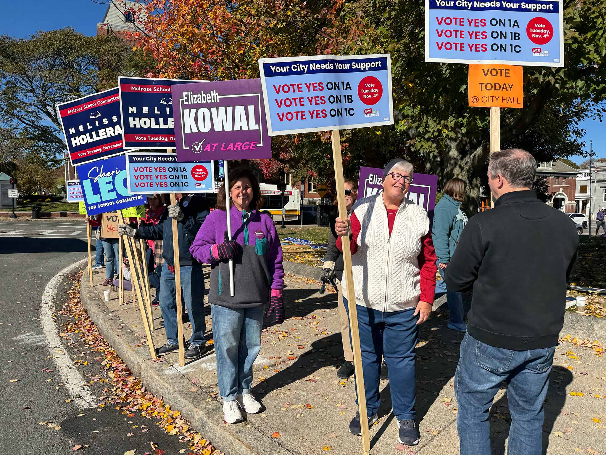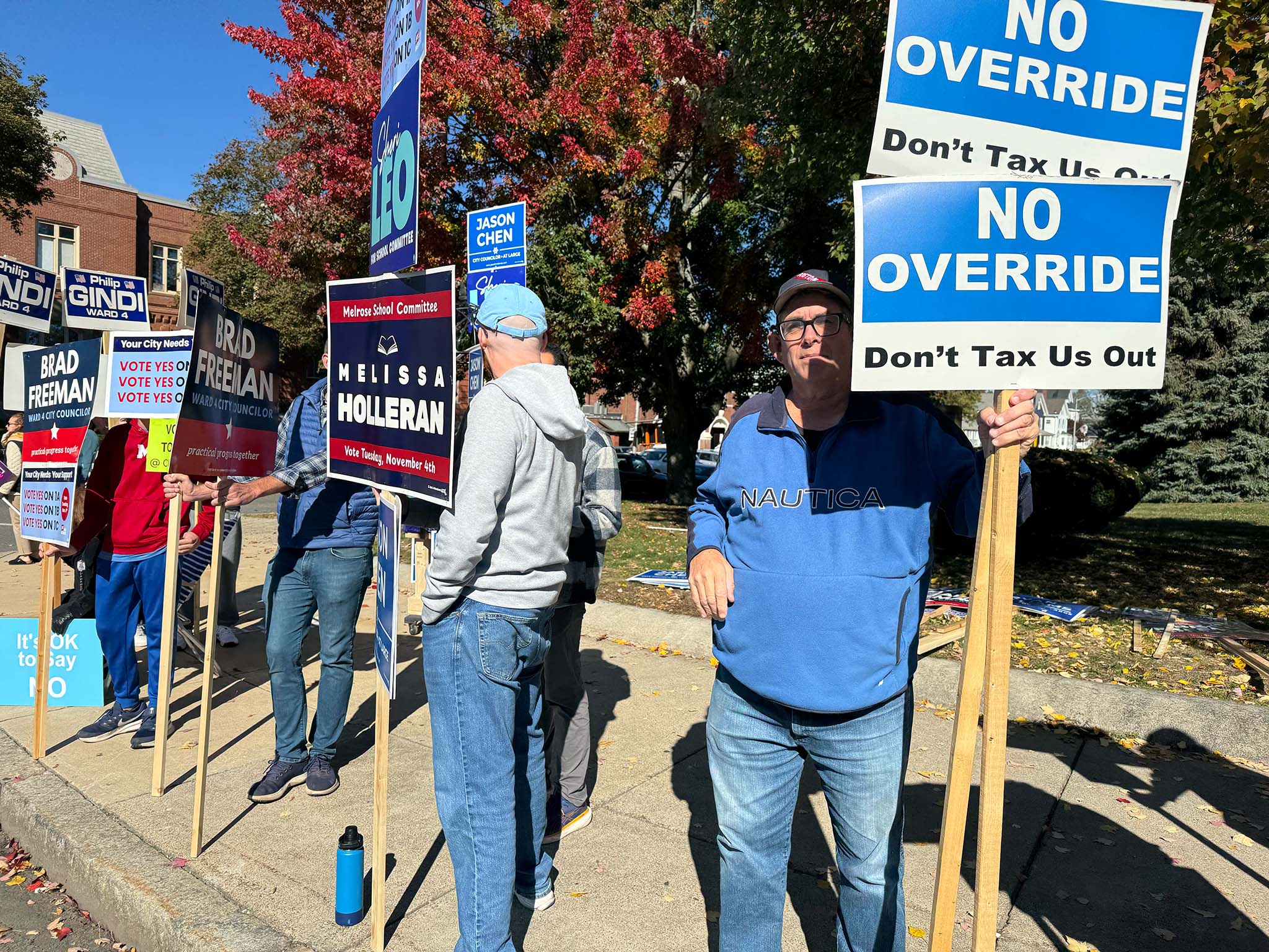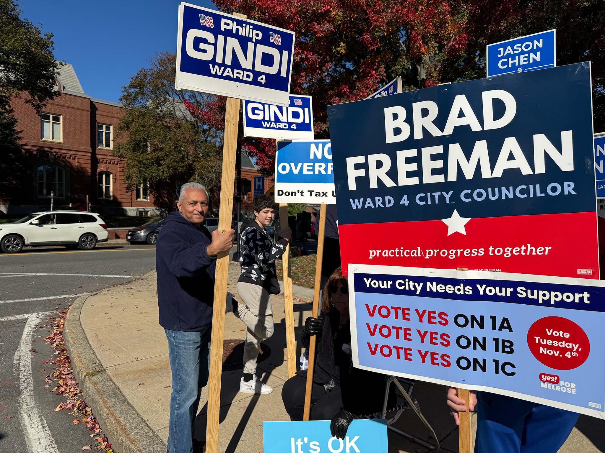 We spotted a number of candidates out holding signs: Ryan Williams, Devin Romanul, and Kim Vandiver stood on one corner; Alex Rodriguez on another; and Elizabeth Kowal, Brad Freeman, and Philip Gindi on the third corner, along with former mayor Gail Infurna and representatives of both the 'Yes' and 'No' override campaigns. (We also heard that other public figures, including Mayor Jen Grigoraitis, were out at other points during the day.)