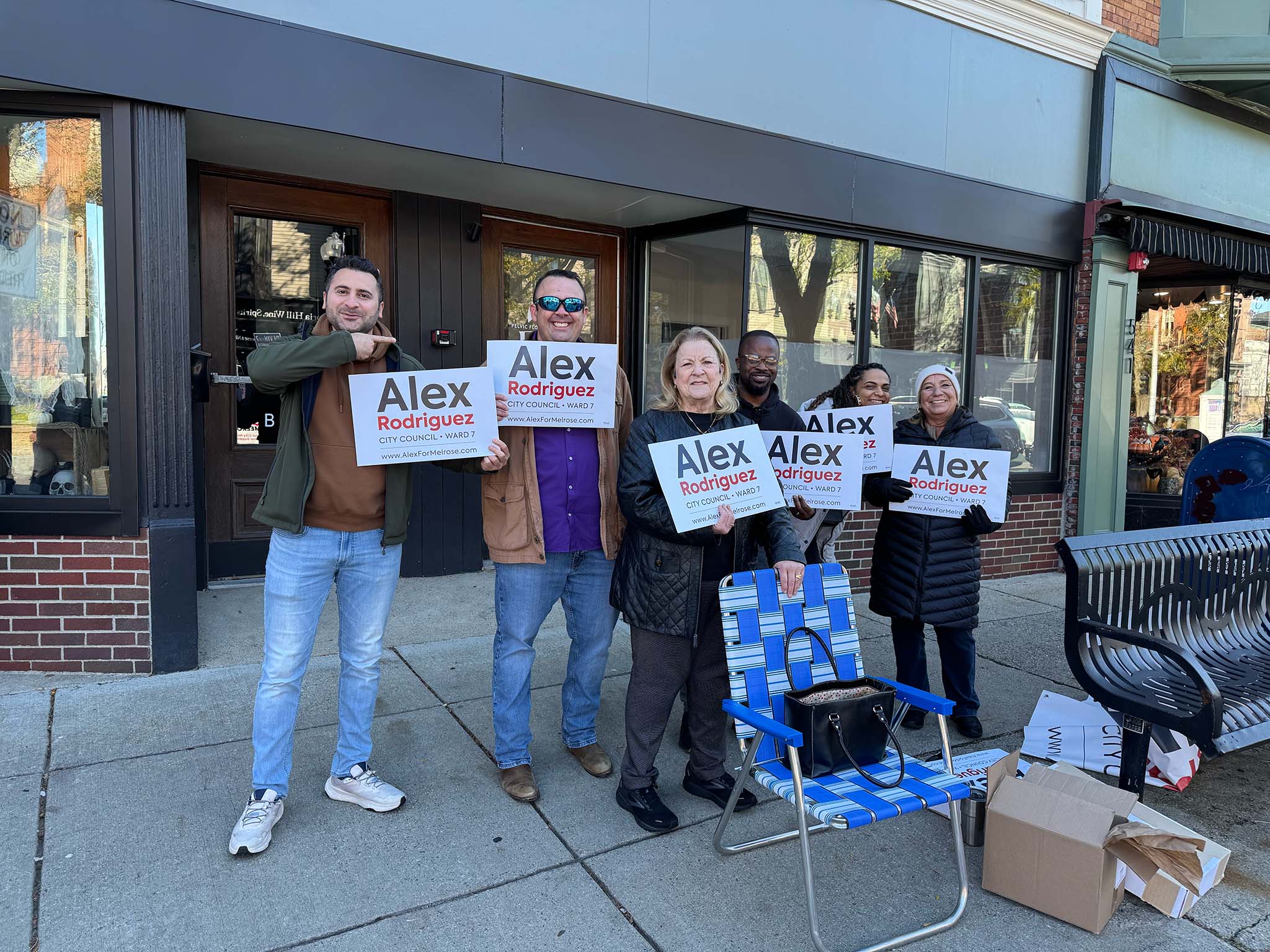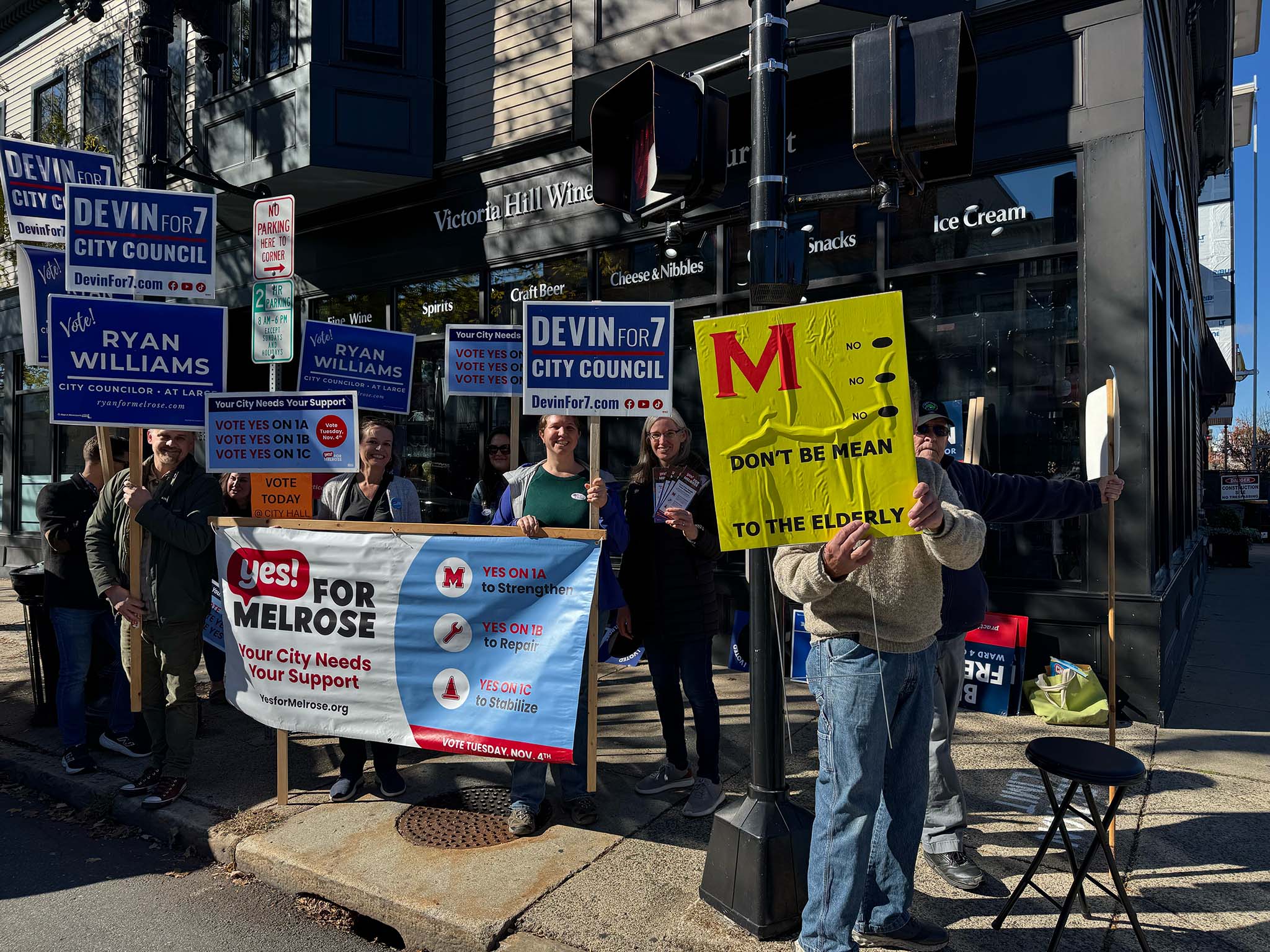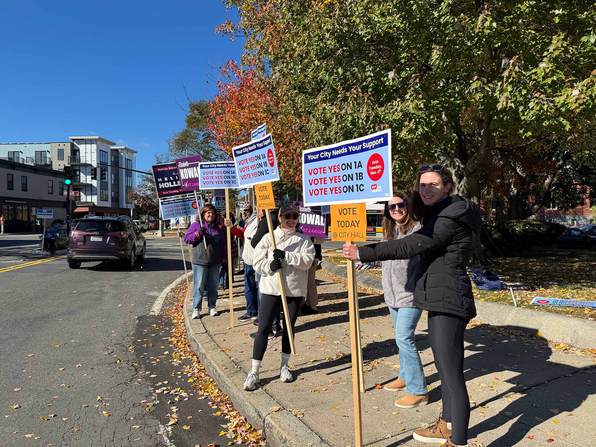 We spotted a number of candidates out holding signs: Ryan Williams, Devin Romanul, and Kim Vandiver stood on one corner; Alex Rodriguez on another; and Elizabeth Kowal, Brad Freeman, and Philip Gindi on the third corner, along with former mayor Gail Infurna and representatives of both the 'Yes' and 'No' override campaigns. (We also heard that other public figures, including Mayor Jen Grigoraitis, were out at other points during the day.)