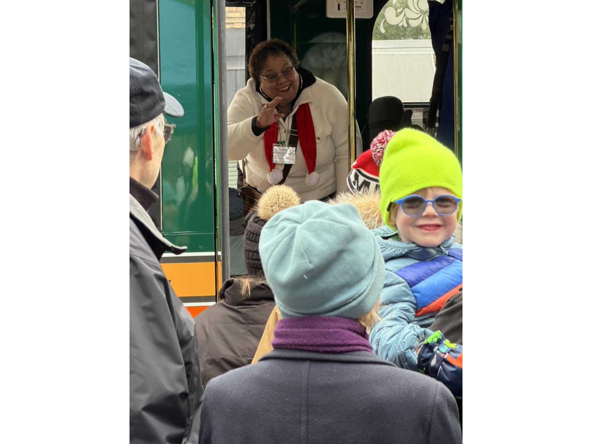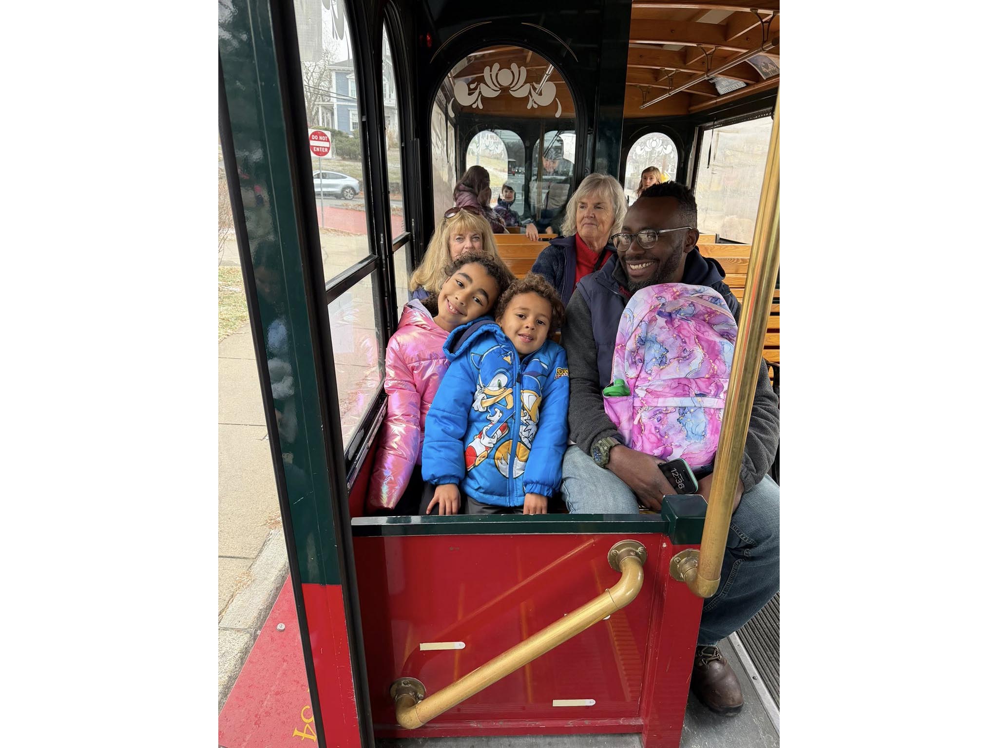 City Councilors Cal Finocchiaro and Manjula Karamcheti were trolley guides