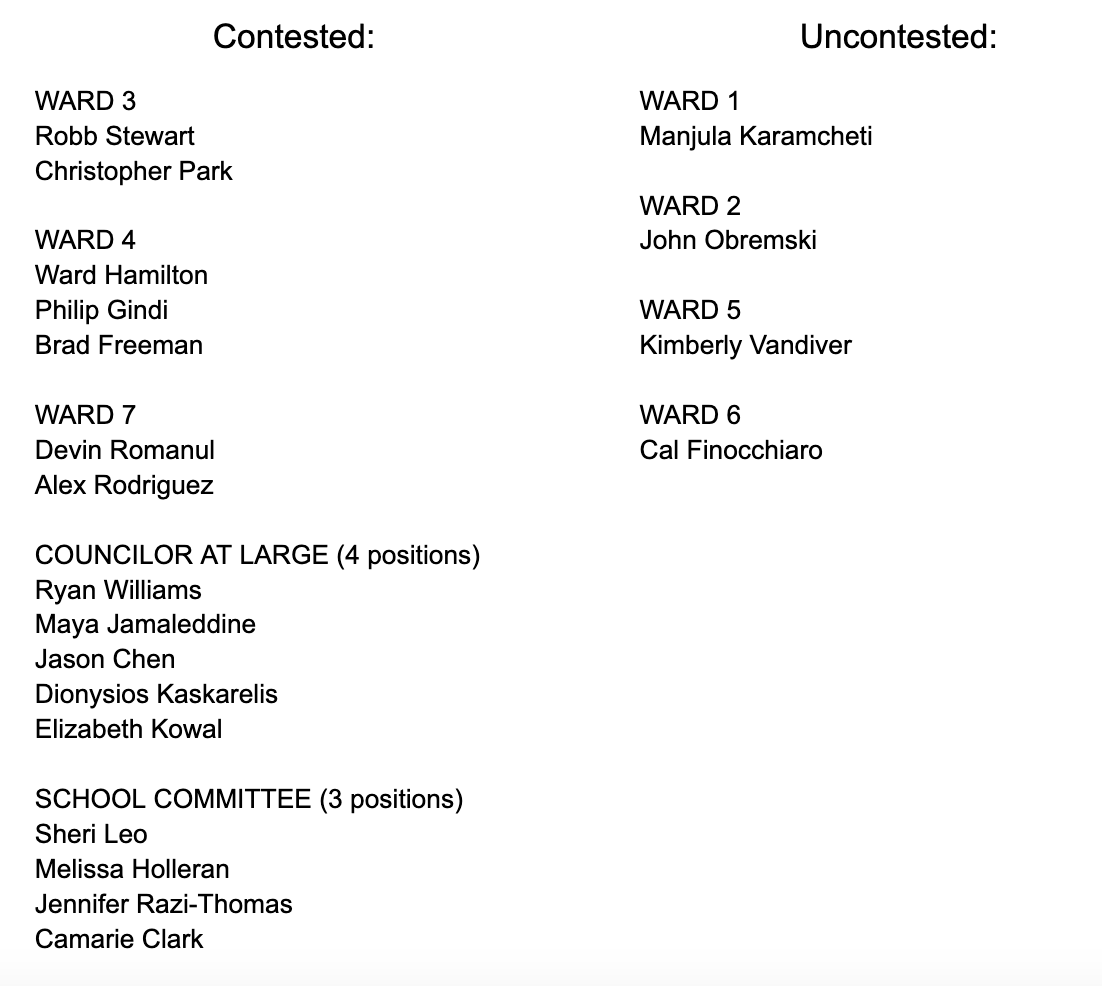 Five candidates are running for four positions as City Councilor At Large: incumbents Ryan Williams and Maya Jamaleddine and newcomers Jason Chen, Dionysios Kaskarelis, and Elizabeth Kowal. Current City Councilor At Large Leila Migliorelli announced last month that she would not be running for re-election.