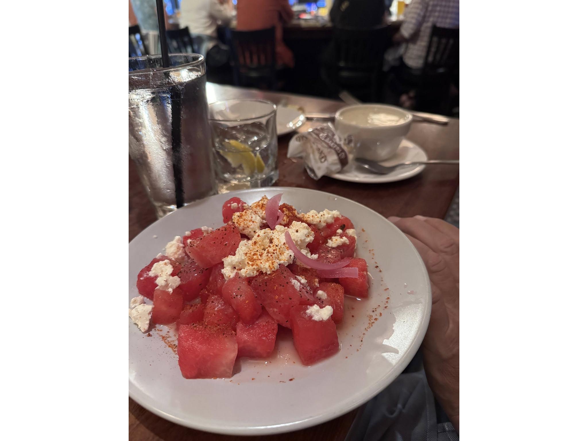 For my entrée, I chose the Watermelon Salad — fresh watermelon and feta with pickled red onion, mint, and a lemon–poppy seed vinaigrette, finished with a sprinkle of Tajín. Refreshing and bright ($12). I also had the Chilled Lo Mein & Veggie Salad with just the right amount of peanut sauce dressing — excellent, crunchy, and full of flavor ($12).