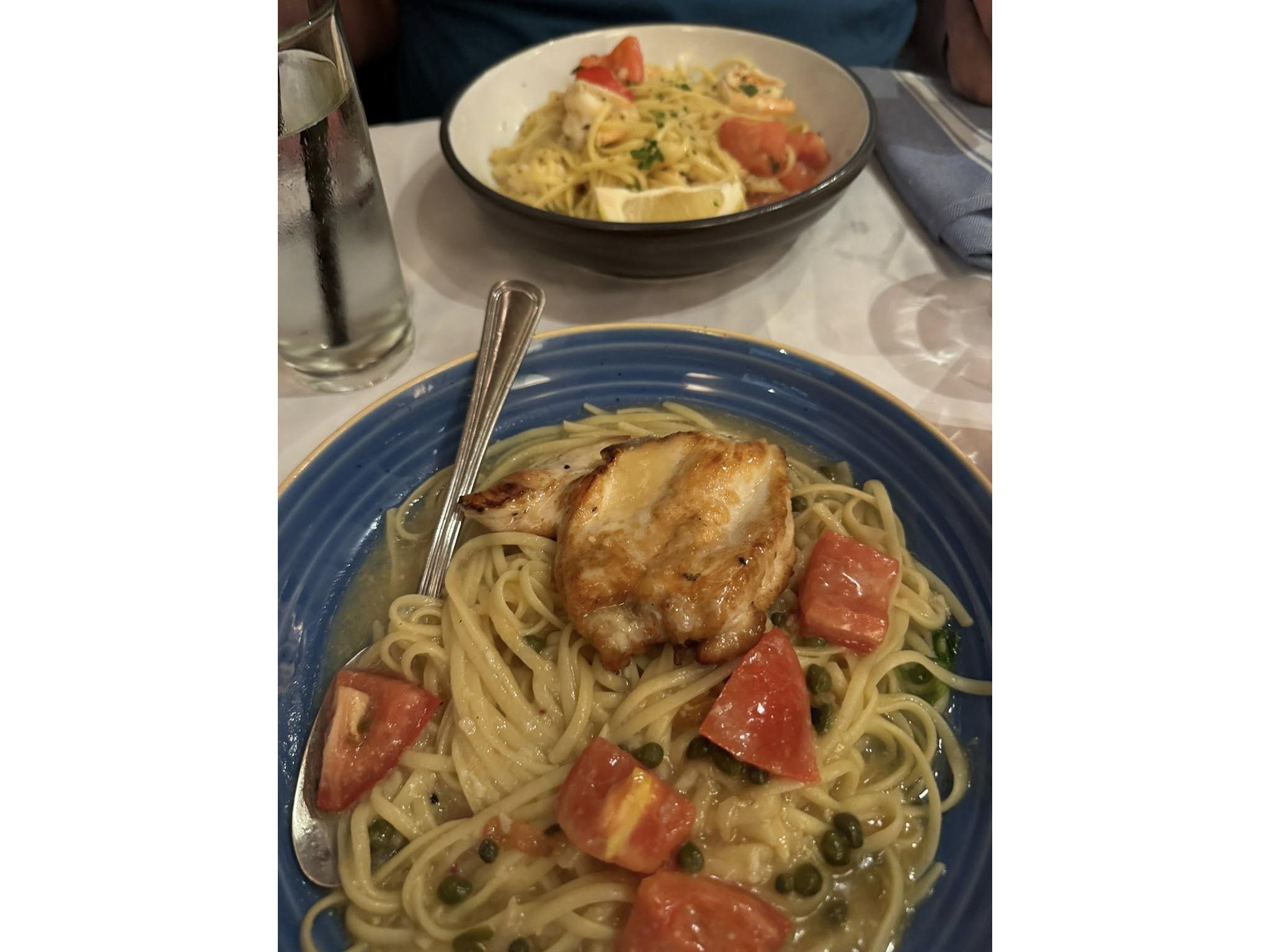 Seafood report (from the true seafood lovers at our table): The men raved about the clam chowder. Paul ordered the Sword Tips Special — sautéed swordfish tips in Marsala with mushrooms and prosciutto over linguini ($24). My cousin went all in with the Seafood Medley — fried haddock, scallops, and shrimp, served with spinach and mashed potatoes ($37).