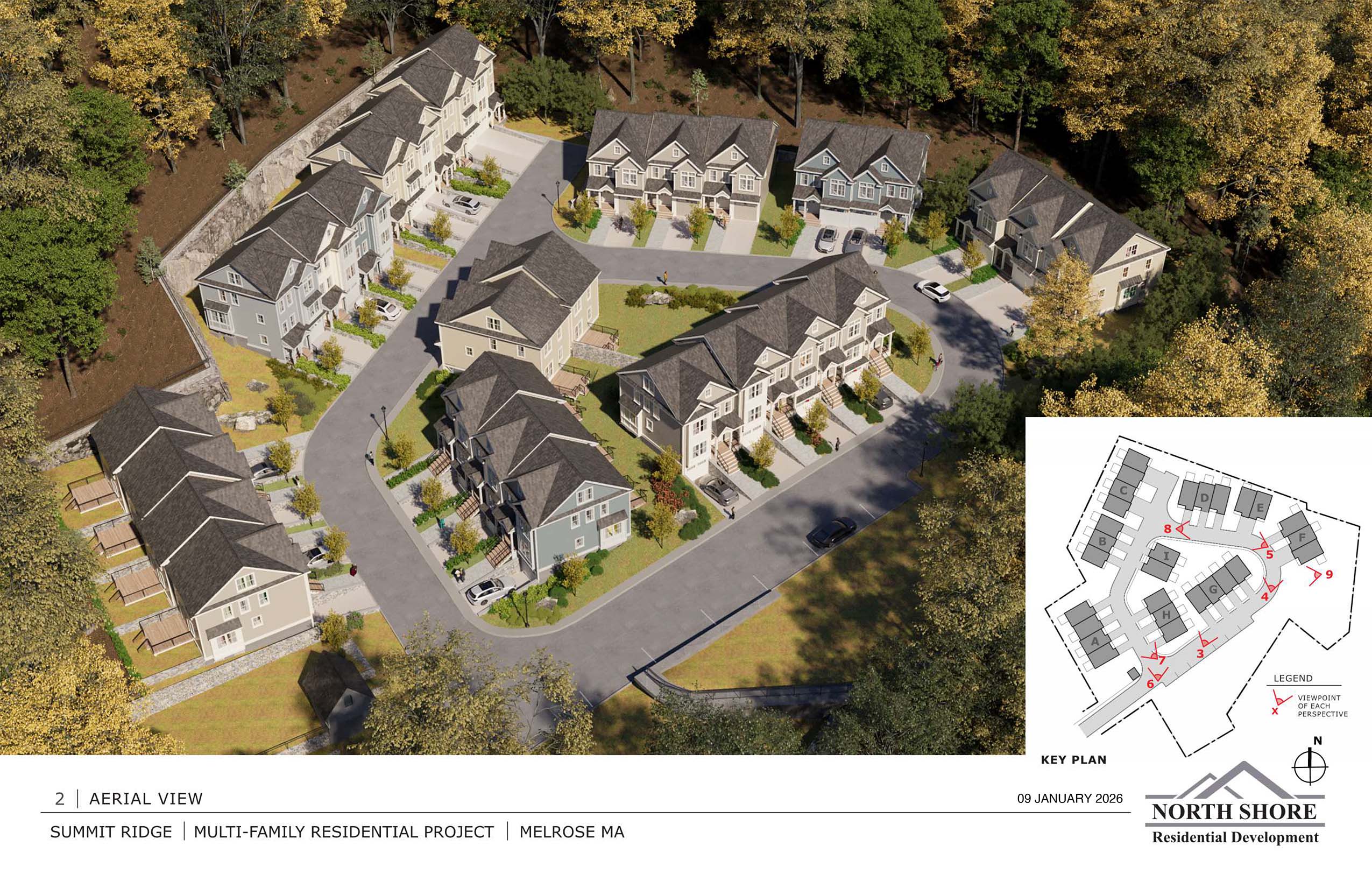 The 34 & 55 Summit Ave proposal is for a 28-unit for-sale townhome development with 56 parking spaces and 11 visitor spaces at the top of a very steep, narrow road in the hills above Franklin Street. Currently, the site is mostly undeveloped land with two single-family houses on it. While the site is not far from the Melrose Highlands train station, steep hills do not make the site very pedestrian-friendly.