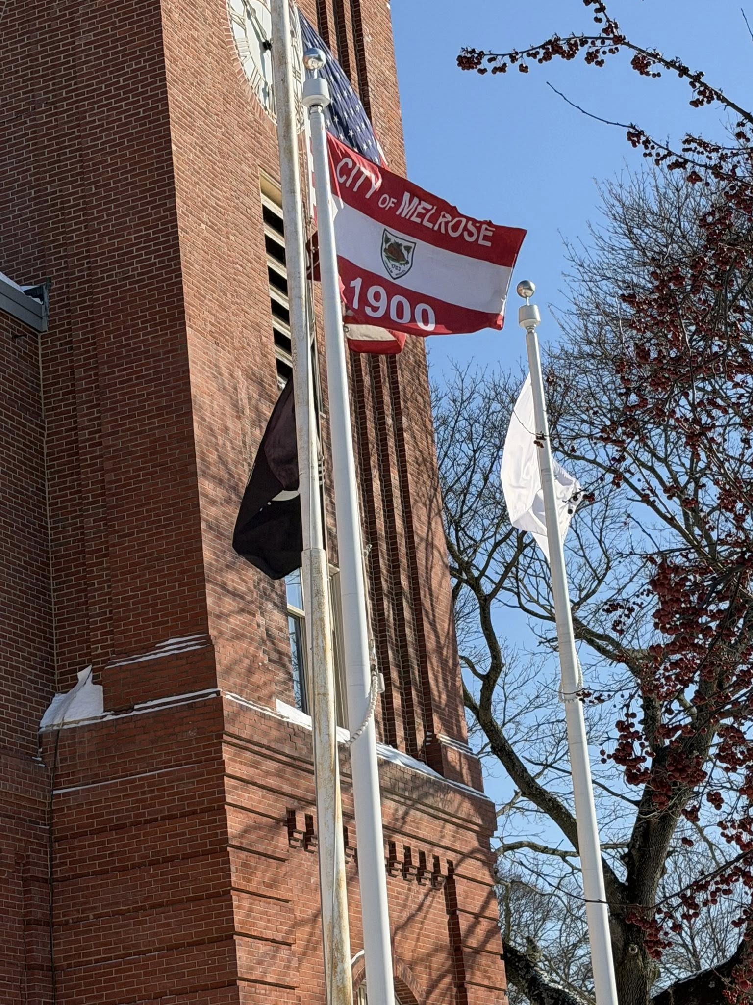 Her design is simple, elegant, and full of meaning. The flag features a red–white–red horizontal tribar. The top stripe bears the city’s name, the bottom stripe carries the date 1900, marking the year Melrose was incorporated as a city, and at the center is a sketch of the historic Phineas Upham House — one of Melrose’s most treasured colonial homes.