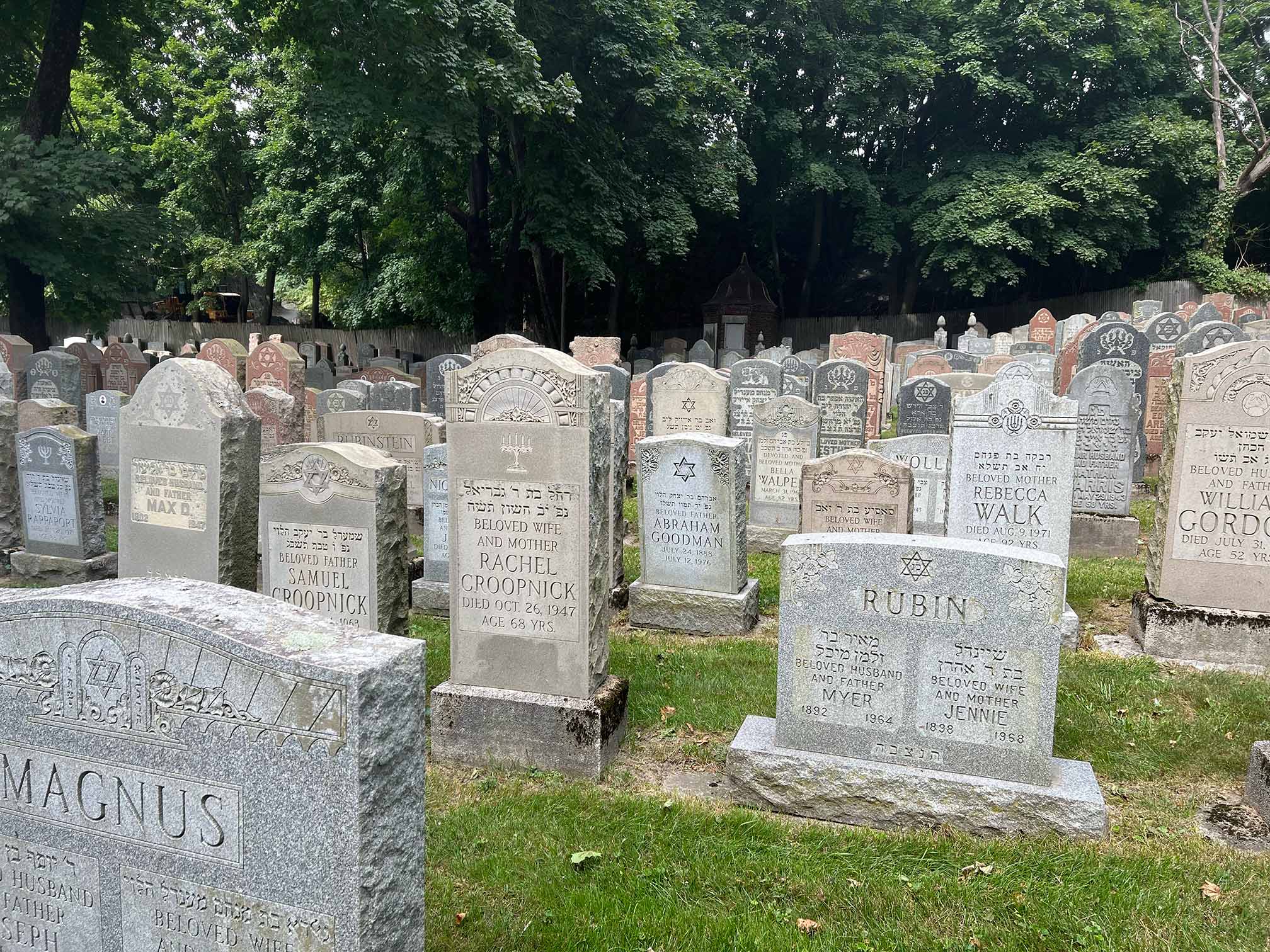 Many of the gravestones in these cemeteries are written in both Hebrew and English, and walking among the monuments reveals, in some ways, the story of these Jewish immigrants and their descendants. Gravestones describe servicemembers and veterans; beloved spouses, parents, grandparents, and even a few children; names that slowly began to sound more "American" as families assimilated and Yiddish-speaking households gave way to English.