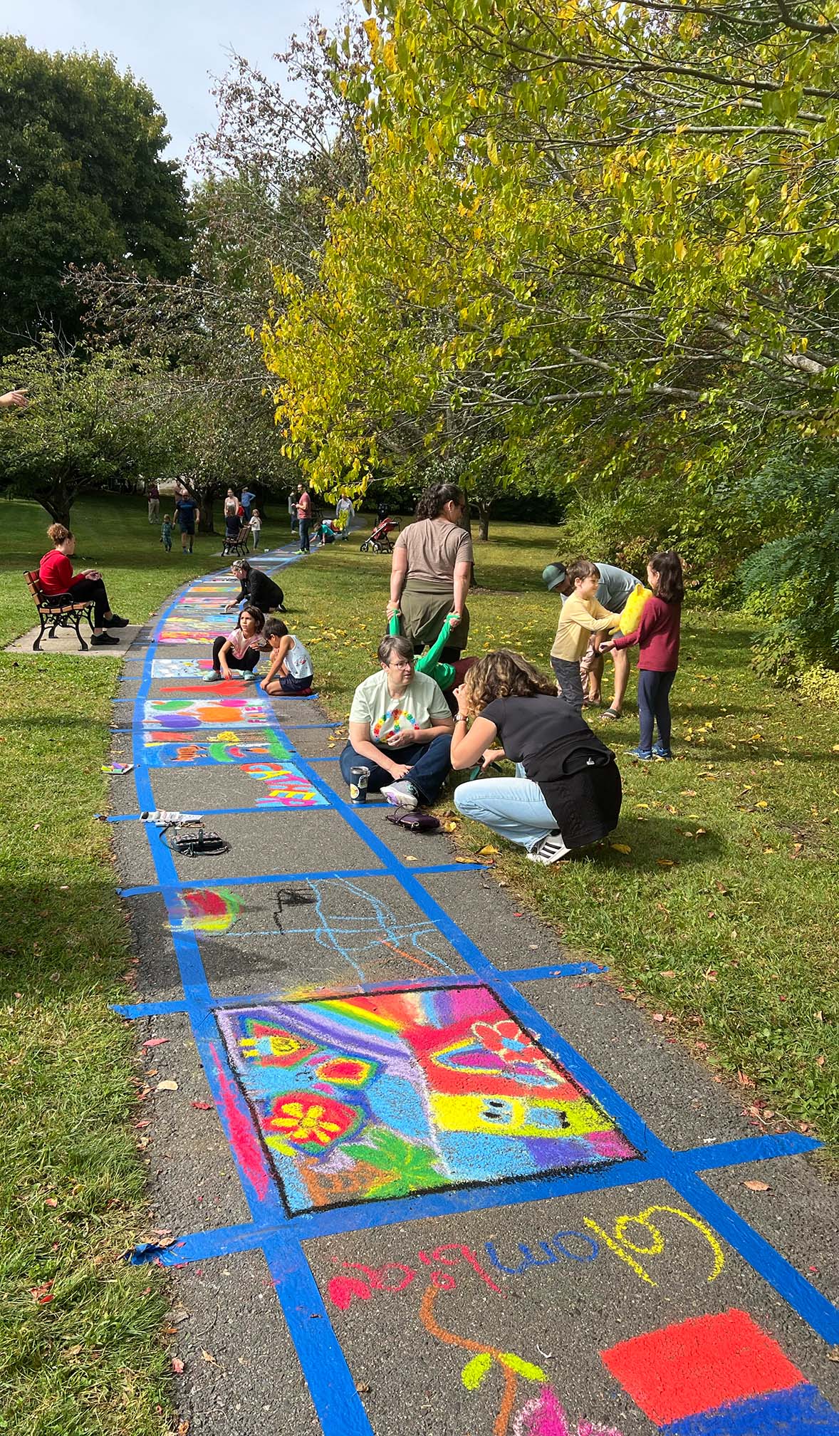 Over at Ell Pond, by the gazebo, community members created their own squares, with some Halloween- or fall-themed, and abstract or following other themes. There was face painting, and Finley the Therapy Dog made an appearance, too.