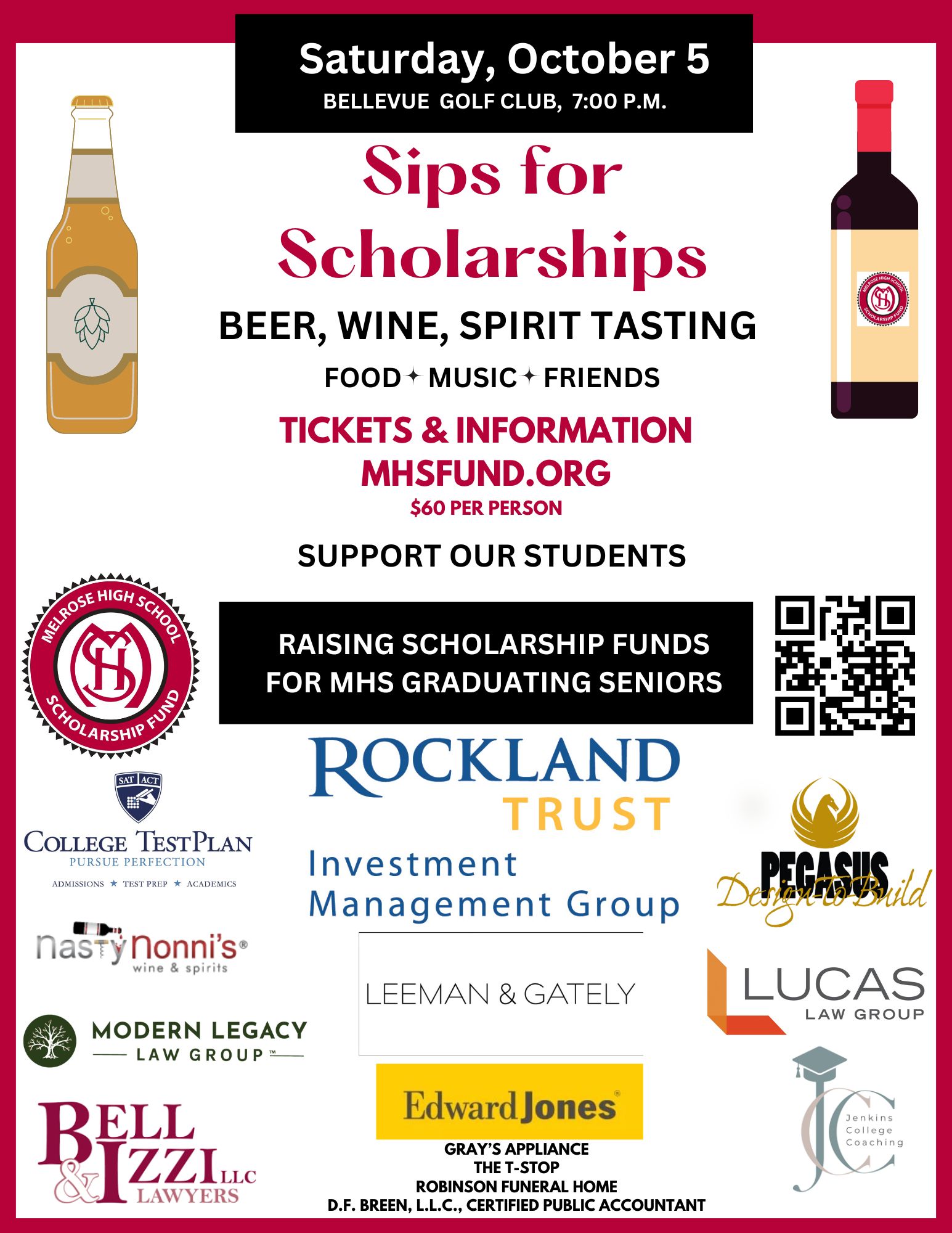 The Melrose High School (MHS) Permanent Scholarship Fund will be hosting its popular Sips for Scholarships fundraiser on Saturday, October 5th at the Bellevue Golf Club. Melrose community members are encouraged to buy tickets to support the MHS Class of 2025 in their postgraduate education.