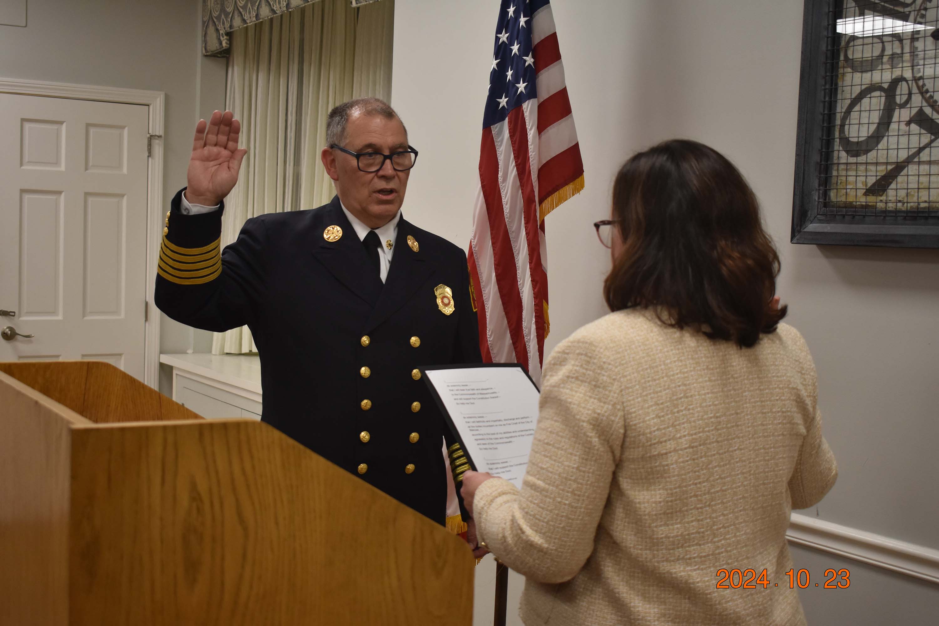 On Wednesday, October 23rd, John White was officially installed as the new chief of the Melrose Fire Department. This same ceremony recognized the promotions of several other officers in the department, and the hiring of a number of new recruits. Chief White’s appointment had been approved by the City Council on October 7th.