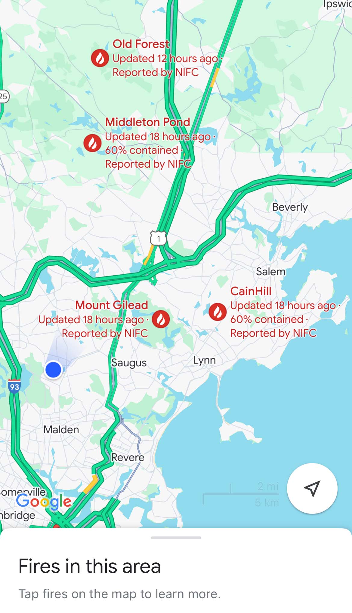 Searching for "Wildfires" on Google Maps Displays Information on Current Brush Fires in the Area