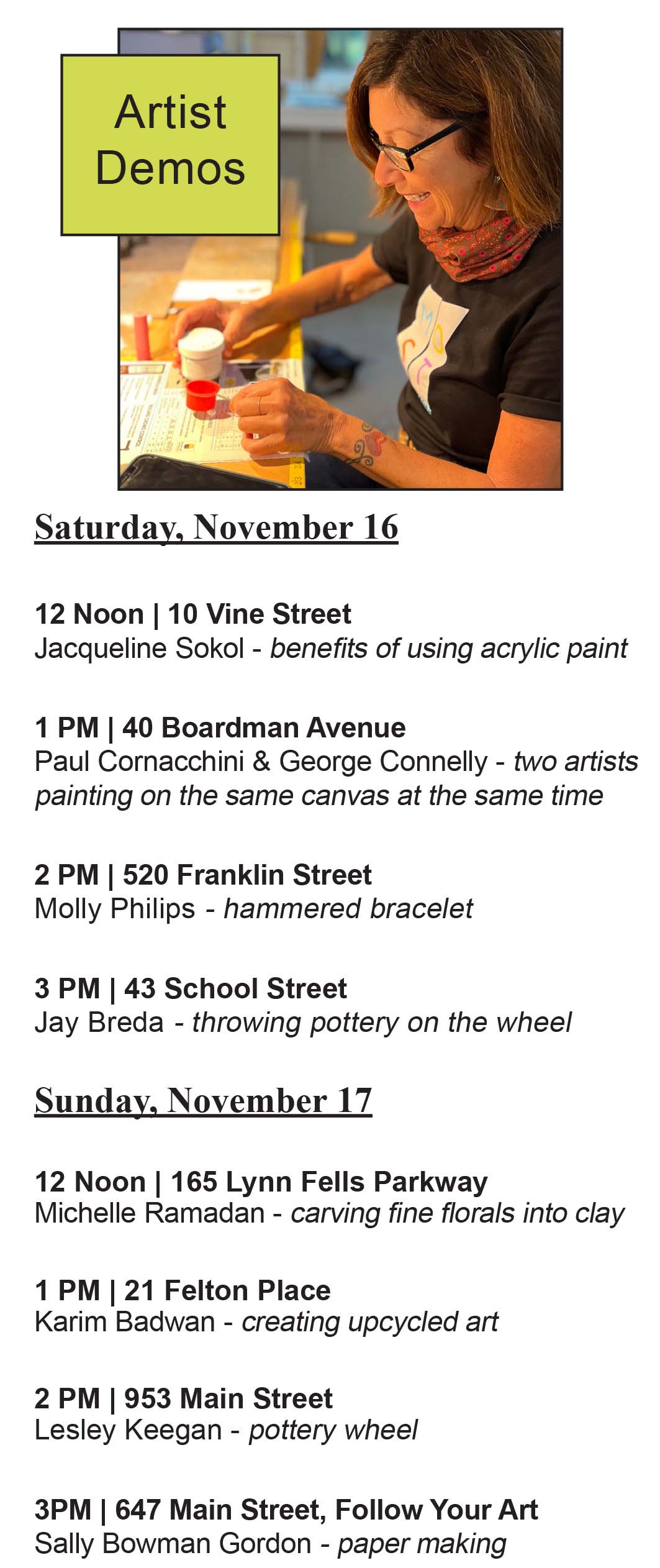 MOST is a free, self-guided tour, and audience members can use the map (see map at right) to visit as few or as many artists as they choose, from 11am to 4pm on both Saturday and Sunday. Artist demos will take place on both days, allowing the public to see several artists at work. (See schedule at left)