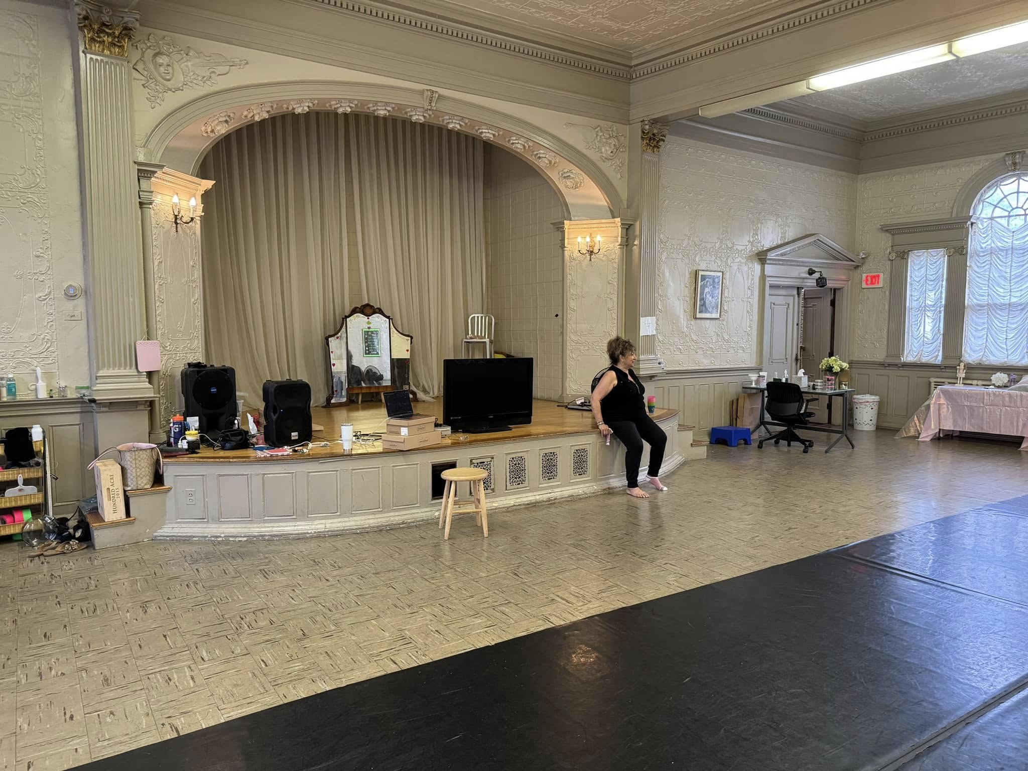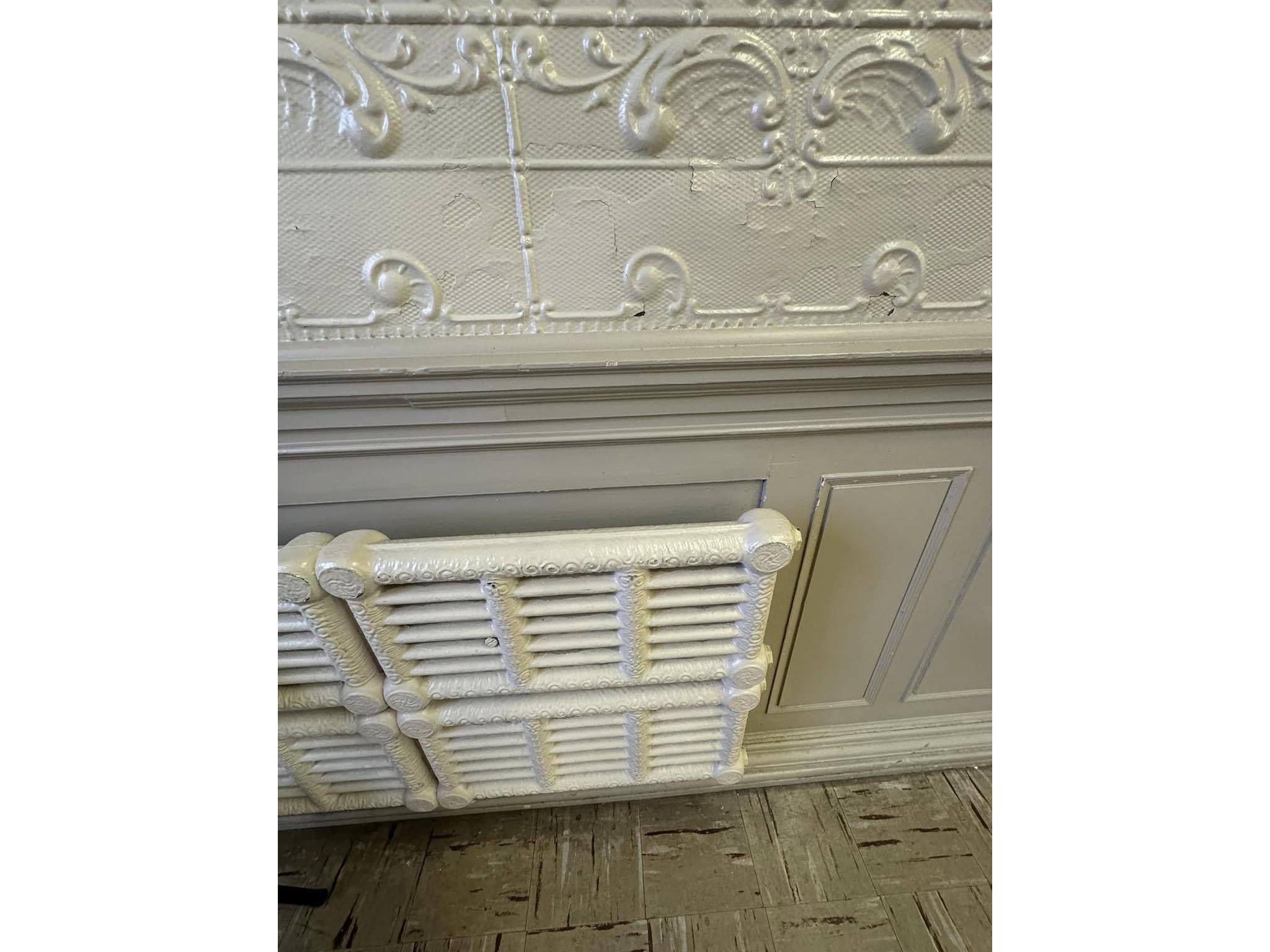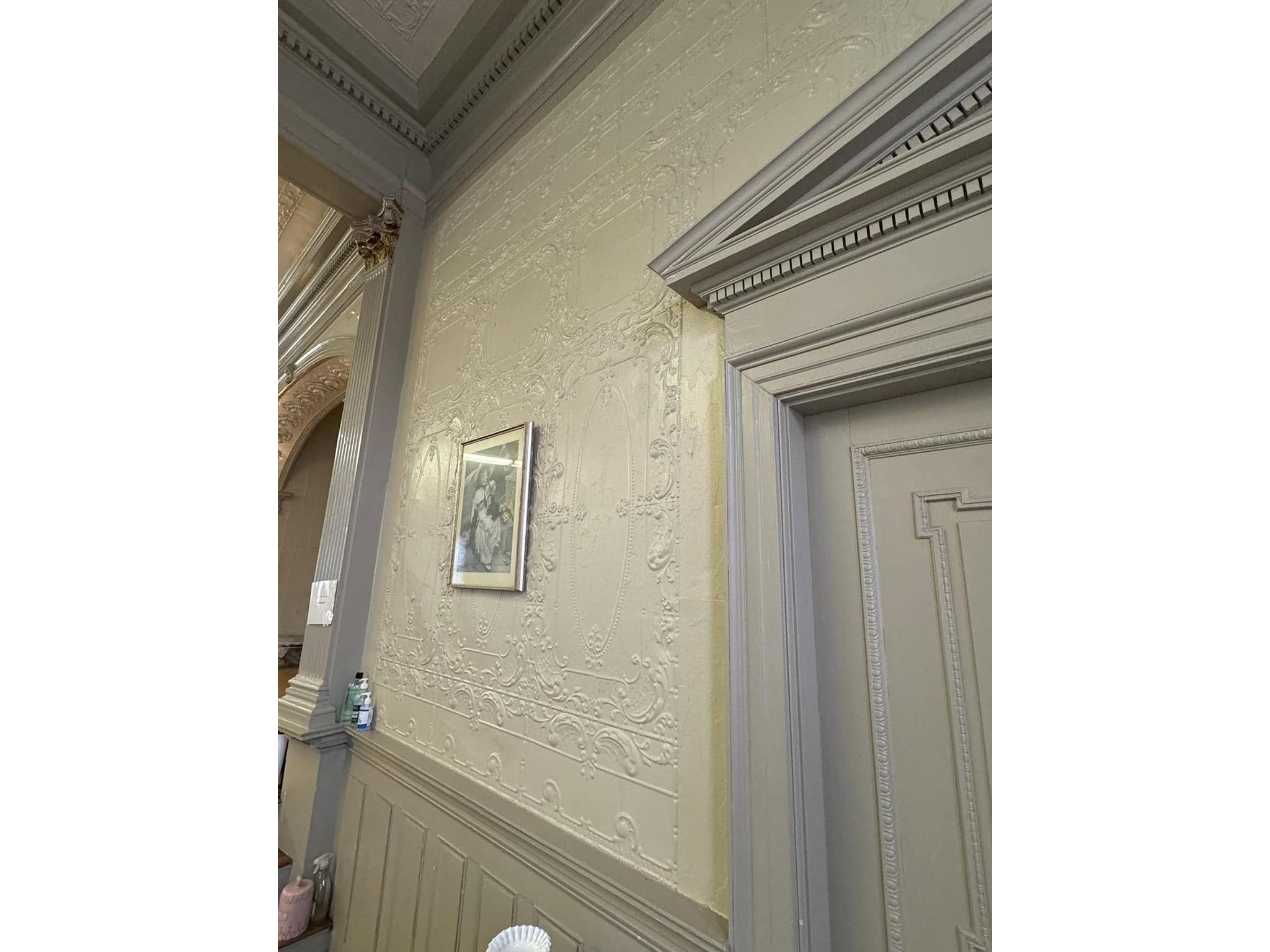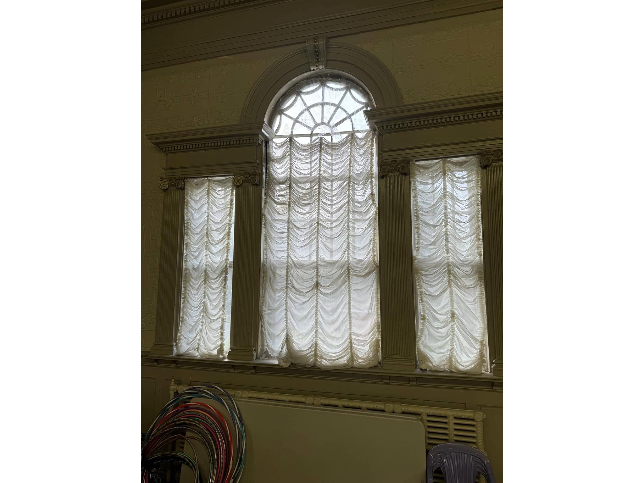 The colonial-style building is over a century old, built in 1896. The second floor holds a remarkable space. The Hall has an ornately decorated tin ceiling and walls, stunning windows, and ornate wood-carved features.