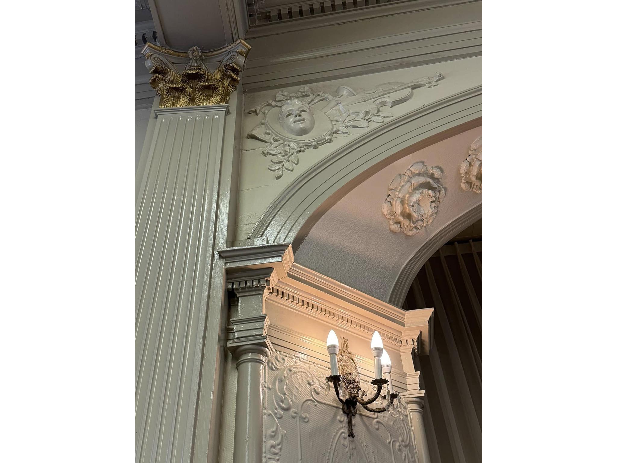 The elegant stage is a 15-foot semi-circle with magnificent molding over the arch including theater masks in the corners.
