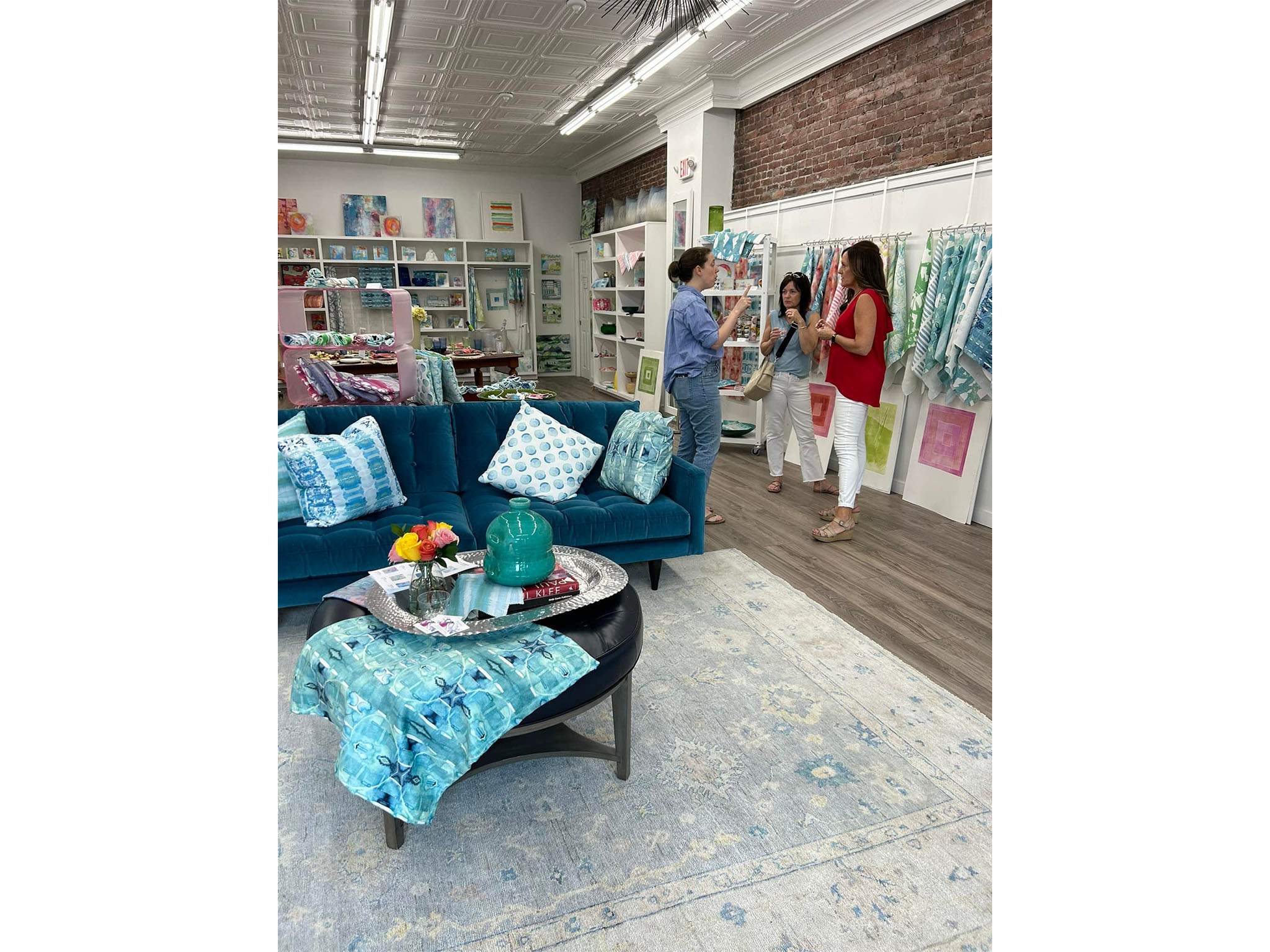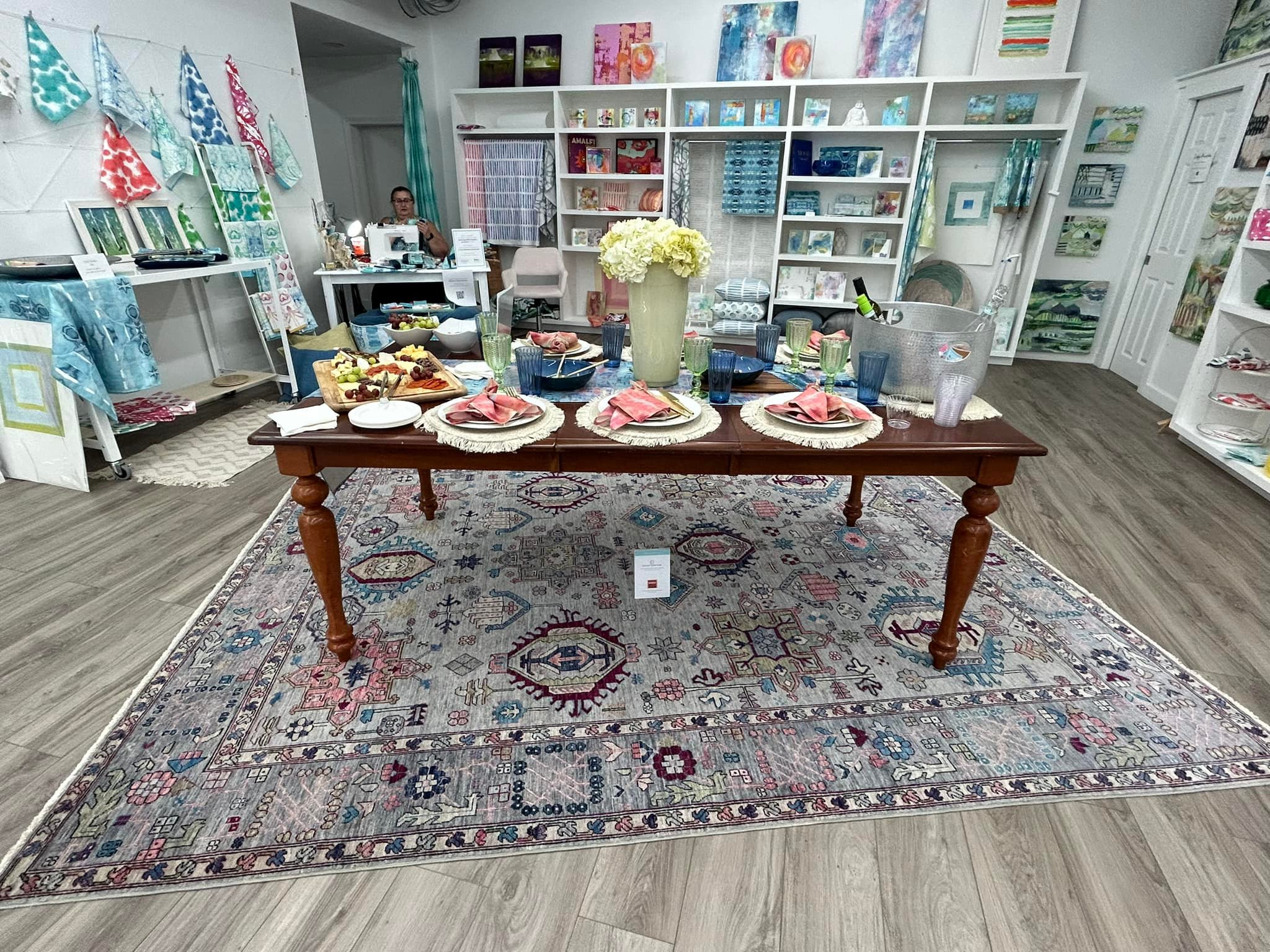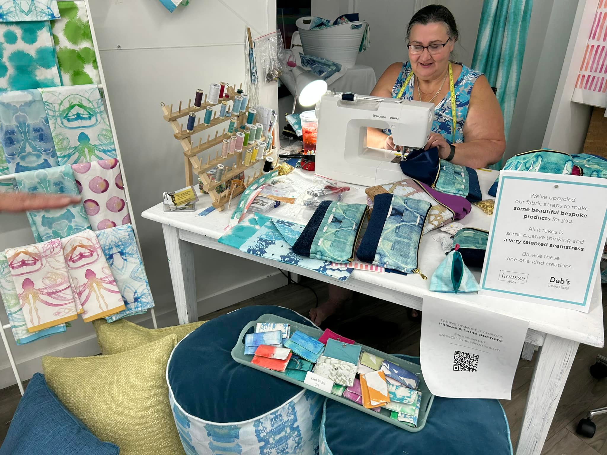 The fabrics she designs are used by customers and interior designers for drapes and upholstery. Her coworker, Deb Walz of Deb’s Sewing Table is in the back corner using the fabric to create beautiful bags, tea towels, wallets, and more. The items in the store are exceptionally well curated and have a range of price points.