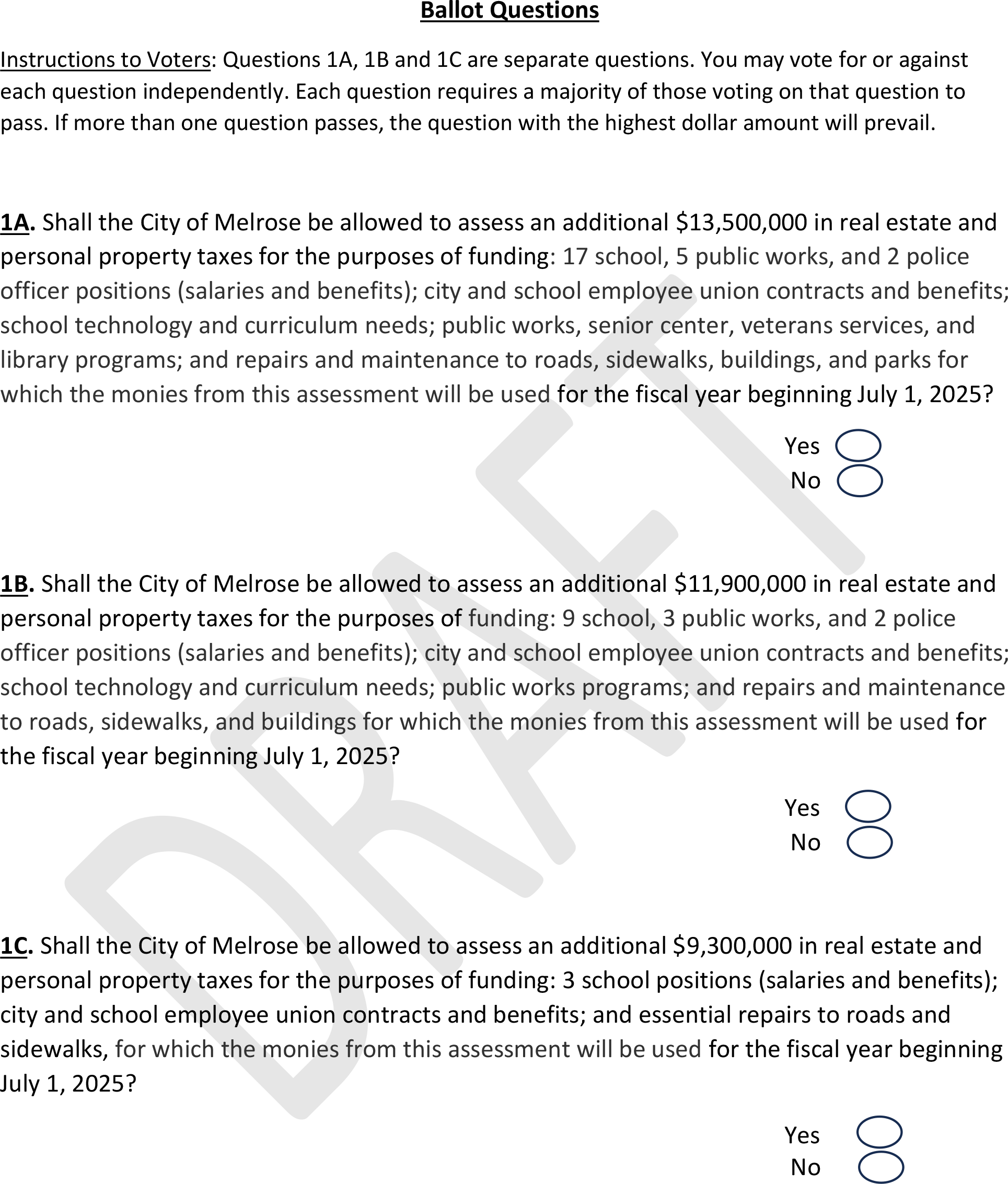 These three questions will be tiered - an unusual form of override question where voters can select from different override amounts, with the highest winning amount, if any, going into effect - and offer a potential override of $9.3 million, $11.9 million, or $13.5 million. All of the potential override amounts would stabilize city finances at next year's levels through 2029, and the higher levels could reverse some cuts to city services and the Melrose Public Schools (MPS).