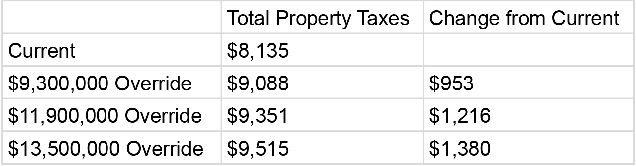 The impact of each override amount on property taxes for a home assessed at $821,716 (the average home value in Melrose)