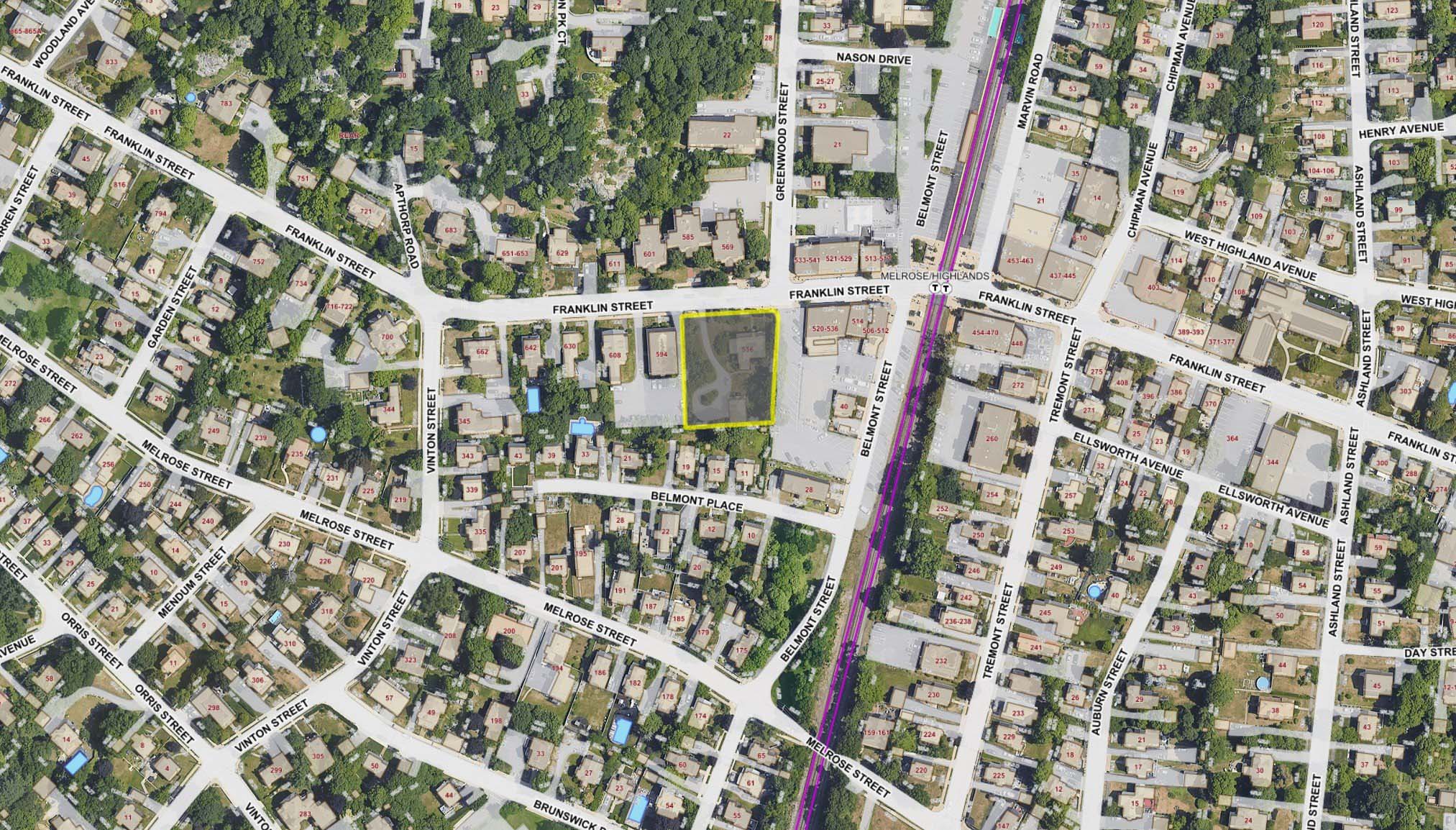 Aerial view of the surrounding area surrounding, with 554-556 Franklin Street highlighted in yellow