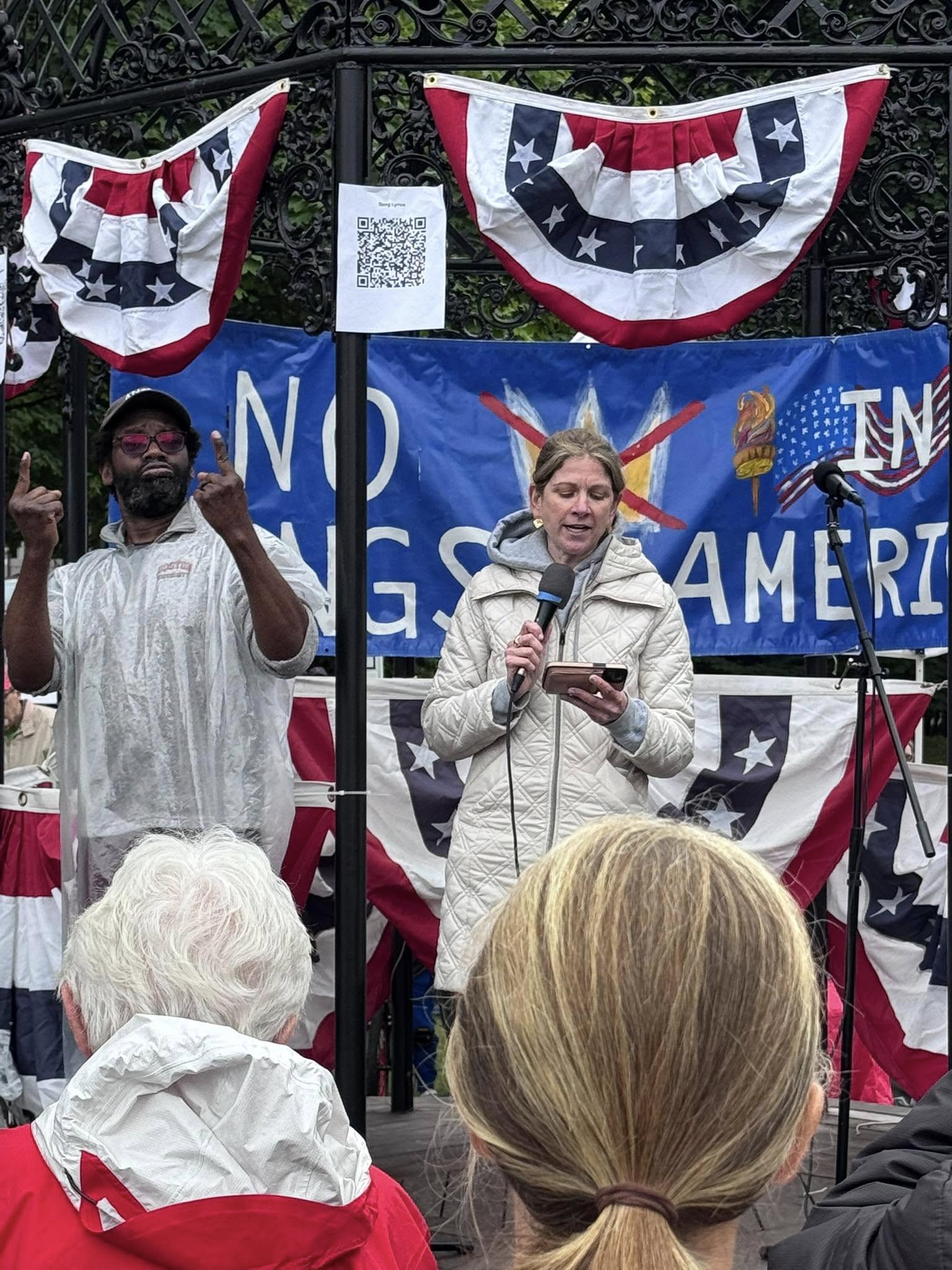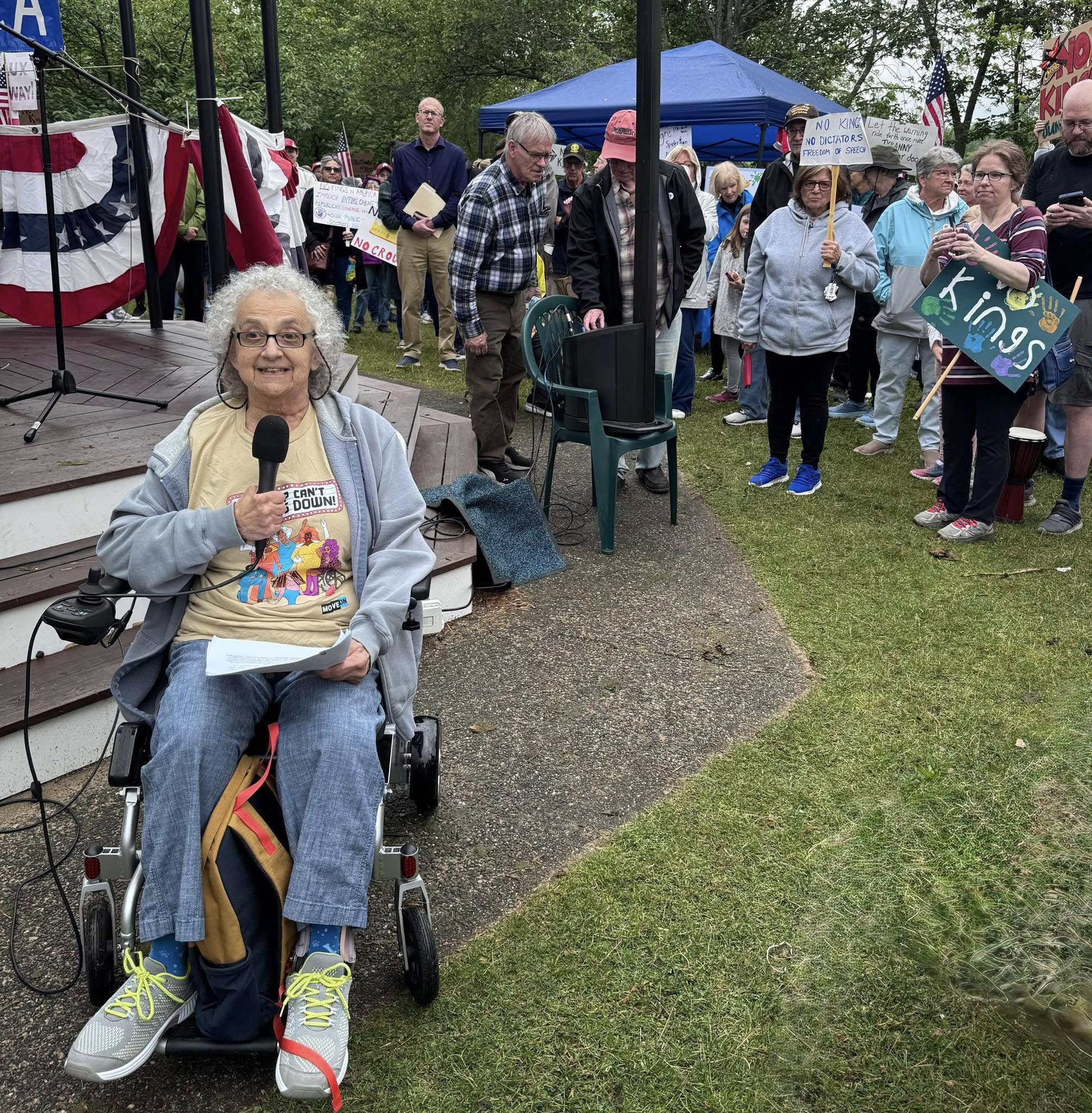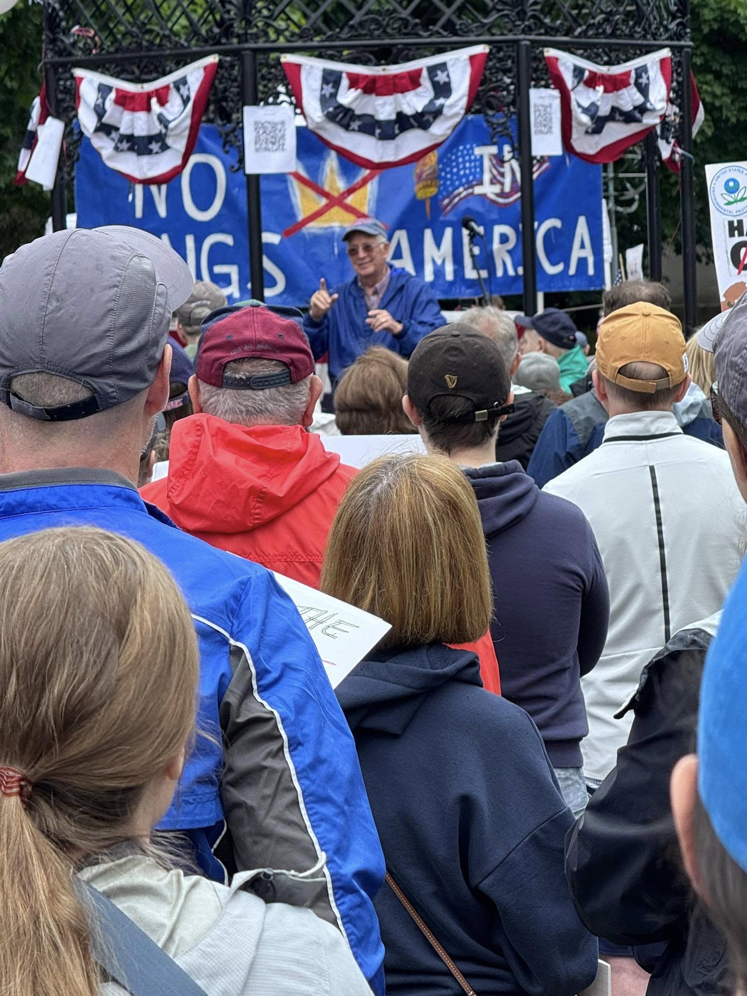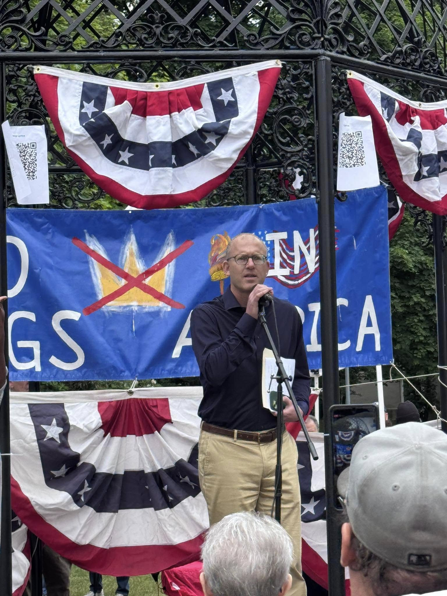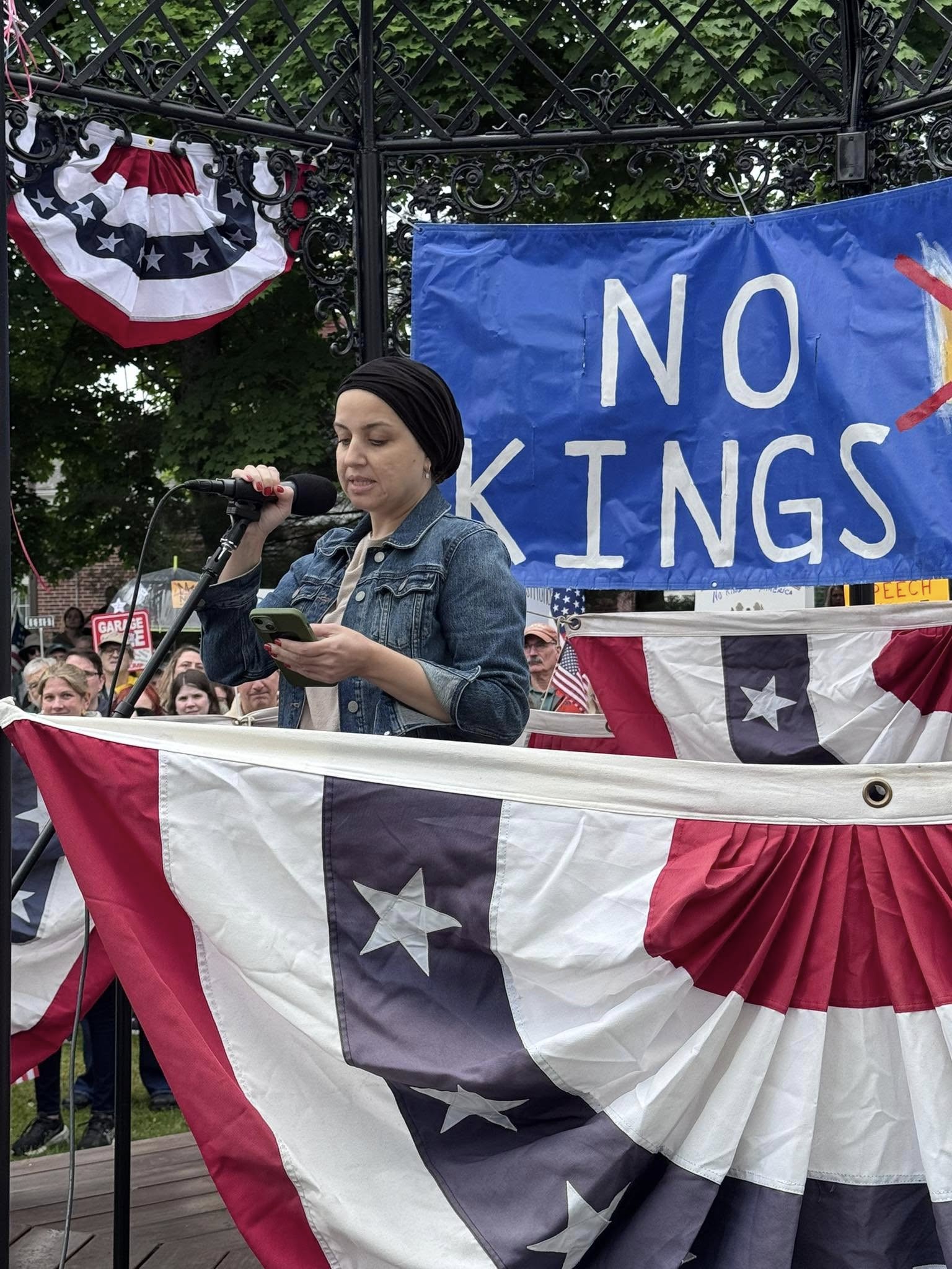The next speaker was Sam Stella, a veteran from Wakefield, who drew a parallel between the current administration and totalitarian regimes in countries like Russia. “That can happen here in a heartbeat,” he said. “If we don’t speak up,” he went on, “we’re going to lose our rights.”