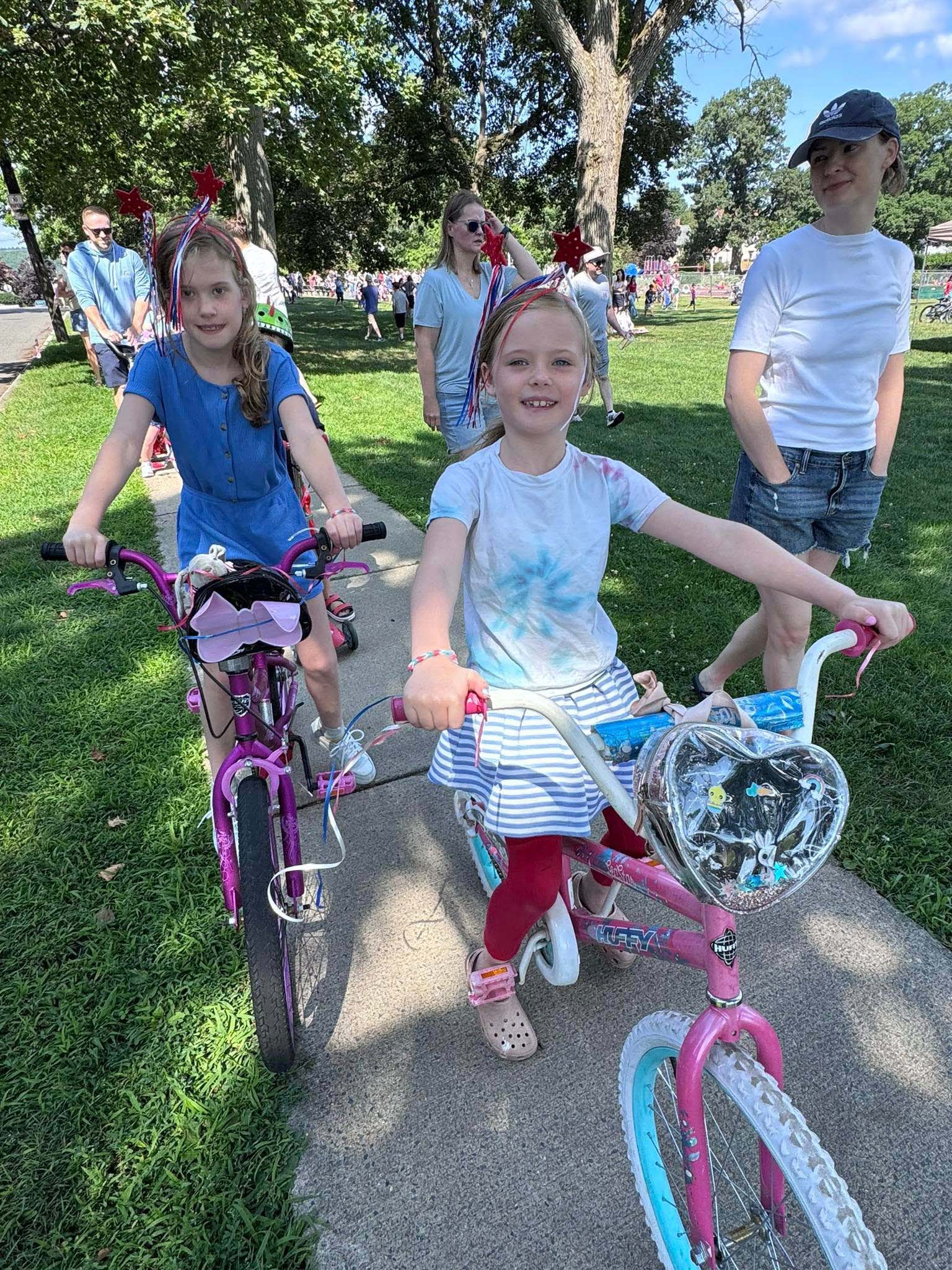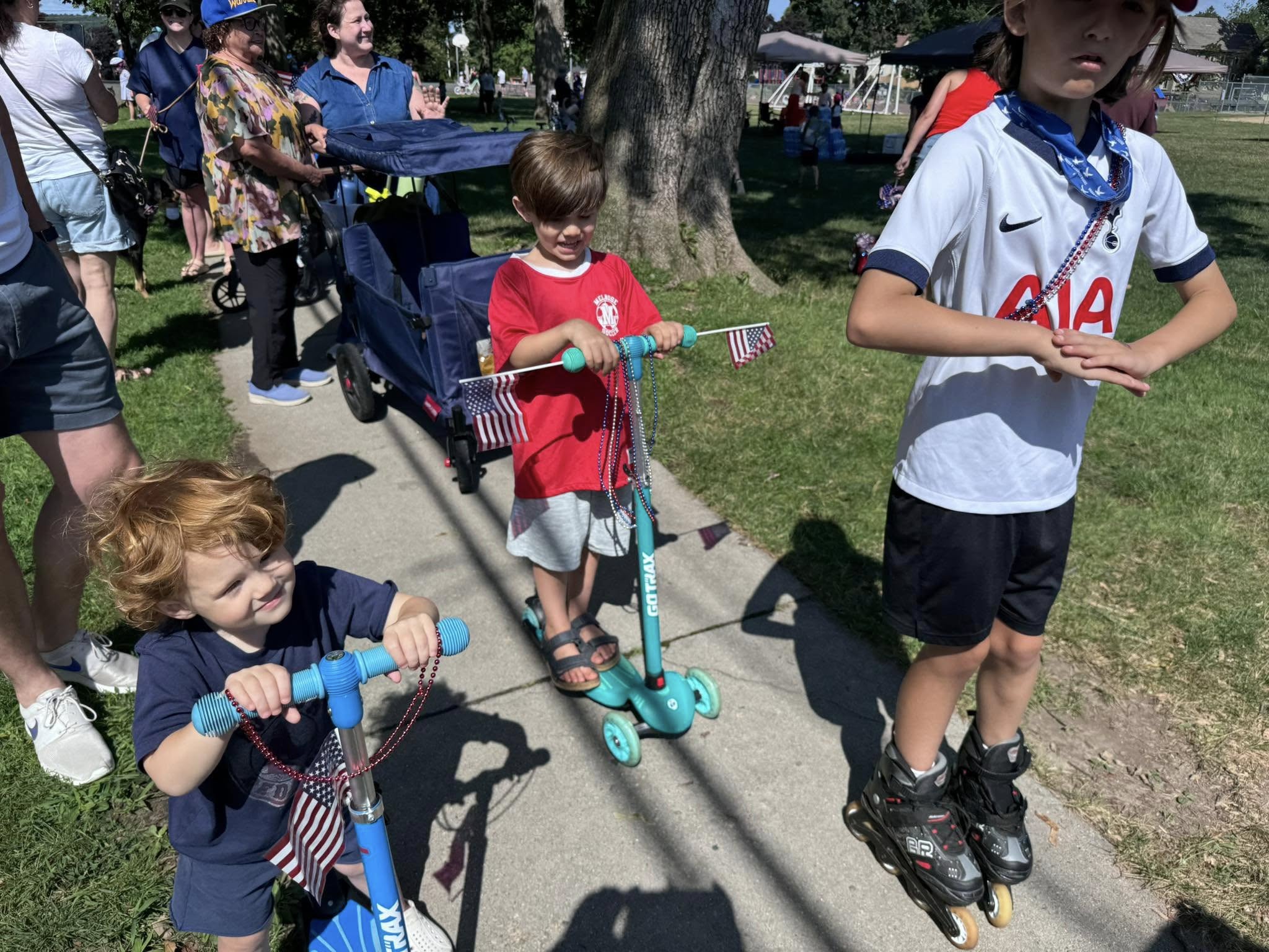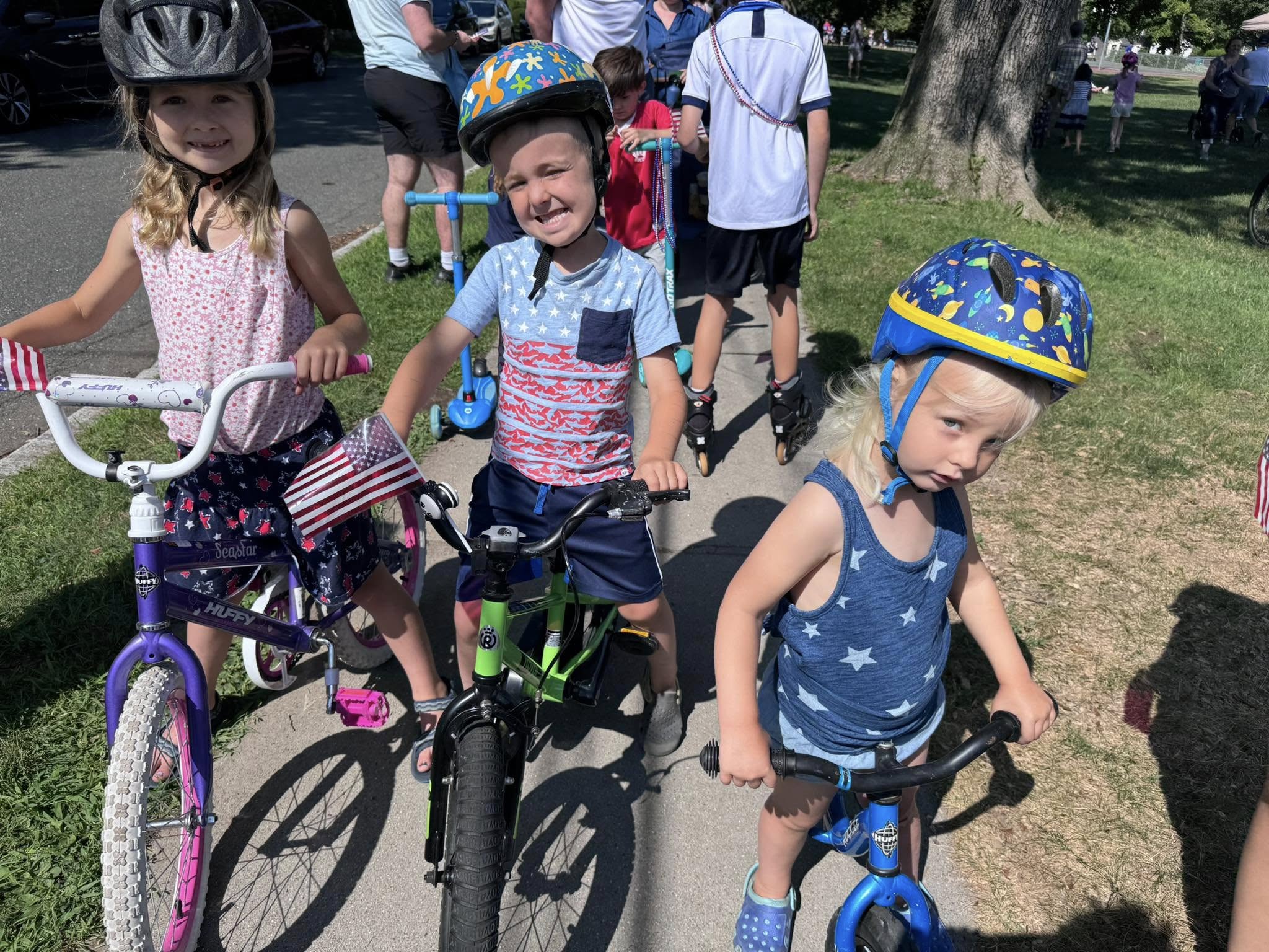 At the Bike and Carriage Parade, families decorated strollers, wagons, bikes, and scooters with flags, streamers, ribbons, and other materials. They paraded around the Melrose Common and then enjoyed ice pops from Seven Mile Road Church, bubbles and a giant parachute from the Melrose Department of Recreation, temporary tattoos from State Representative Kate Lipper Garabedian, and playing with one another on the fields and playground.
