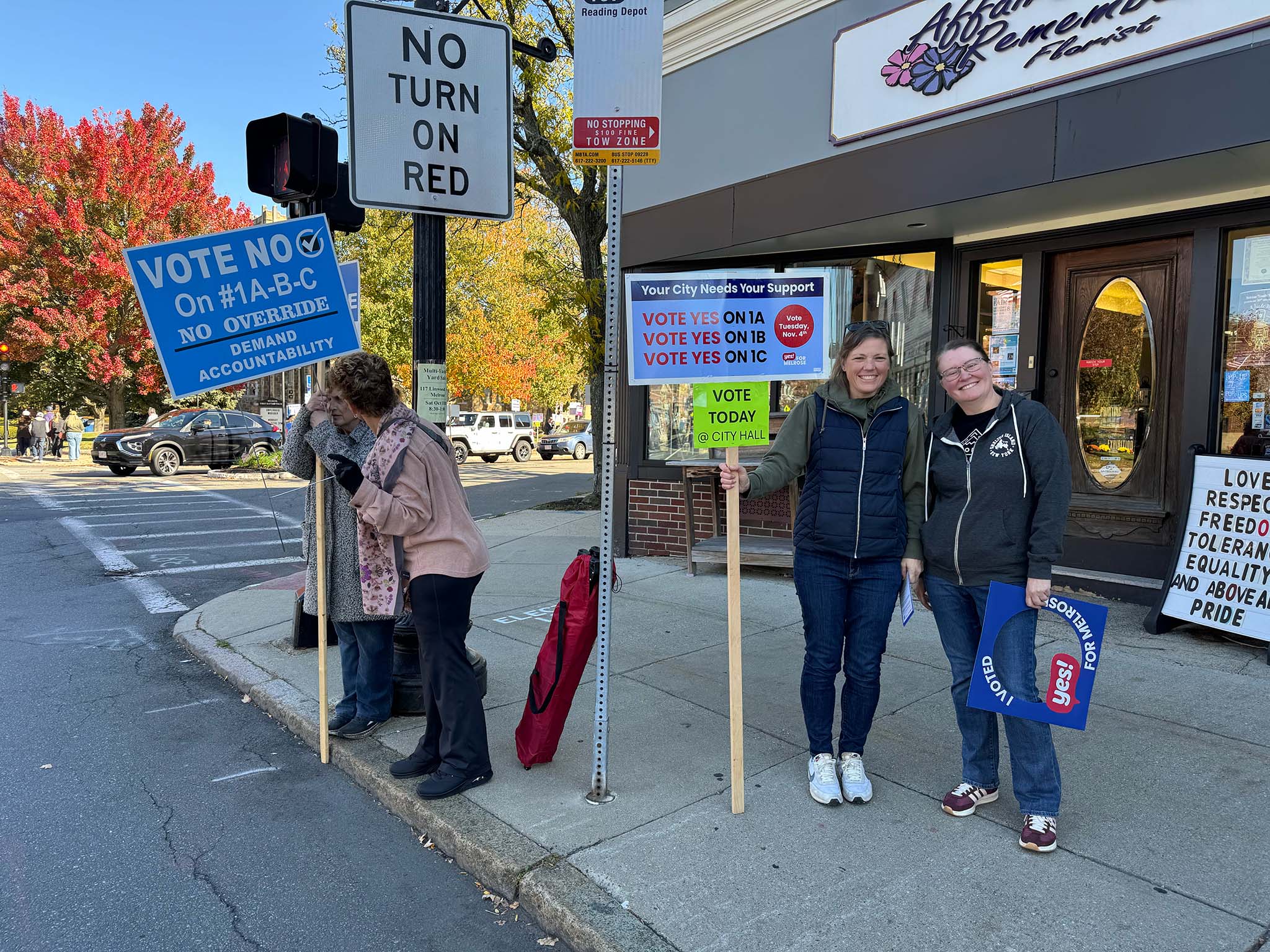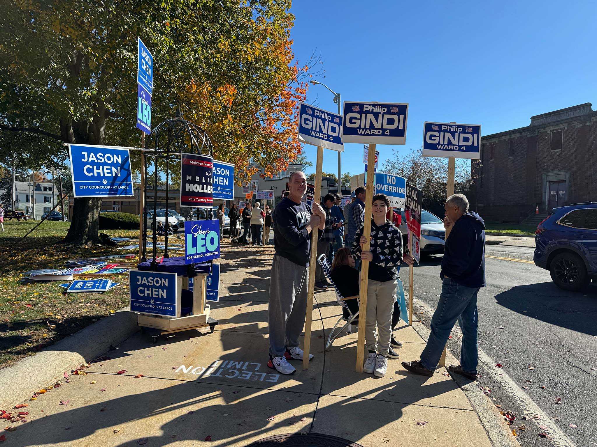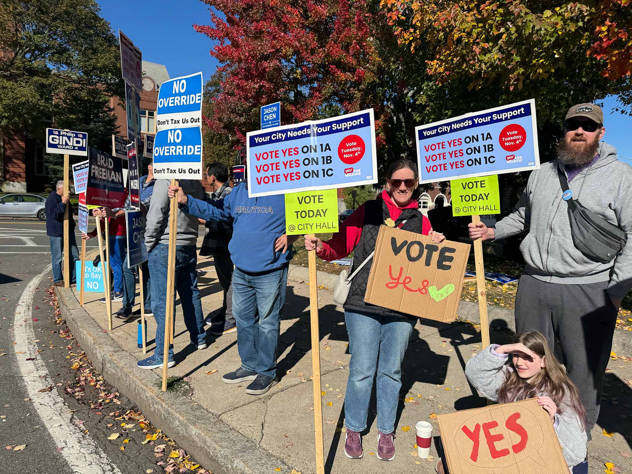 We spotted a number of candidates out holding signs: Ryan Williams, Devin Romanul, and Kim Vandiver stood on one corner; Alex Rodriguez on another; and Elizabeth Kowal, Brad Freeman, and Philip Gindi on the third corner, along with former mayor Gail Infurna and representatives of both the 'Yes' and 'No' override campaigns. (We also heard that other public figures, including Mayor Jen Grigoraitis, were out at other points during the day.)