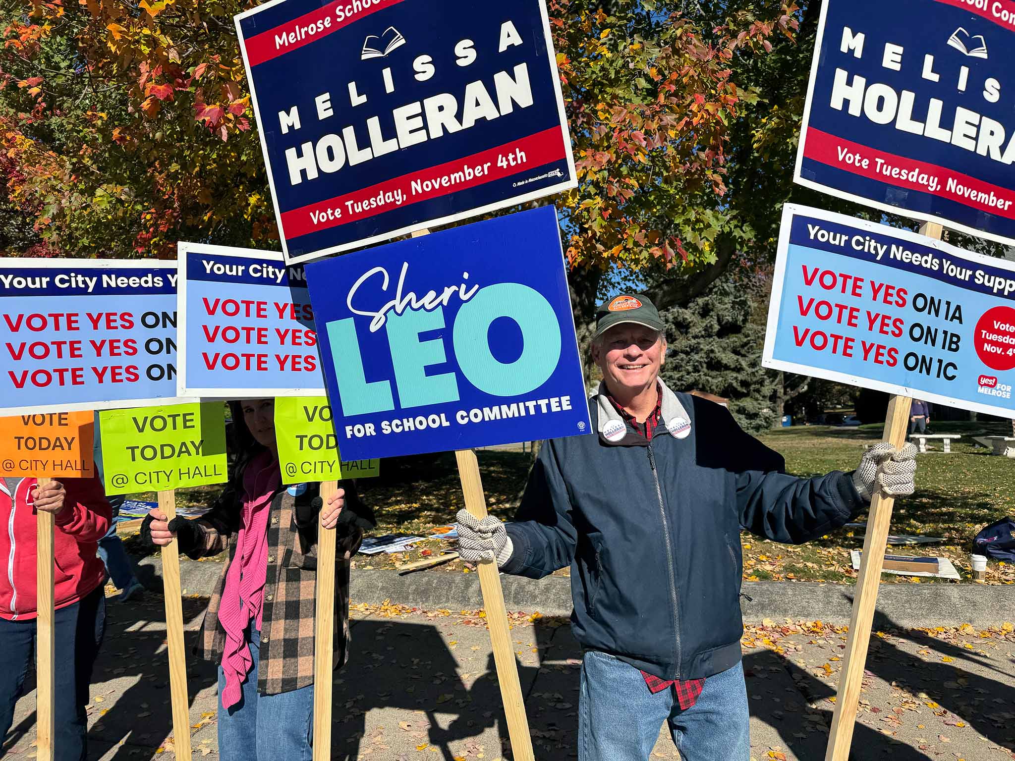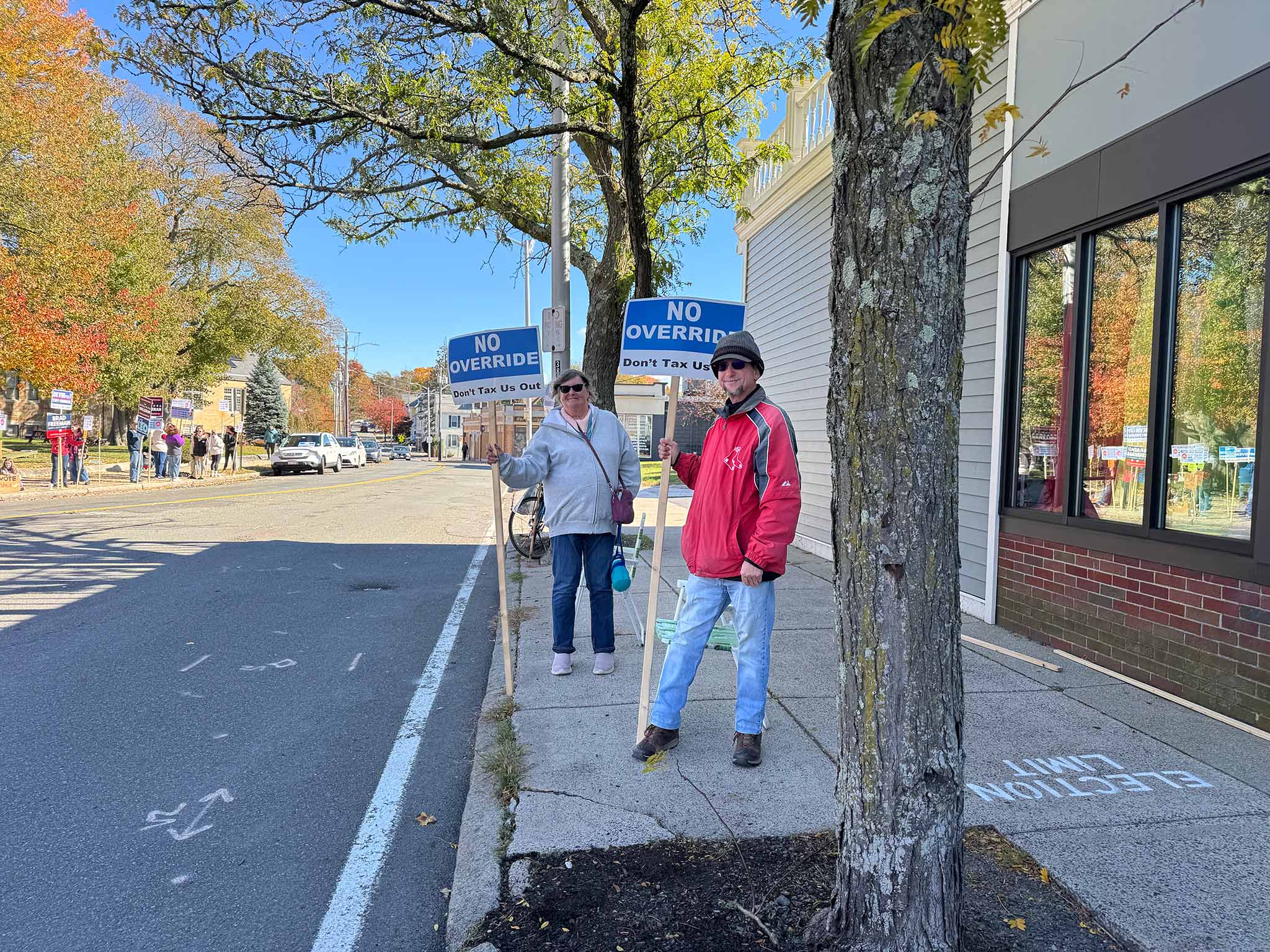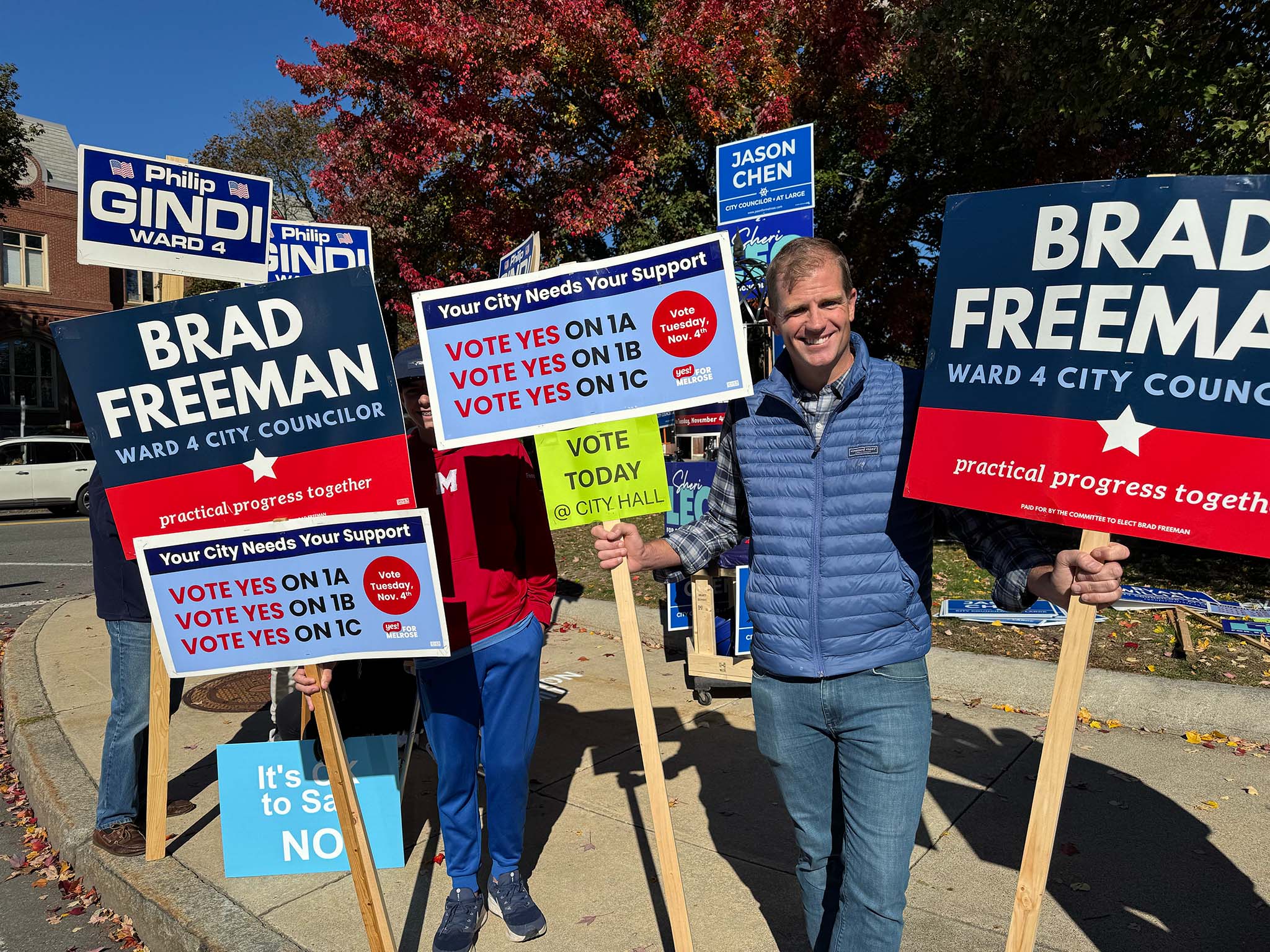 We spotted a number of candidates out holding signs: Ryan Williams, Devin Romanul, and Kim Vandiver stood on one corner; Alex Rodriguez on another; and Elizabeth Kowal, Brad Freeman, and Philip Gindi on the third corner, along with former mayor Gail Infurna and representatives of both the 'Yes' and 'No' override campaigns. (We also heard that other public figures, including Mayor Jen Grigoraitis, were out at other points during the day.)