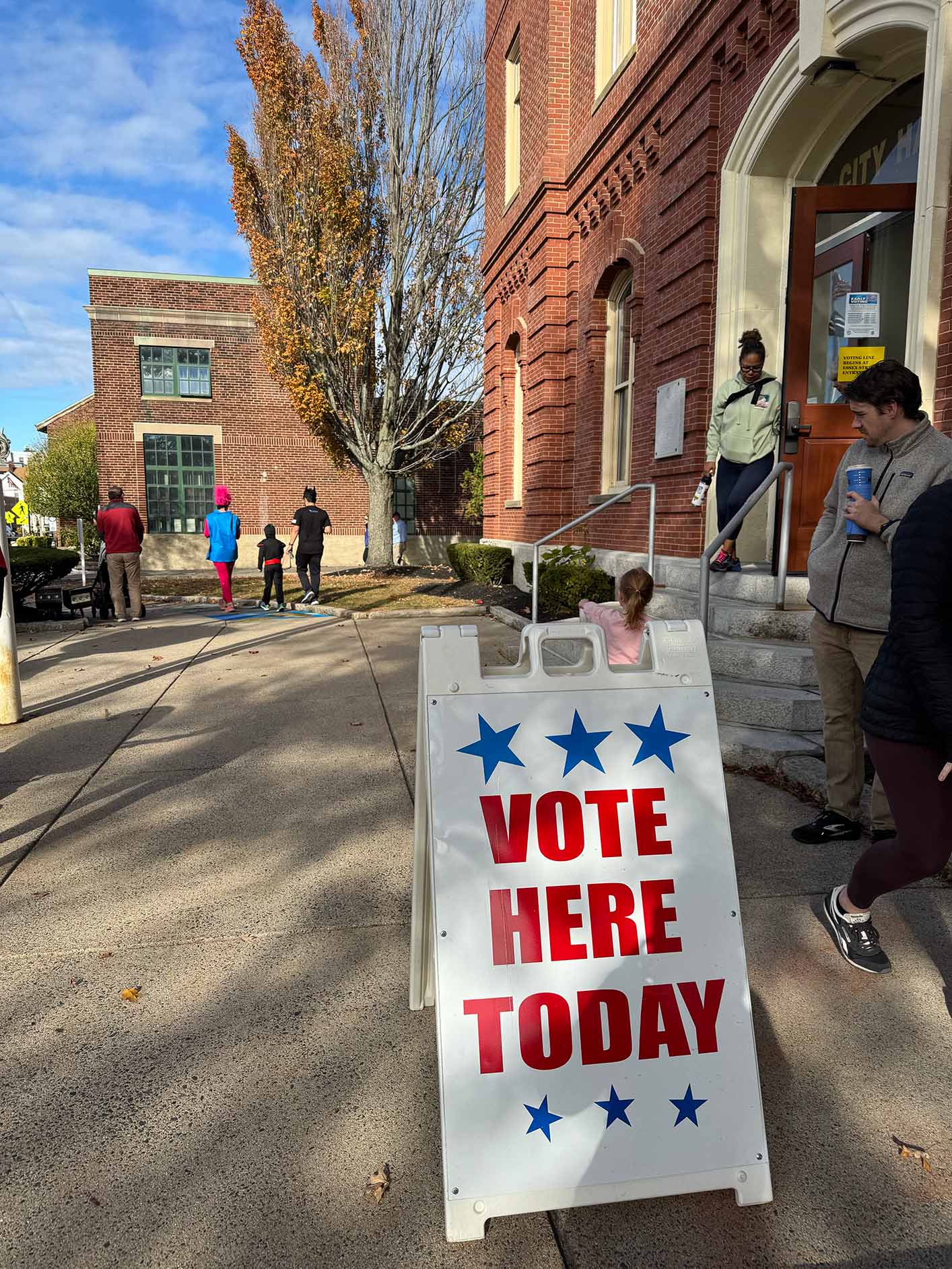 On Saturday morning, early voting for the municipal election kicked off at City Hall with a festive atmosphere. Supporters of candidates and both override campaigns lined the street corners around City Hall, and many voters (us included!) came straight from the Spooky Sprint, still wearing their Halloween costumes.