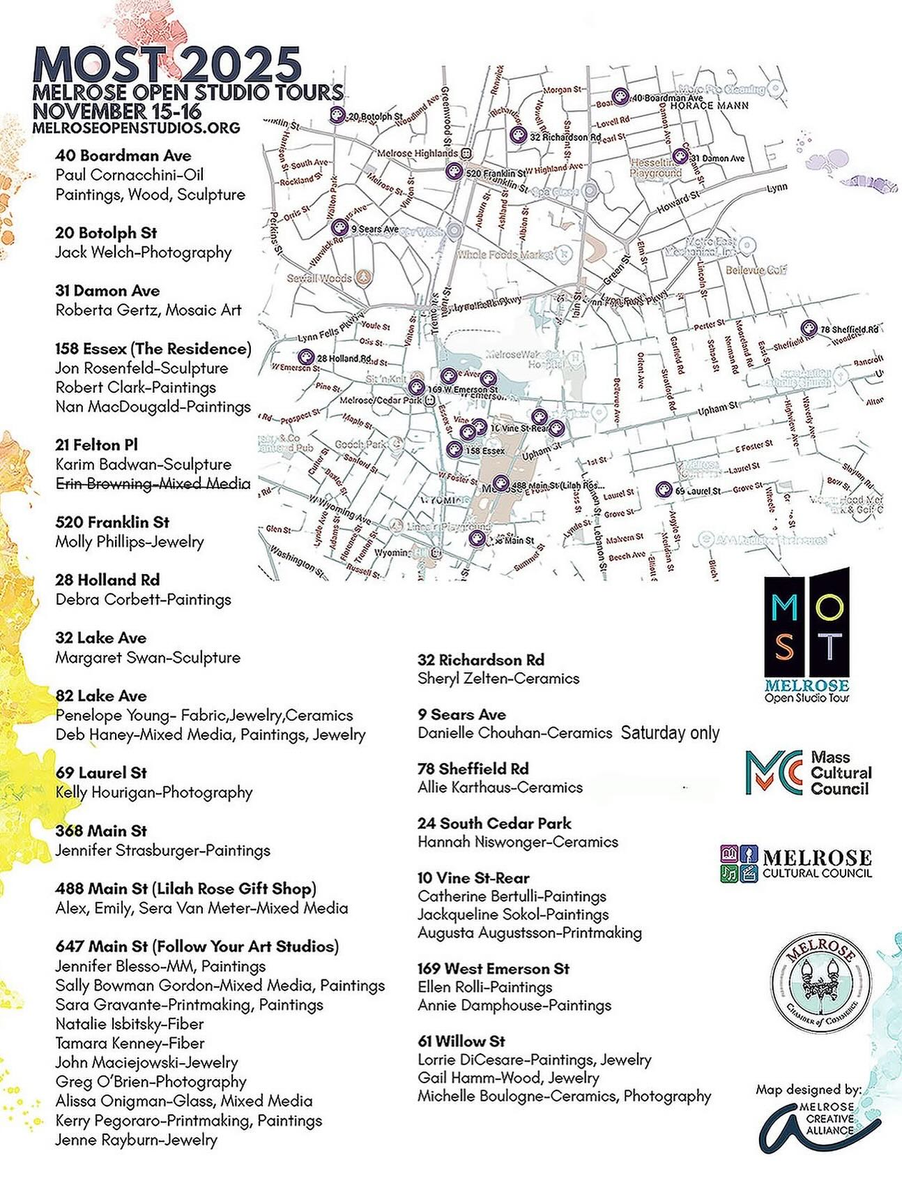 MOST is an offshoot of Melrose Arts, which runs the annual Melrose Arts Festival in the spring. It started in 2017 with 27 participating artists; now running for the 9th year, it has grown to nearly 40 artists.