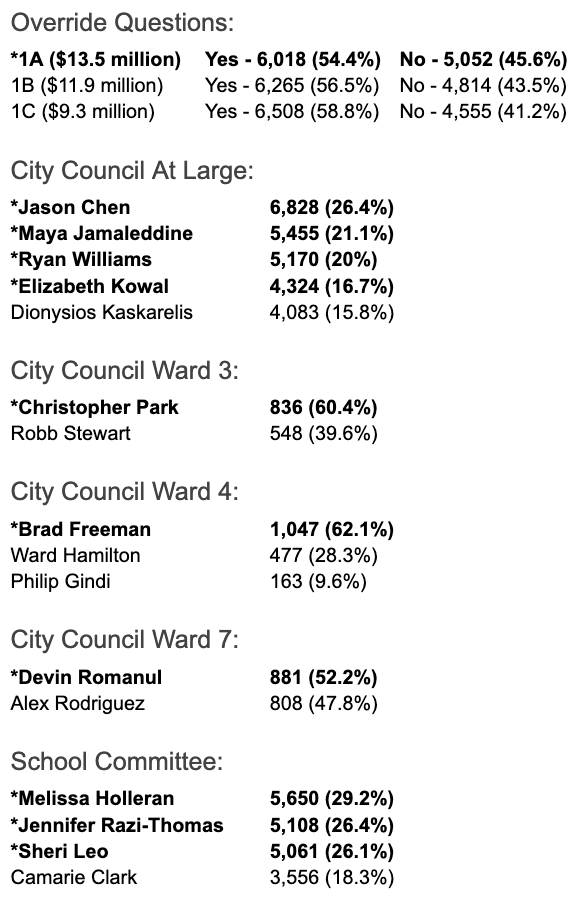 Melrose voters came out in overwhelming numbers on Tuesday (and in early and mail-in voting beforehand) to vote on three override questions and for representatives on the City Council and the School Committee.