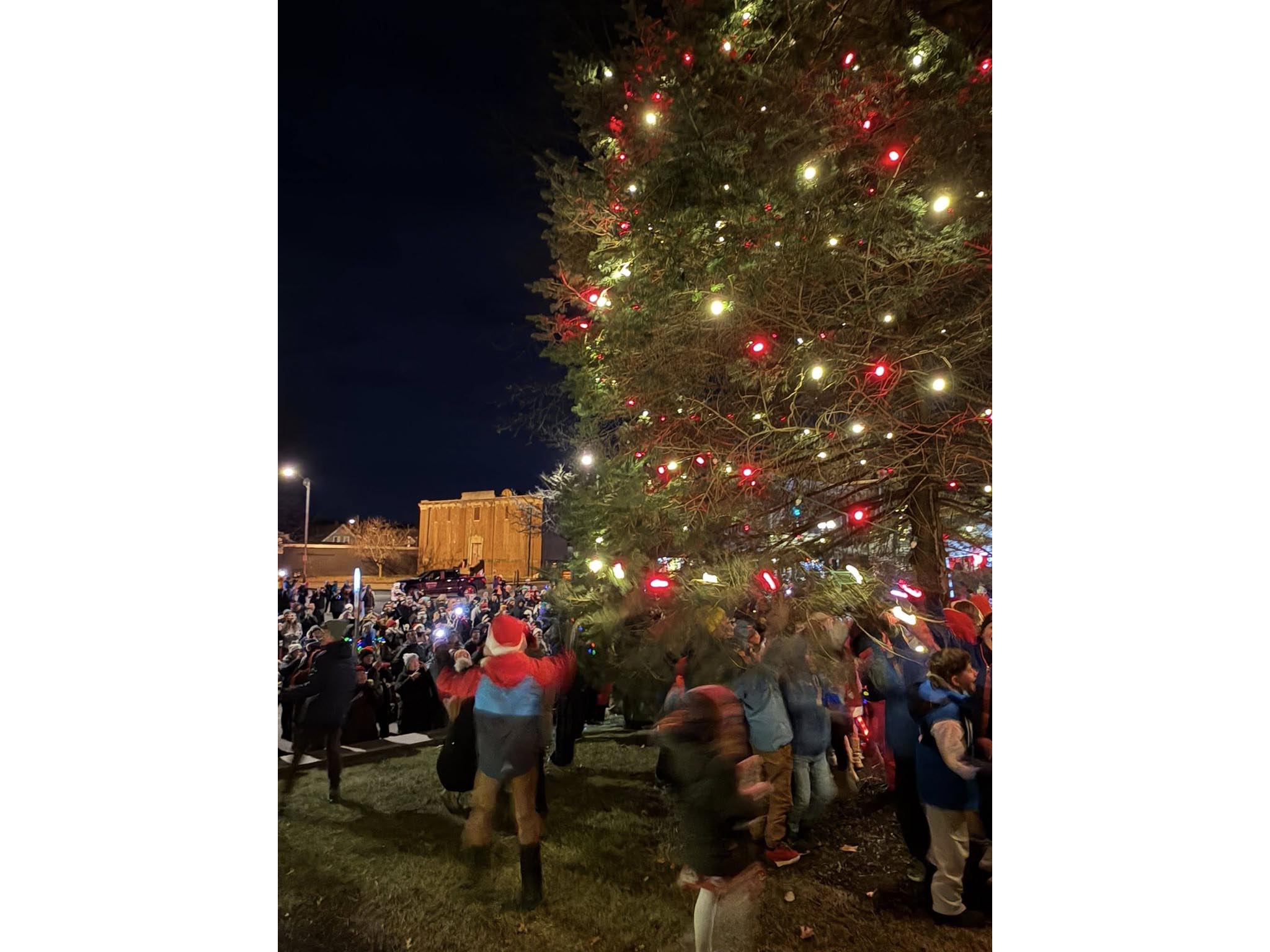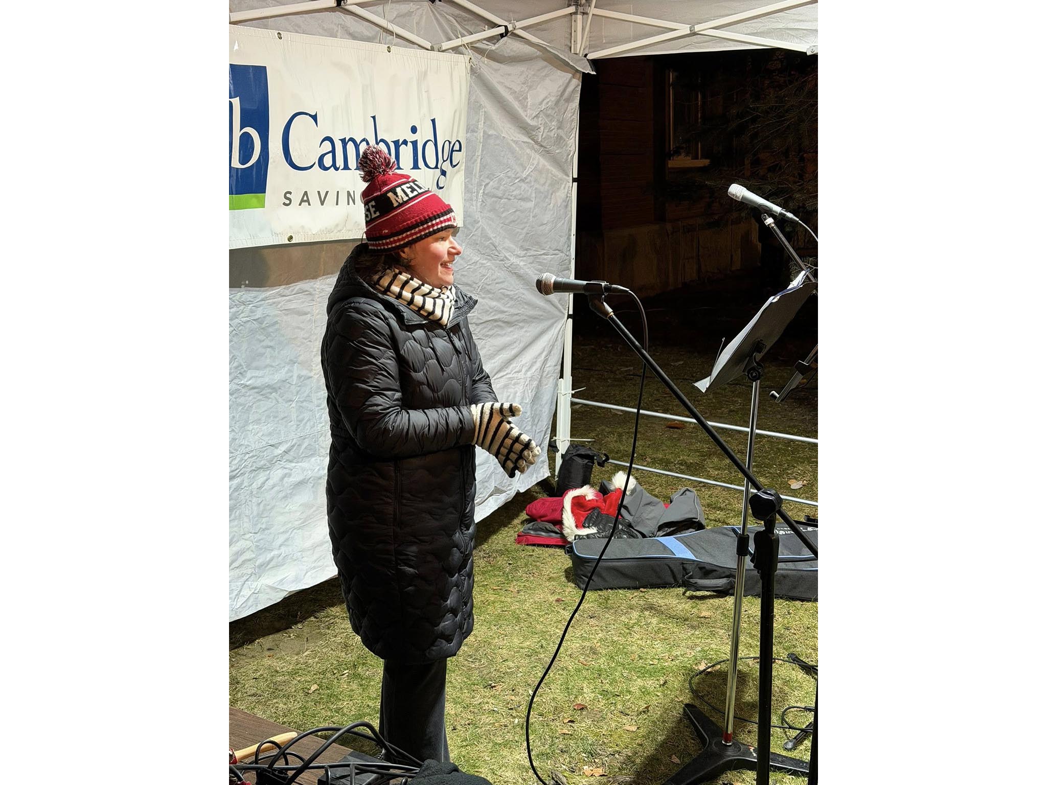 Mayor Jen Grigoraitis announcing the Christmas tree lighting in front of City Hall on Friday evening