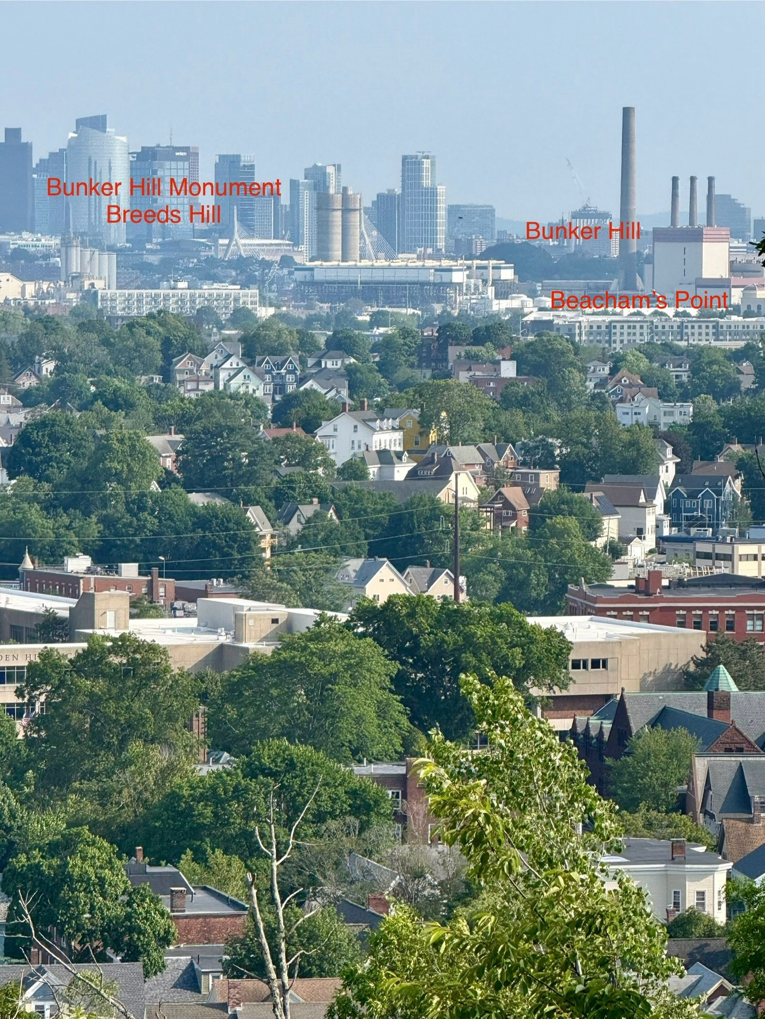 The view today from Waitt’s Mount looking toward Charlestown, and the same view from Waitt's Mount 125 years ago showing a much clearer sight line across the Mystic River.