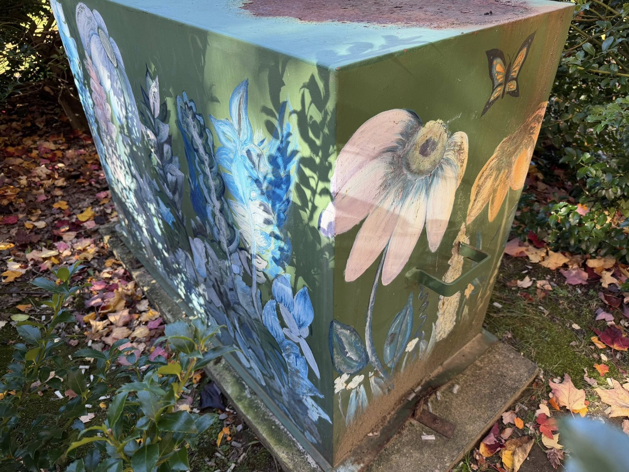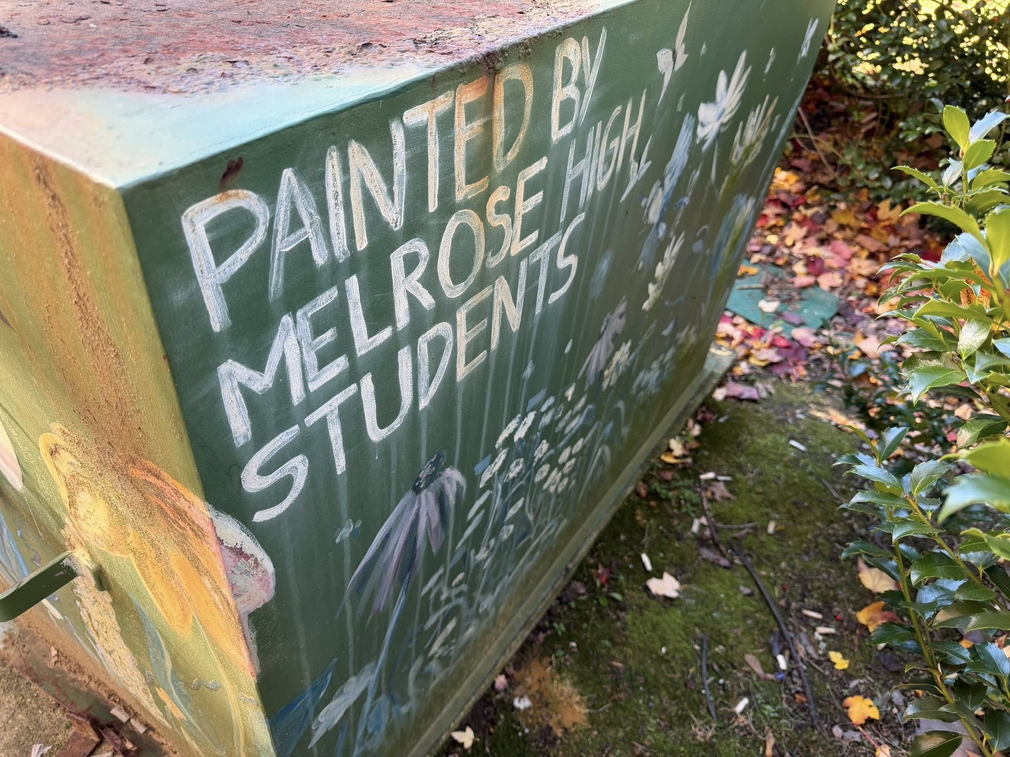 While little is known about its history, the side is signed "Painted by Melrose High Students," hinting at a student-created project that has quietly brightened this corner of the city.
