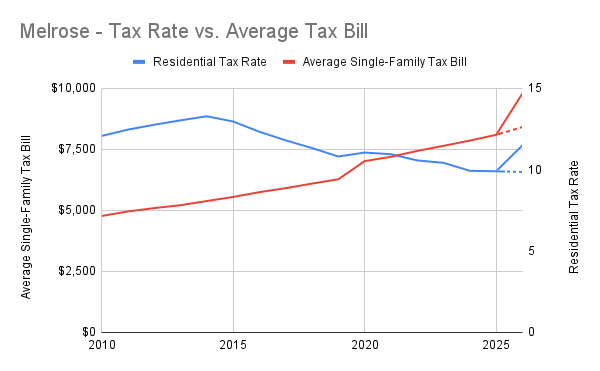 Tax rate vs. average tax bill for Melrose residents, 2010 to present