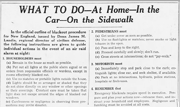 Melrose held its first blackout test on Tuesday, March 10, 1942, from 10 to 10:15 pm. The role of air raid wardens was to prevent panic and ensure that all home and apartment lights were extinguished as quickly as possible. All vehicles were to stop, pull to the side, and extinguish their lights; no smoking or lighting of matches outdoors was permitted. Streetlights were turned off. Planes would fly overhead to create the effect of an air raid. The blackout test was a great success.