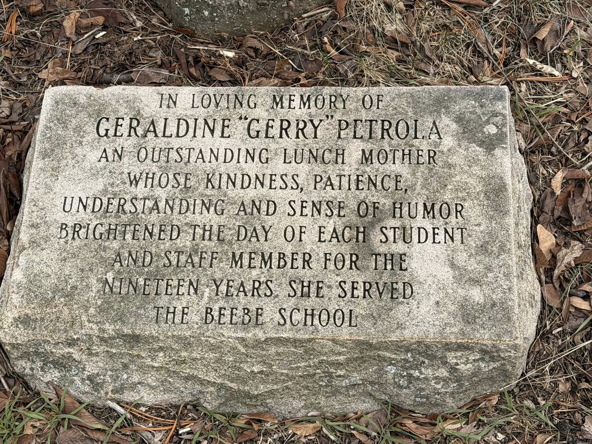 It reads: “In loving memory of Geraldine ‘Gerry’ Petrola, an outstanding lunch mother whose kindness, patience, understanding, and sense of humor brightened the day of each student and staff member for the nineteen years she served the Beebe School.”